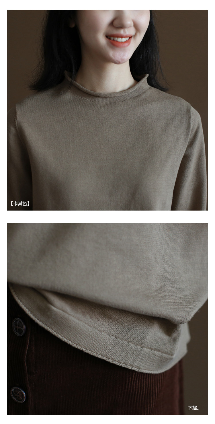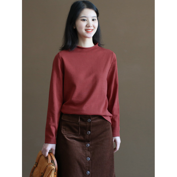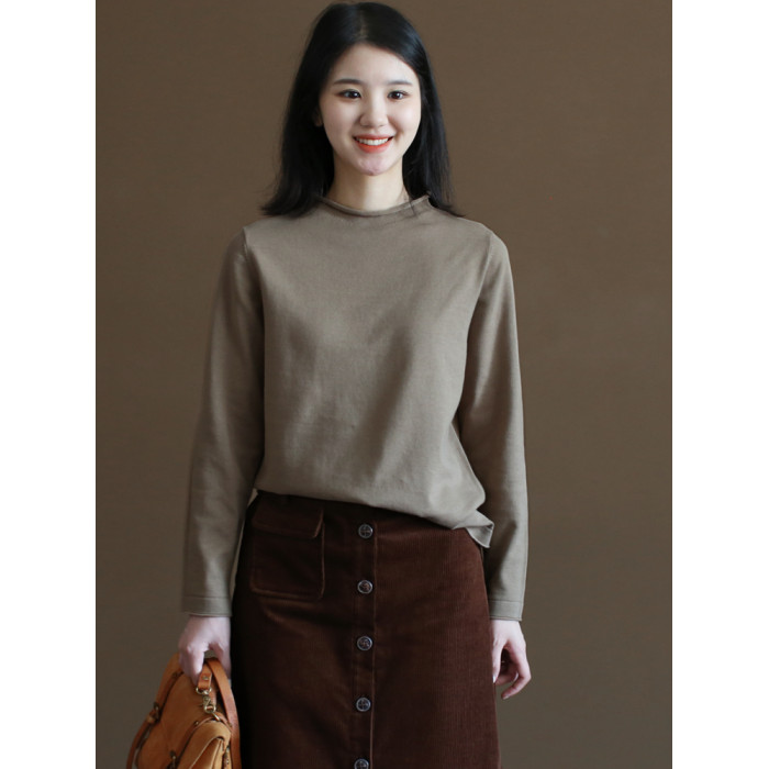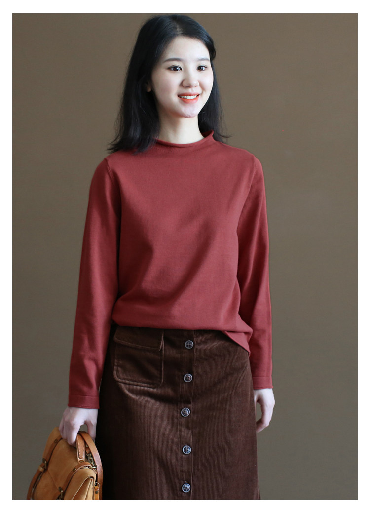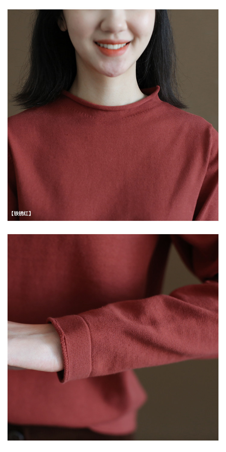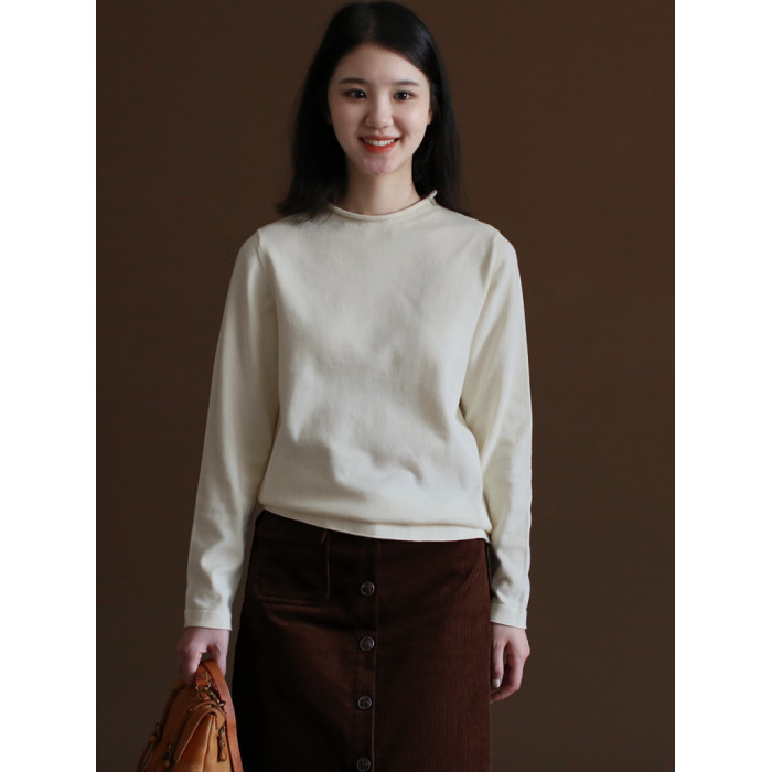 三五年Y480森系純棉線針織打底衫春秋純色圓領長袖打底套頭女上衣