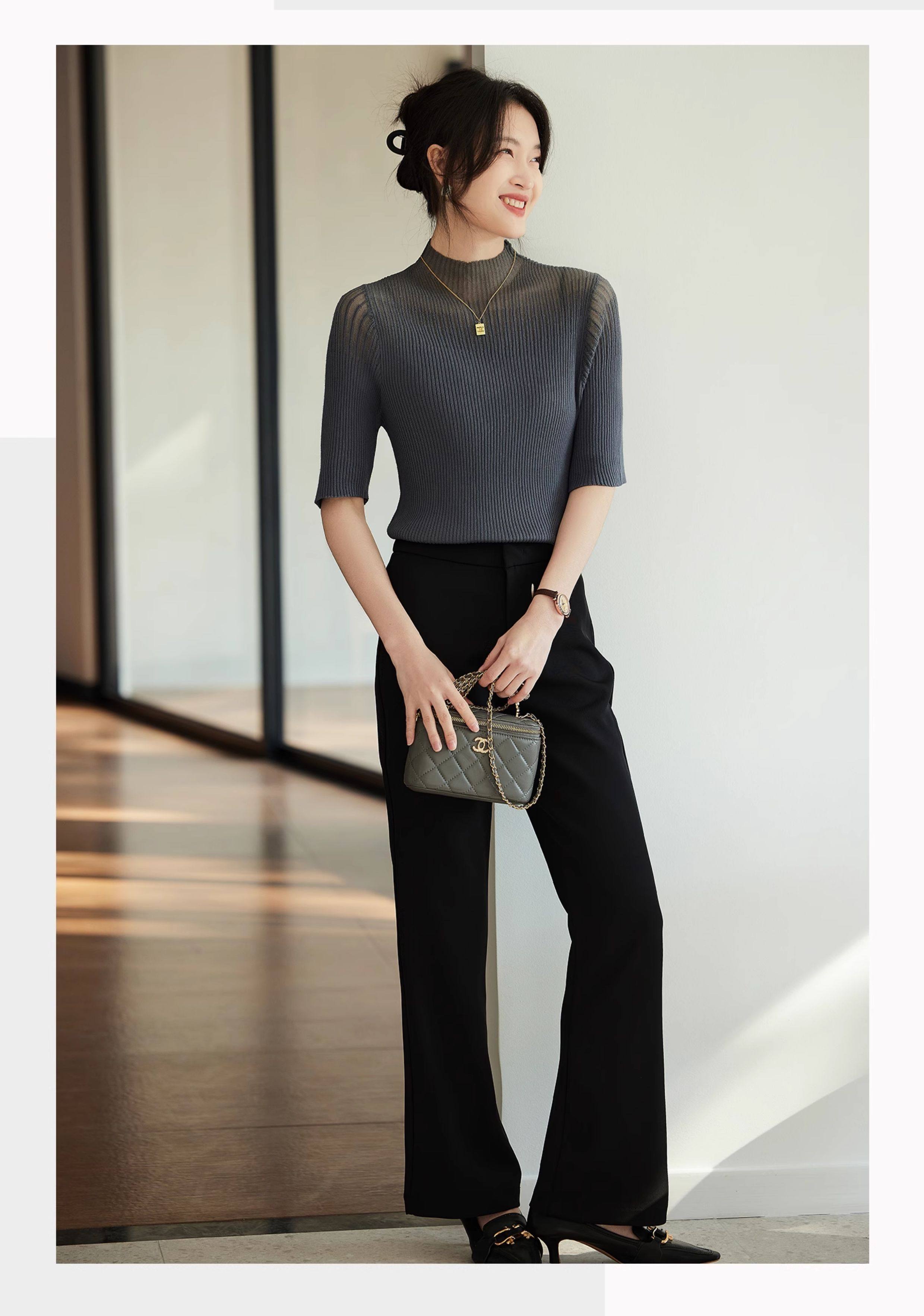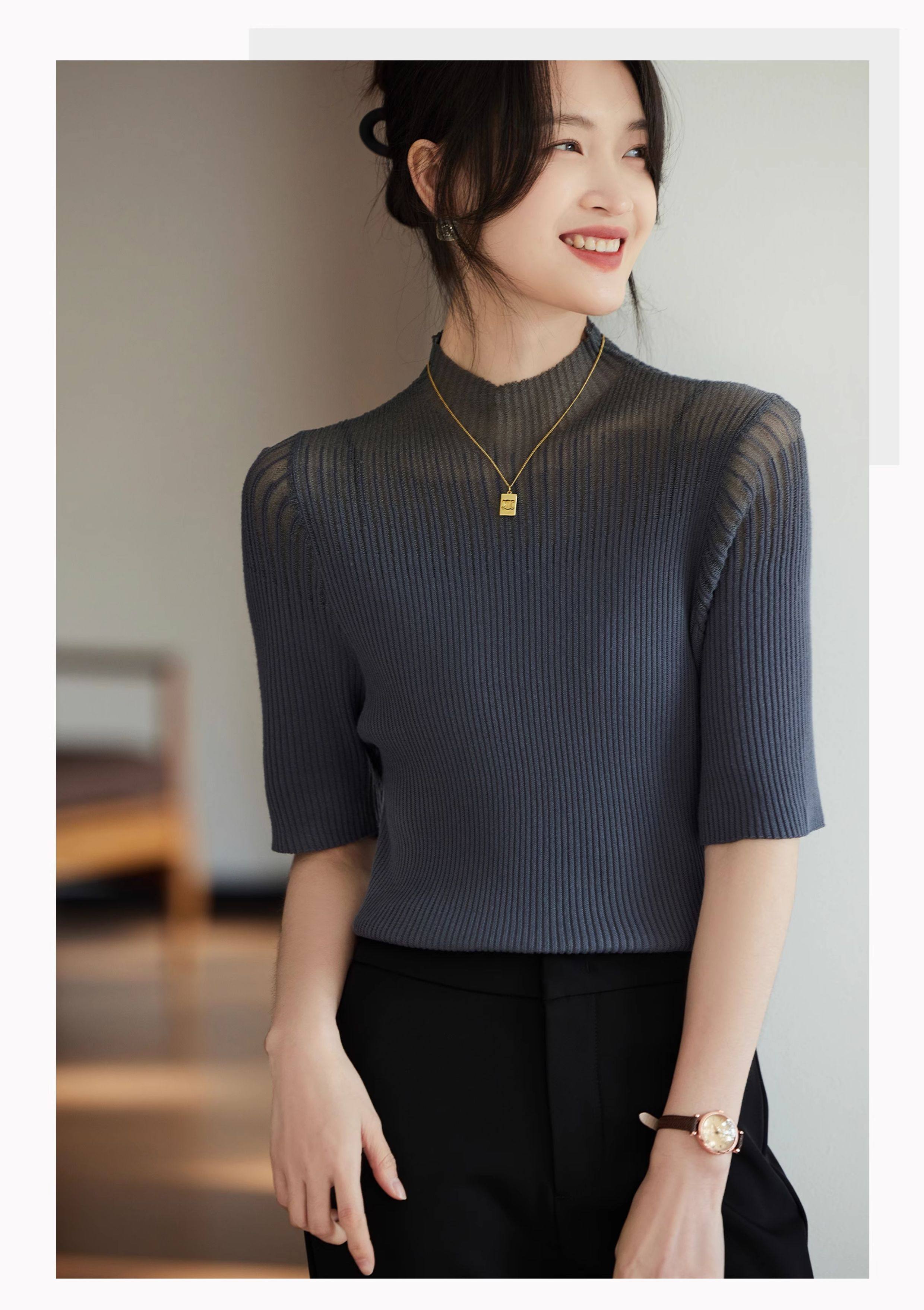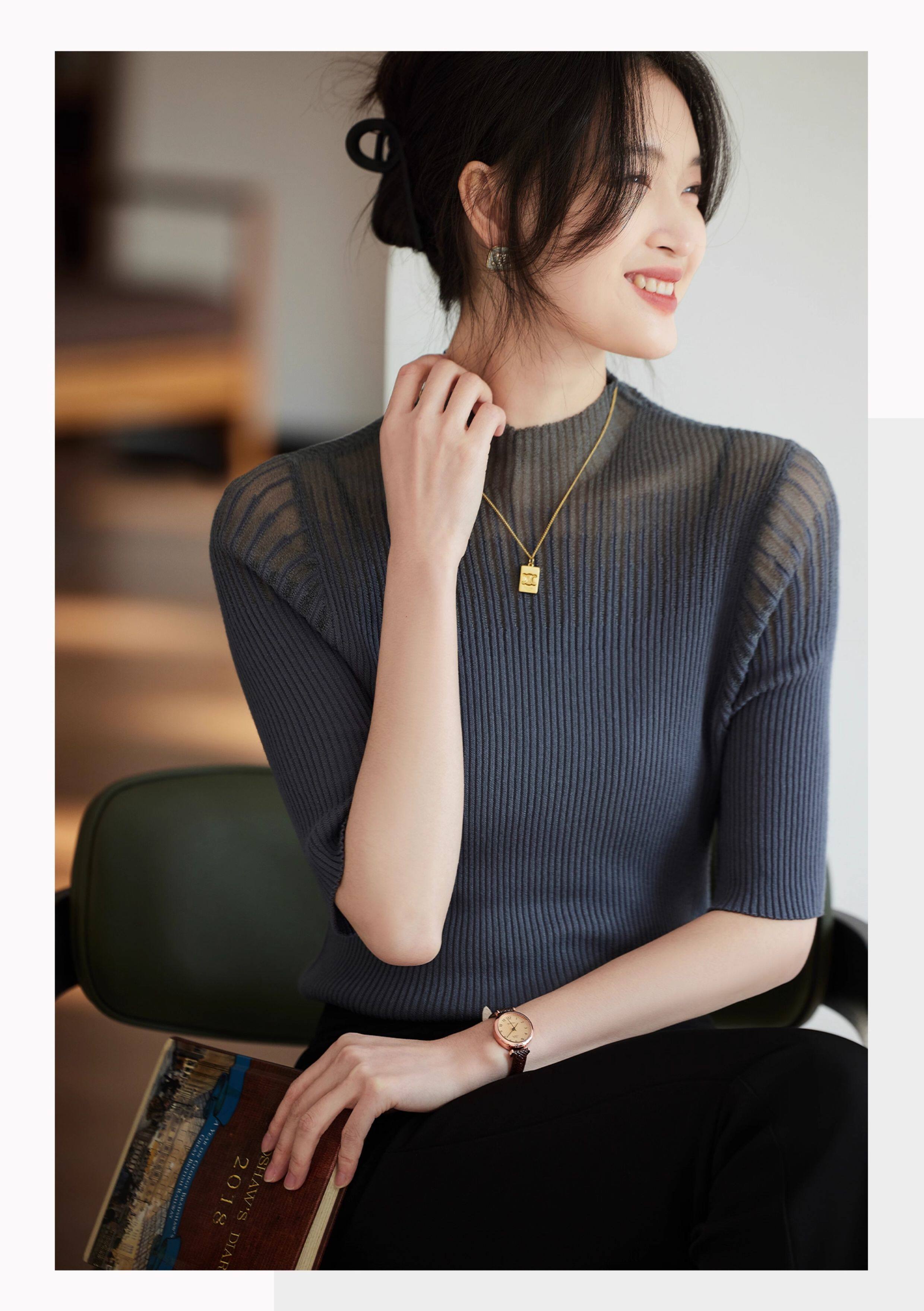 Basic House/百家好法式赫拉半高領網紗五分袖針織打底衫女士春季
