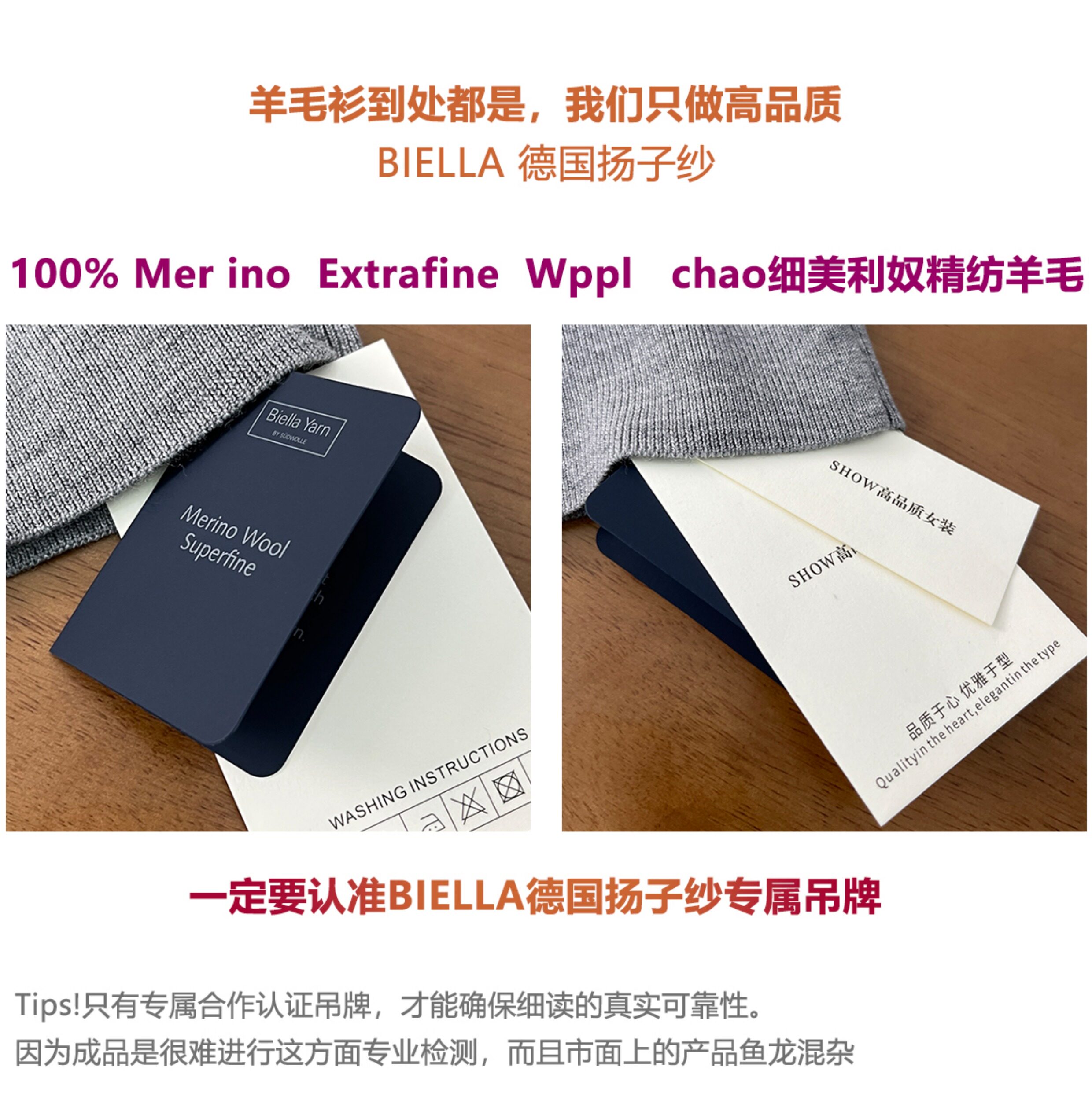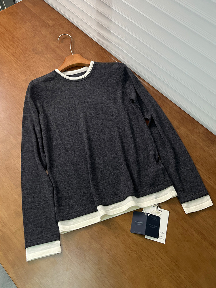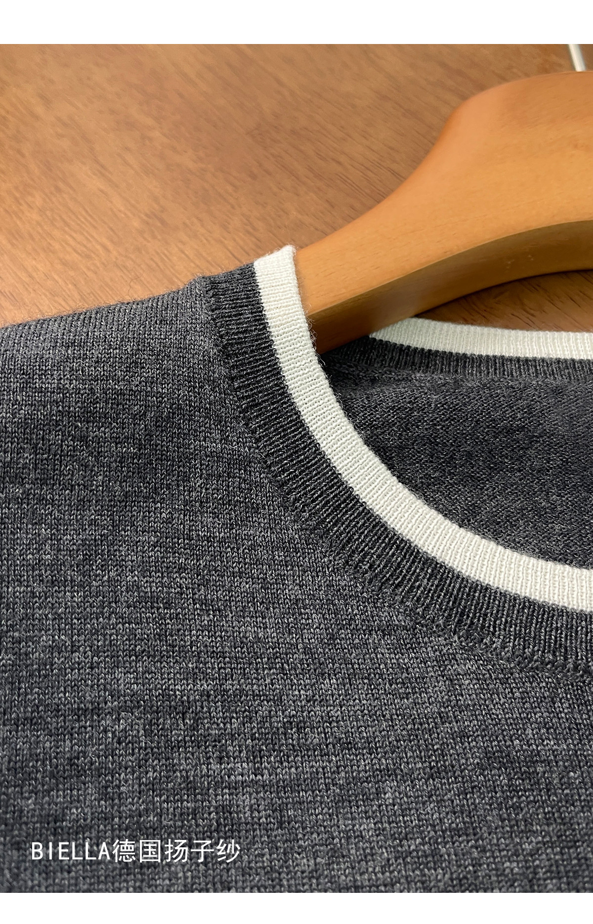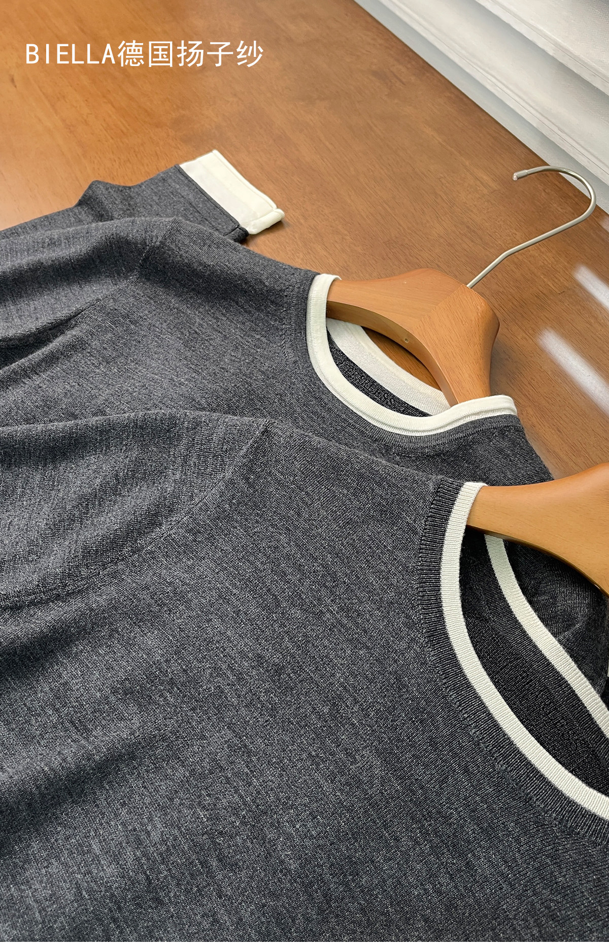 德國敭子紗chao薄 全羊毛短袖針織衫女撞色圓領打底衫簡約老錢風