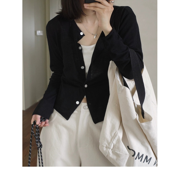 灰色天絲羊毛開衫女圓領長袖上衣薄款針織衫外套百搭短款打底衫