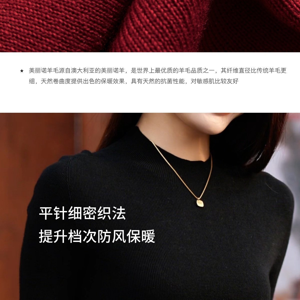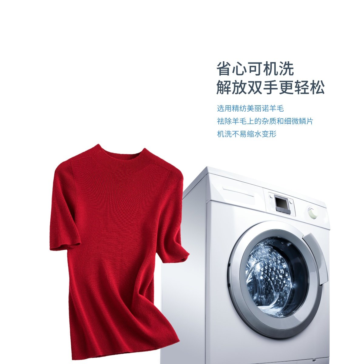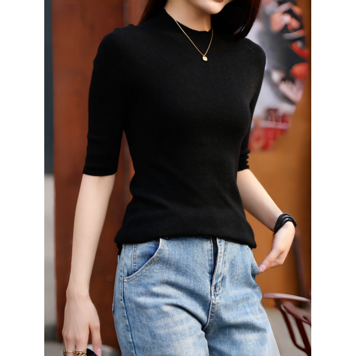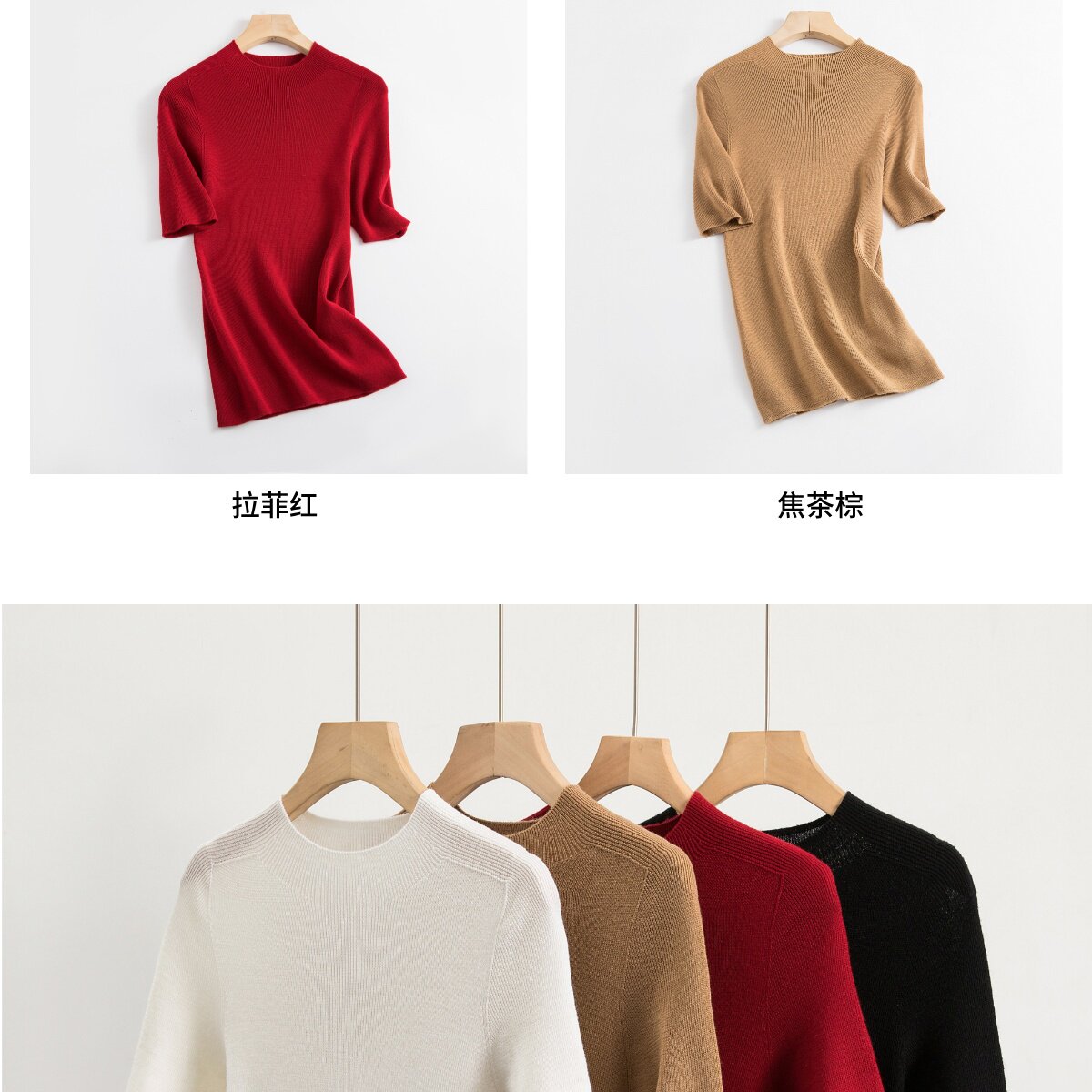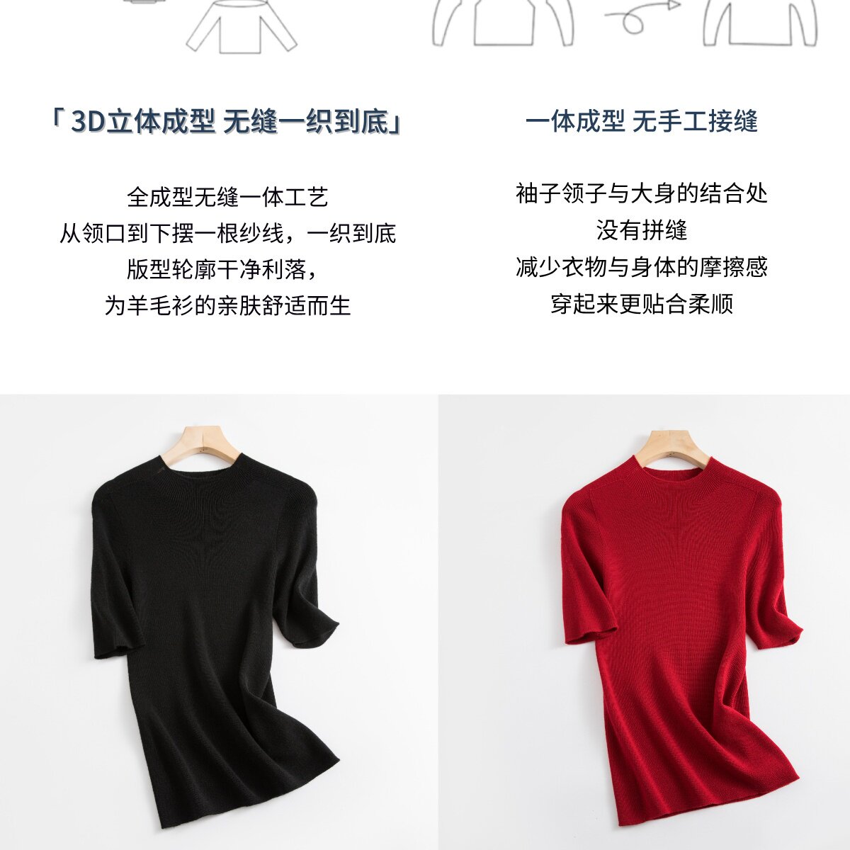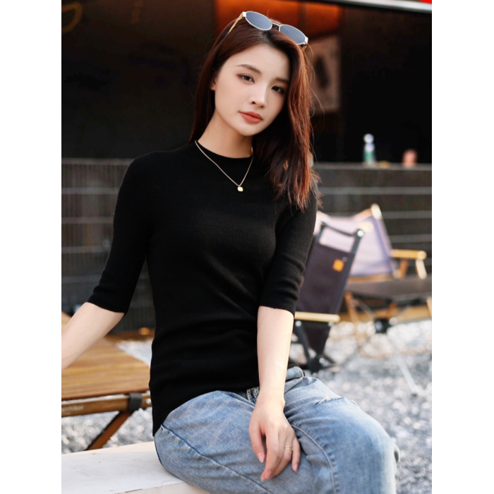 溫爾家 精紡48支美麗諾羊毛修身打底衫女半袖秋季無縫羊毛衫上衣