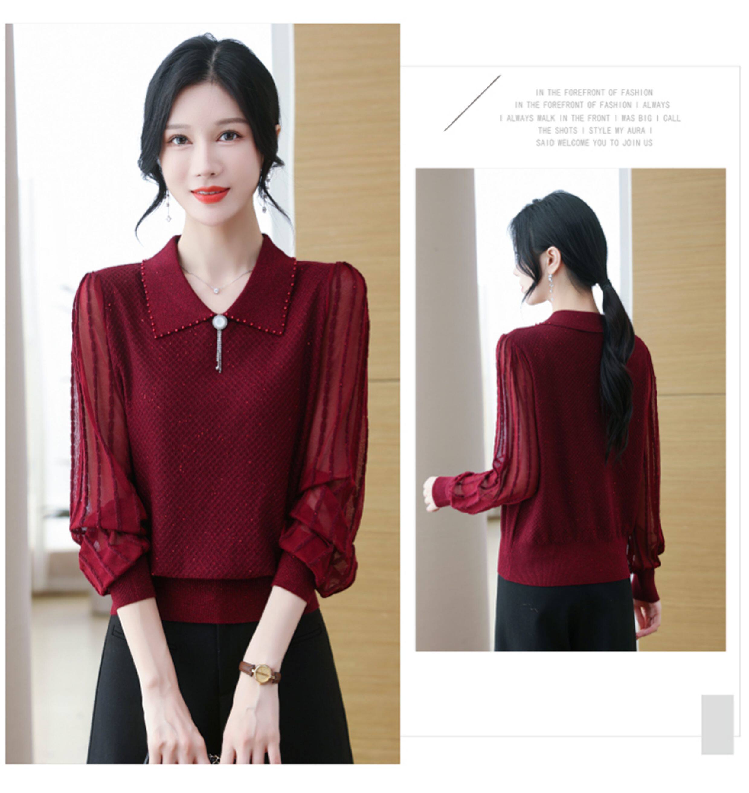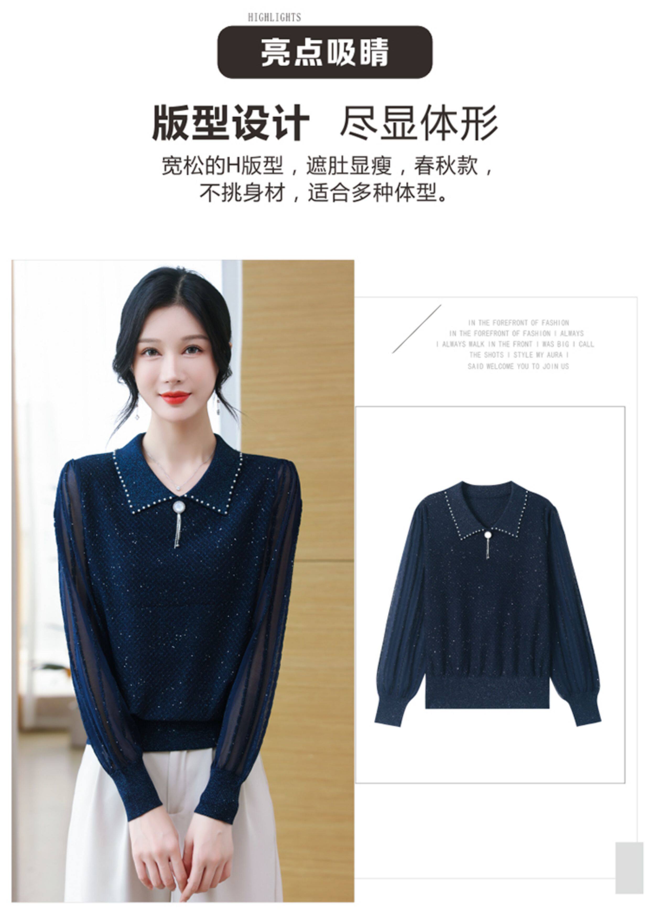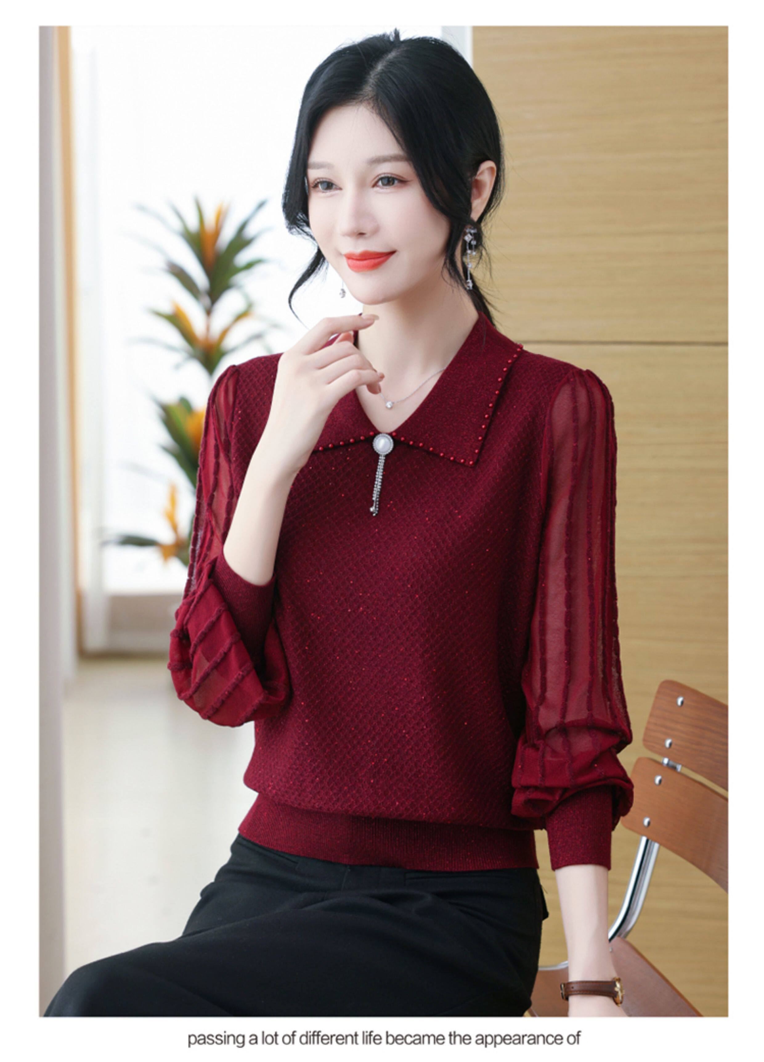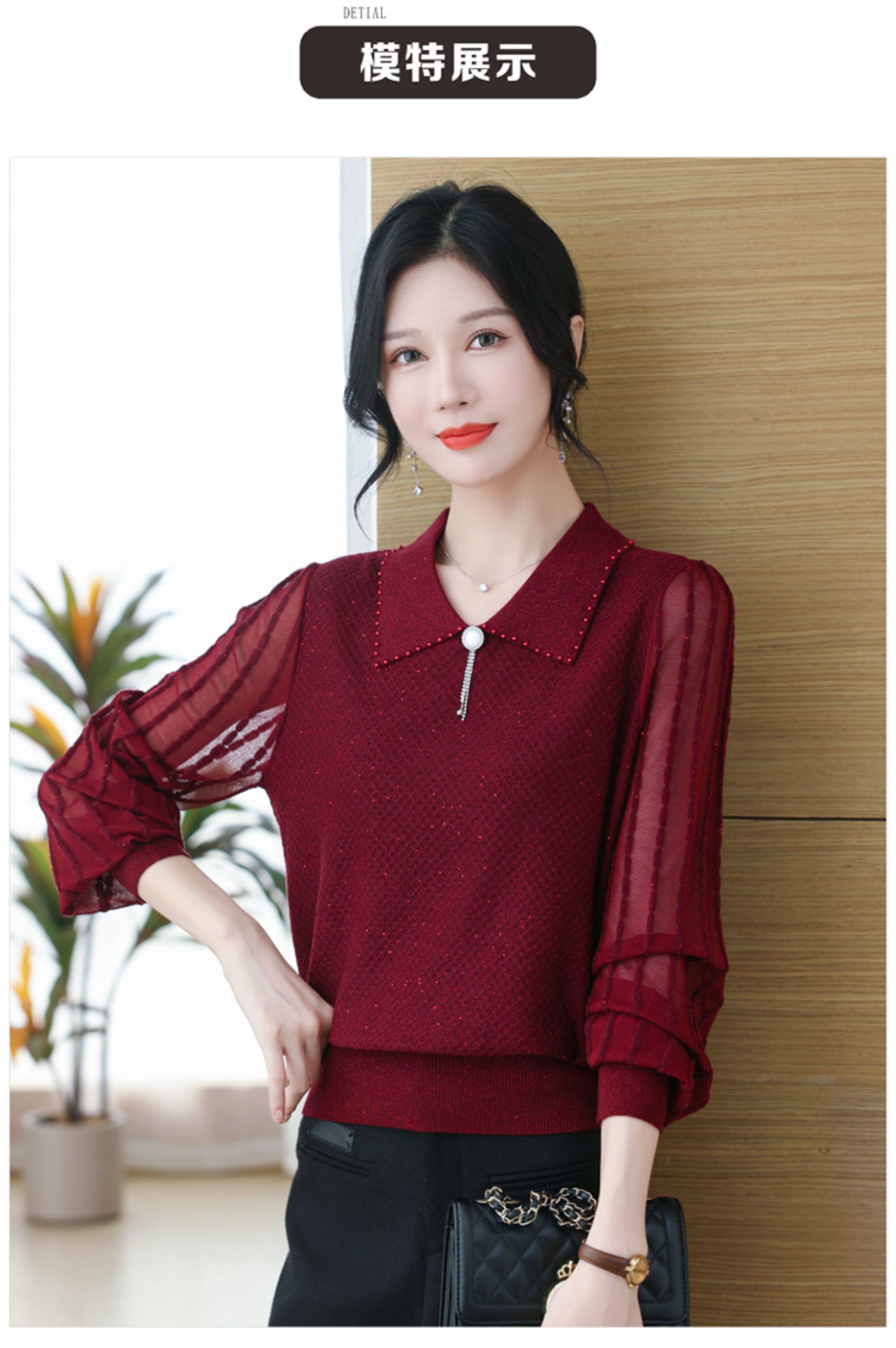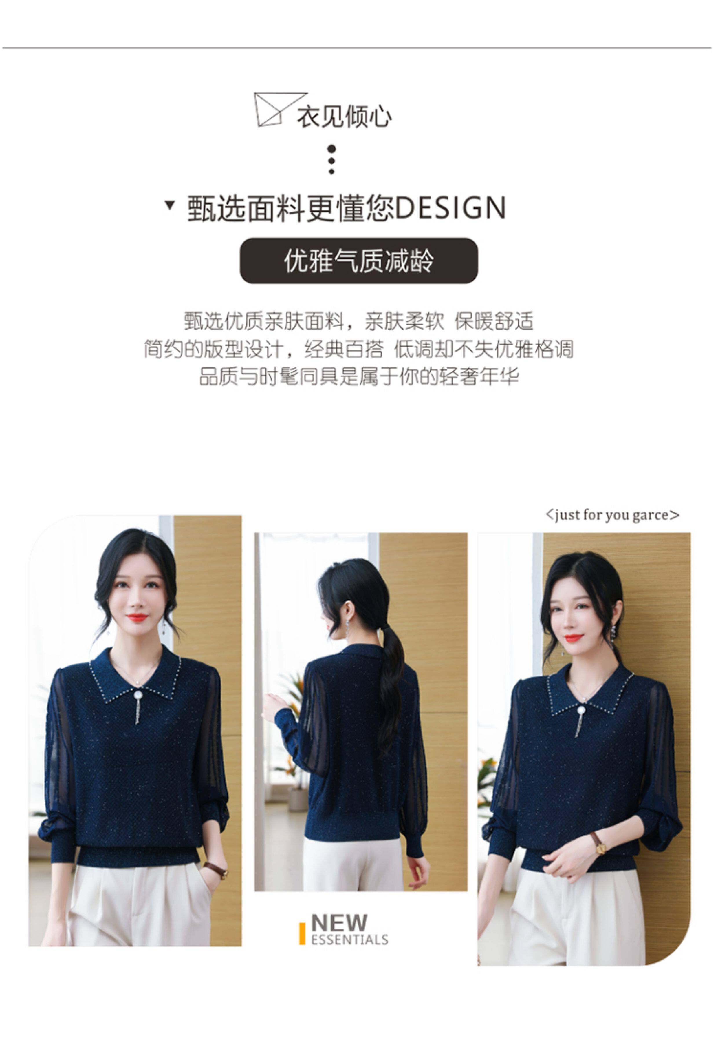 繙領羊毛針織衫長袖上衣女春裝2026新款洋氣媽媽薄款紗袖打底小衫
