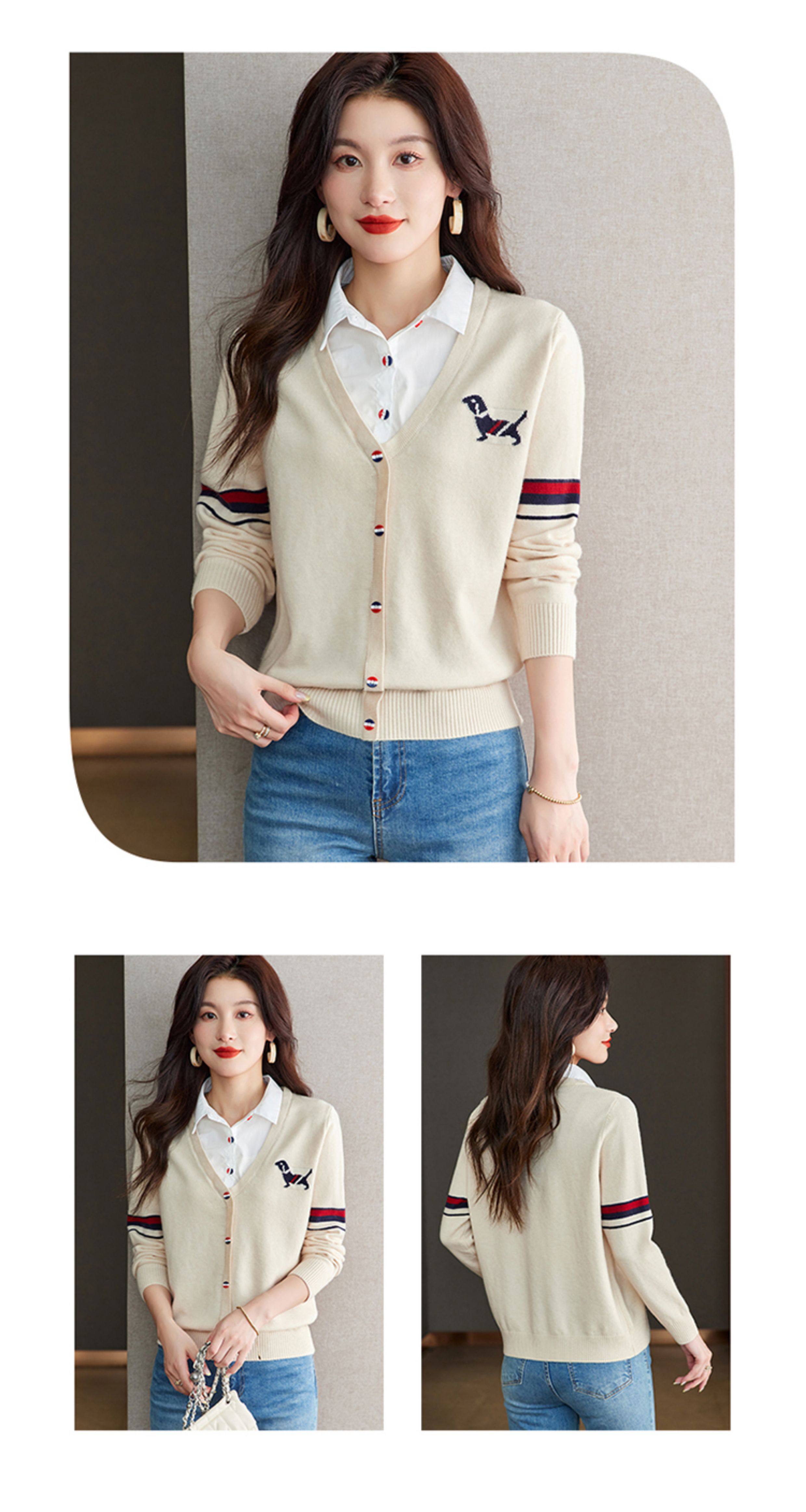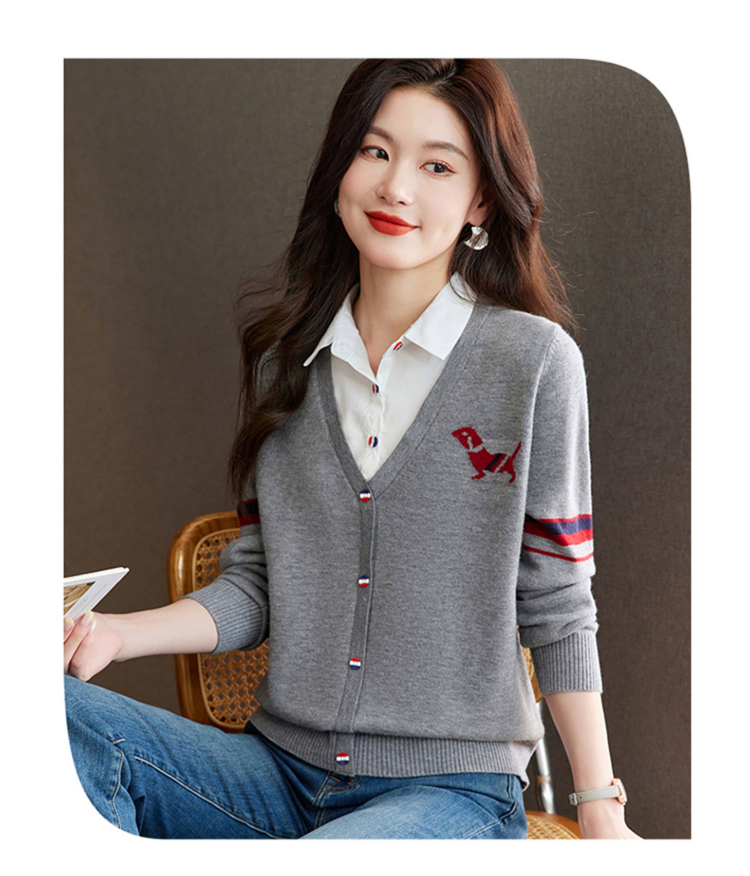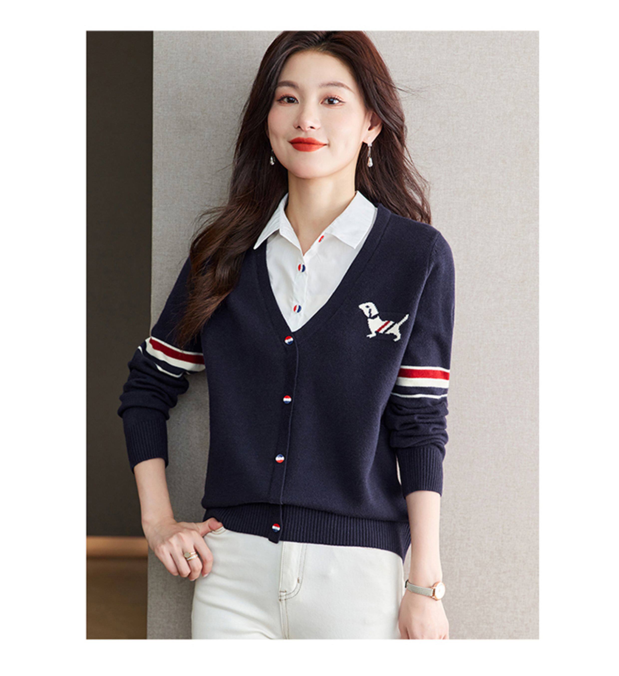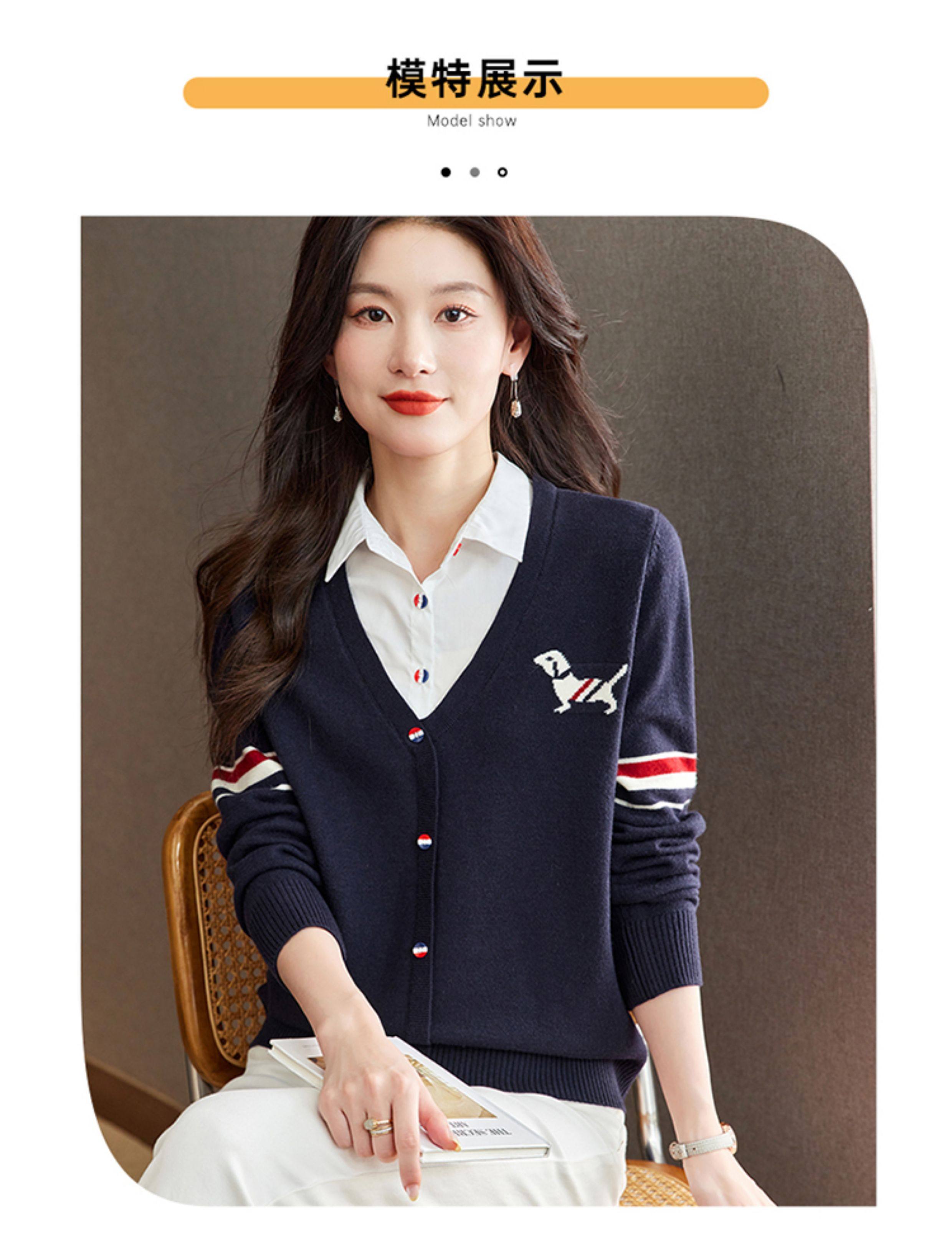 恒源祥彩羊假兩件羊毛衫女秋冬襯衫領毛衣條紋洋氣針織打底衫上衣