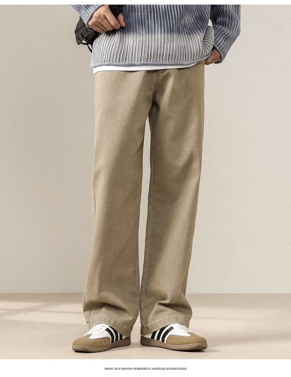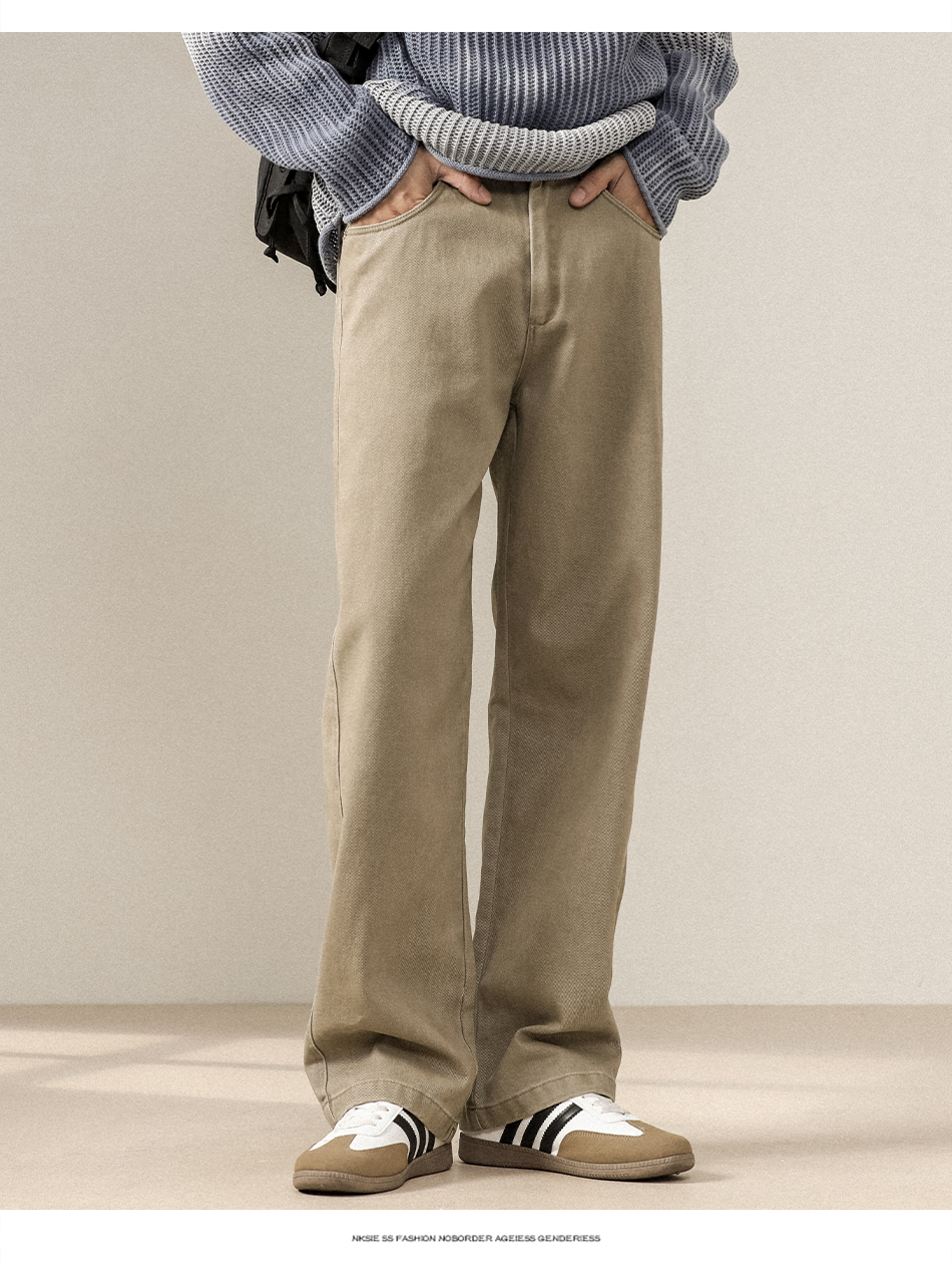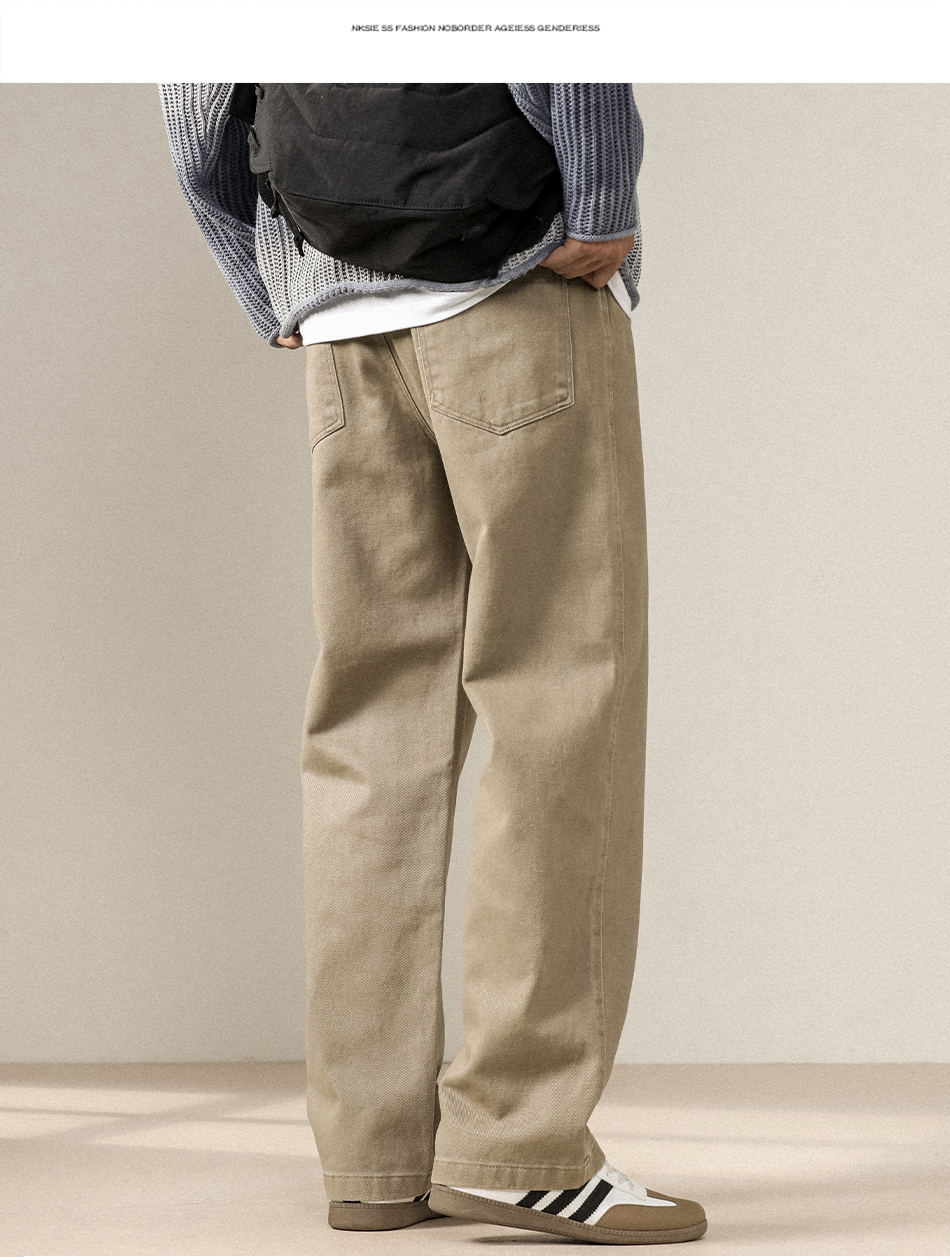 純棉直筒休閒褲男四季新款復古洗水牛仔褲簡約寬松加絨大碼濶腿褲