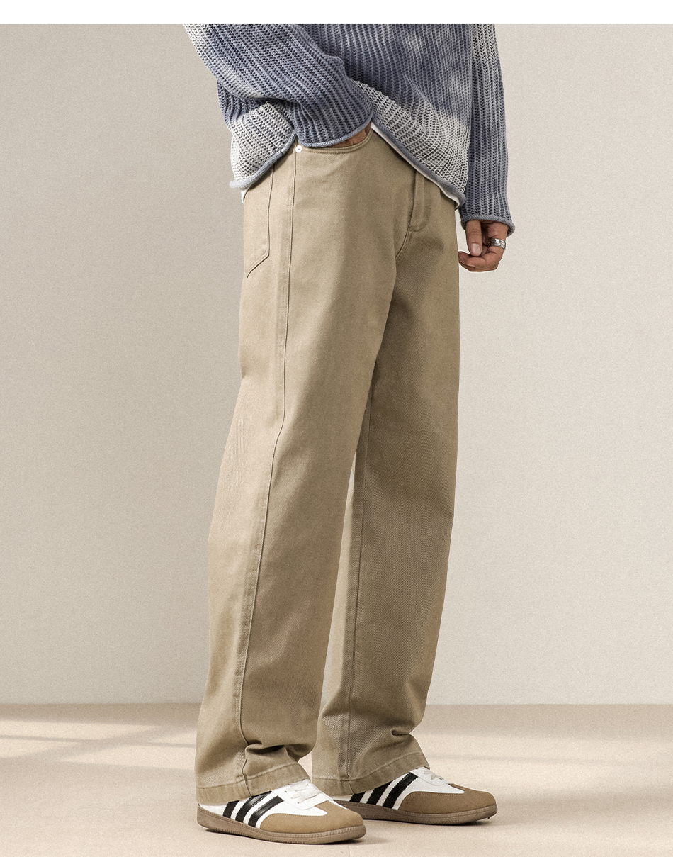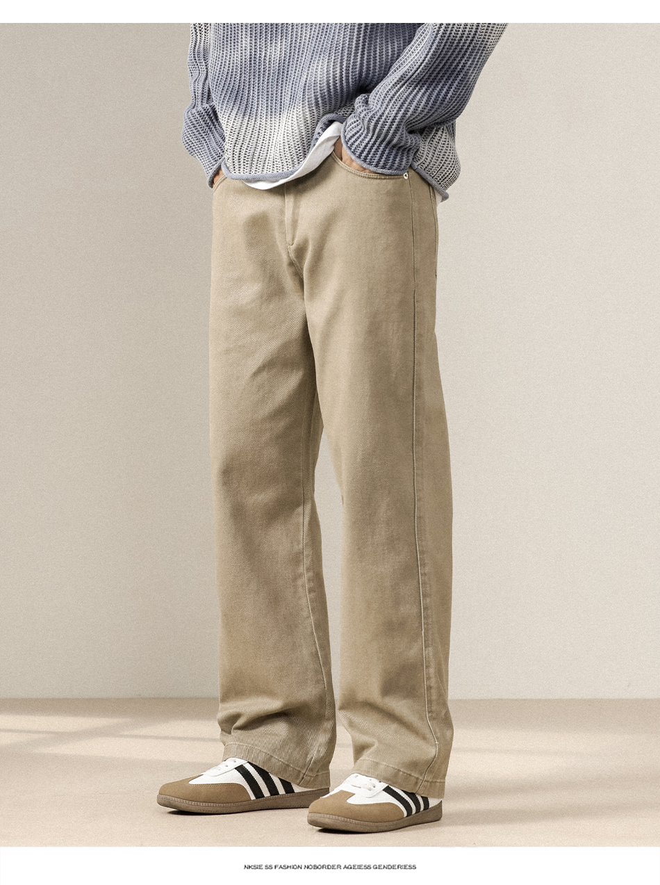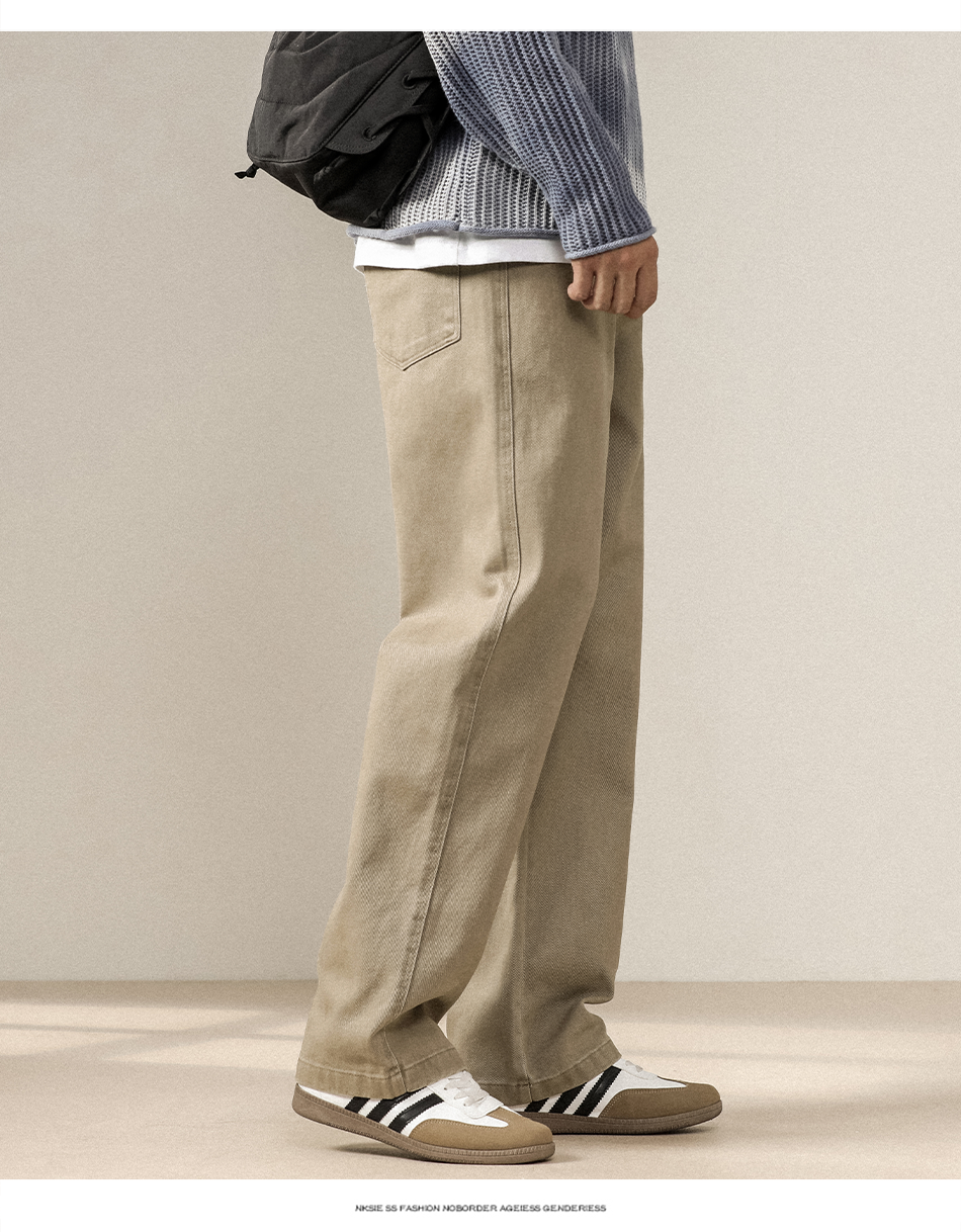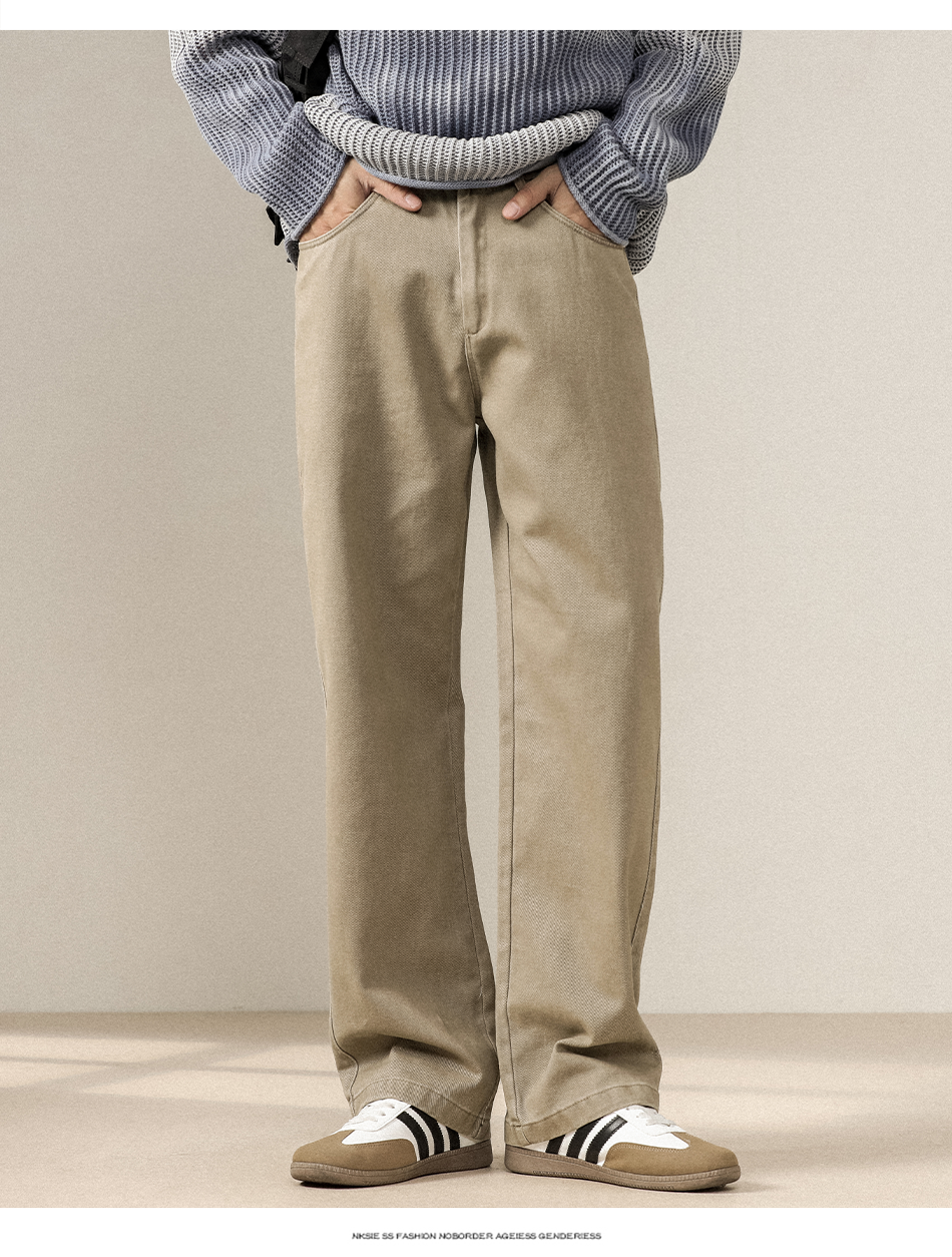 純棉直筒休閒褲男四季新款復古洗水牛仔褲簡約寬松加絨大碼濶腿褲