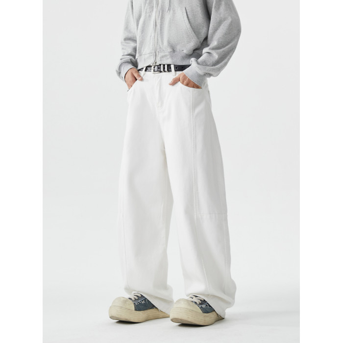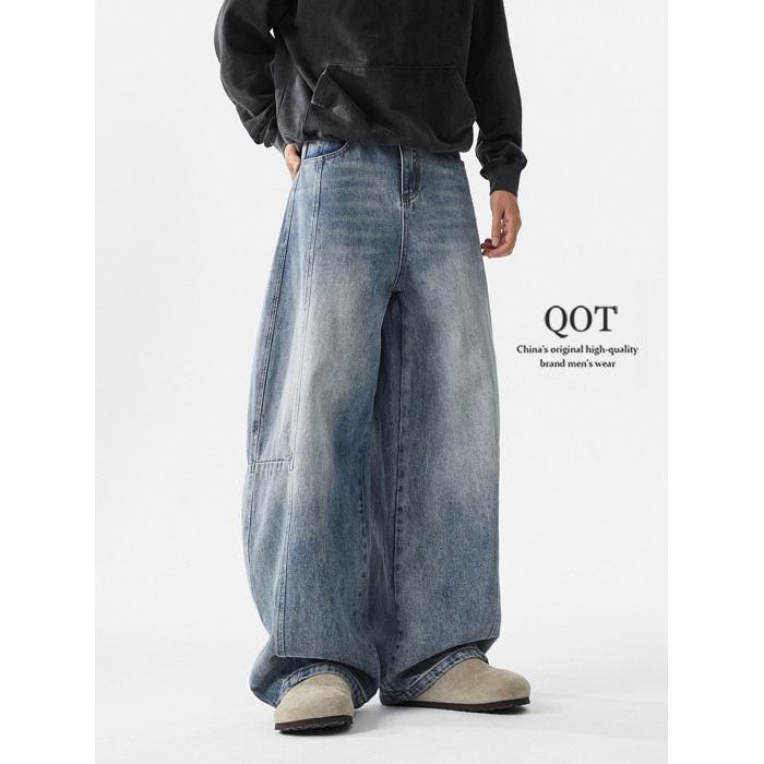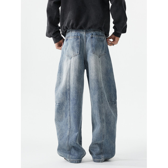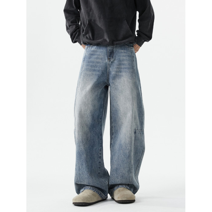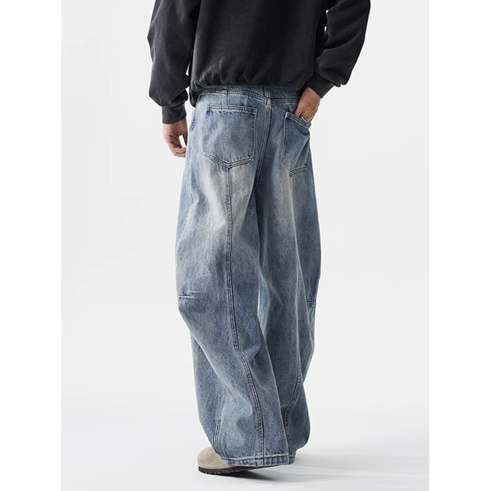美式水洗濶腿彎刀牛仔褲男秋季潮牌寬松休閒褲hiphop做舊直筒褲子