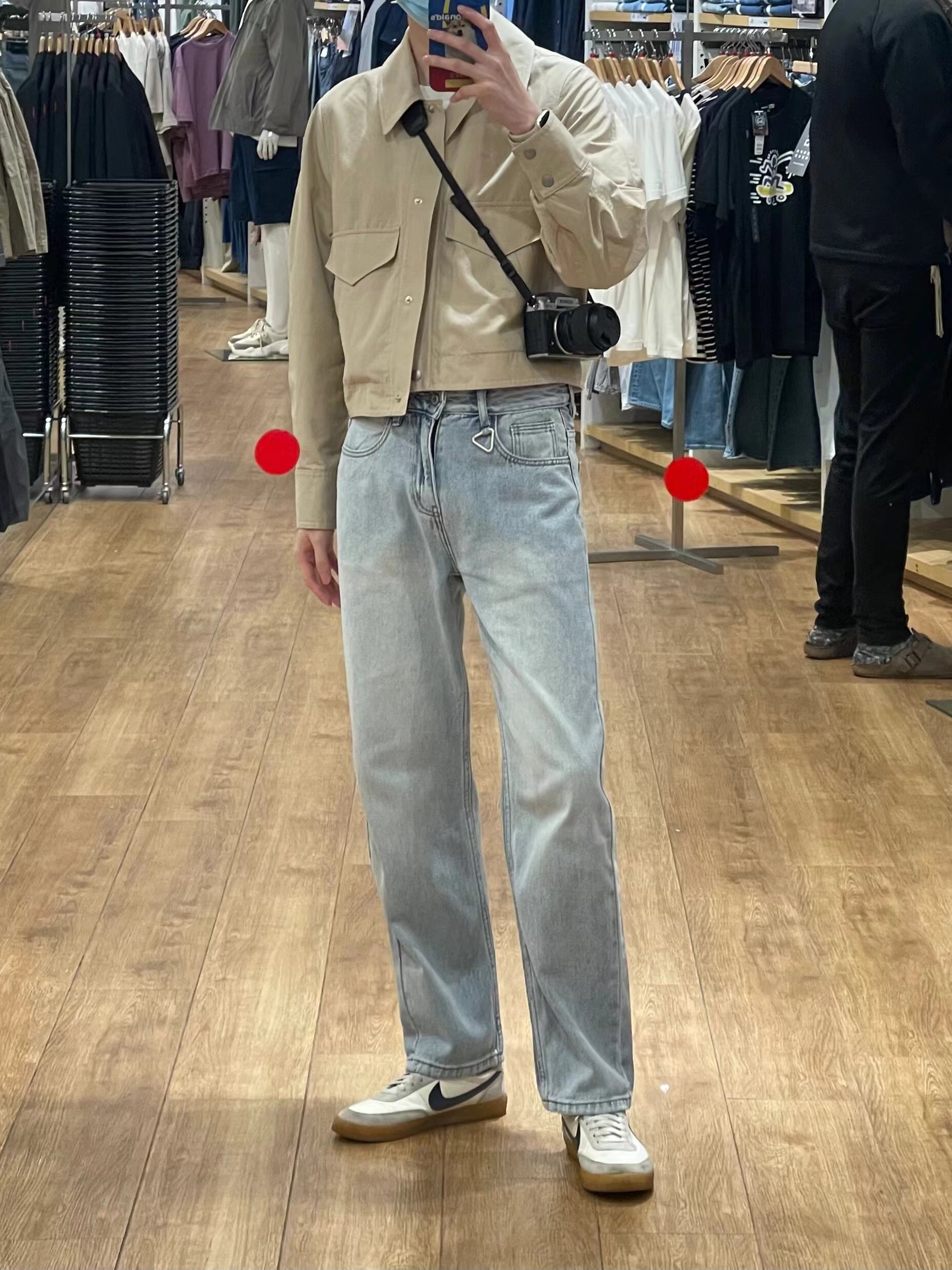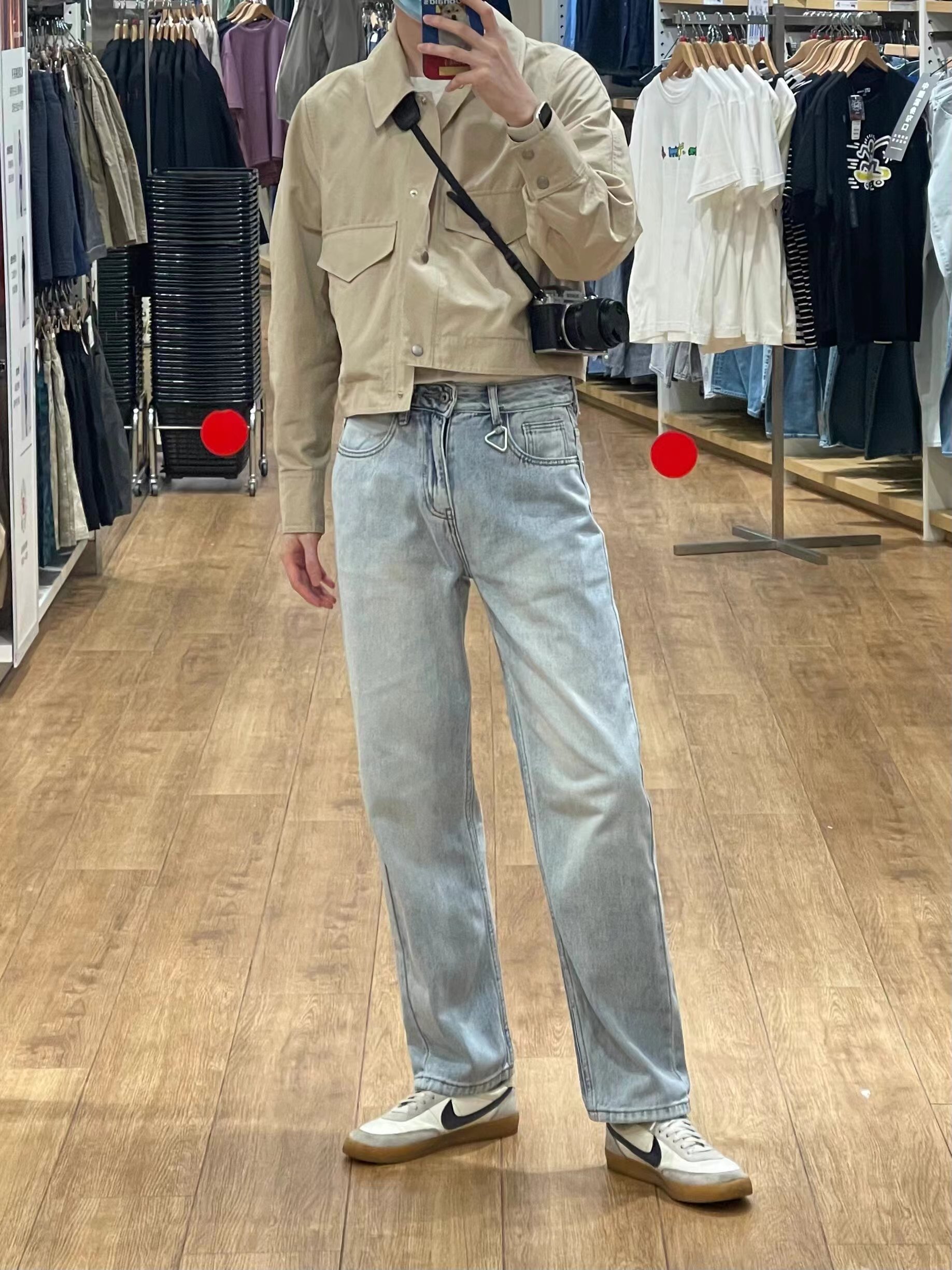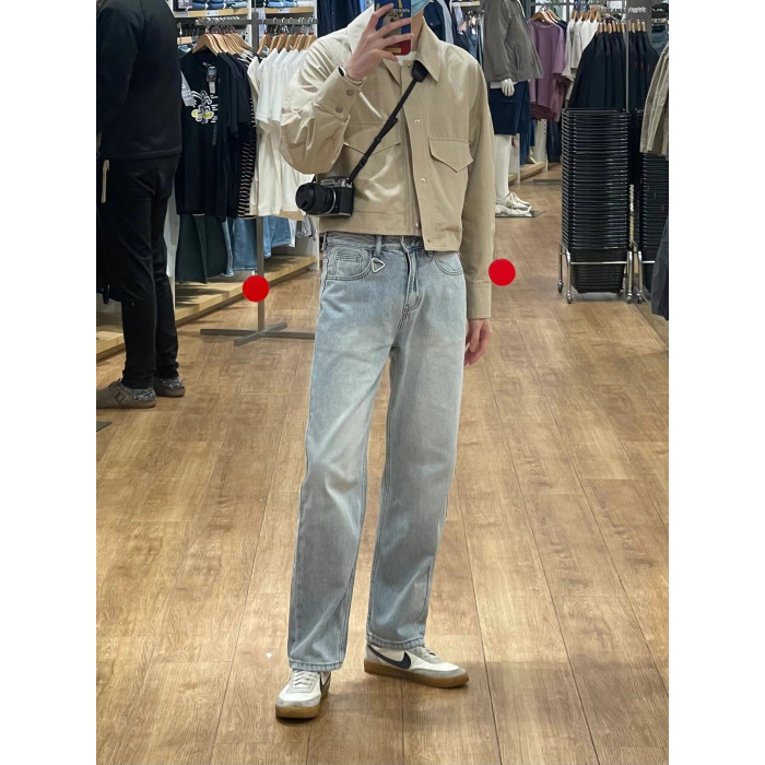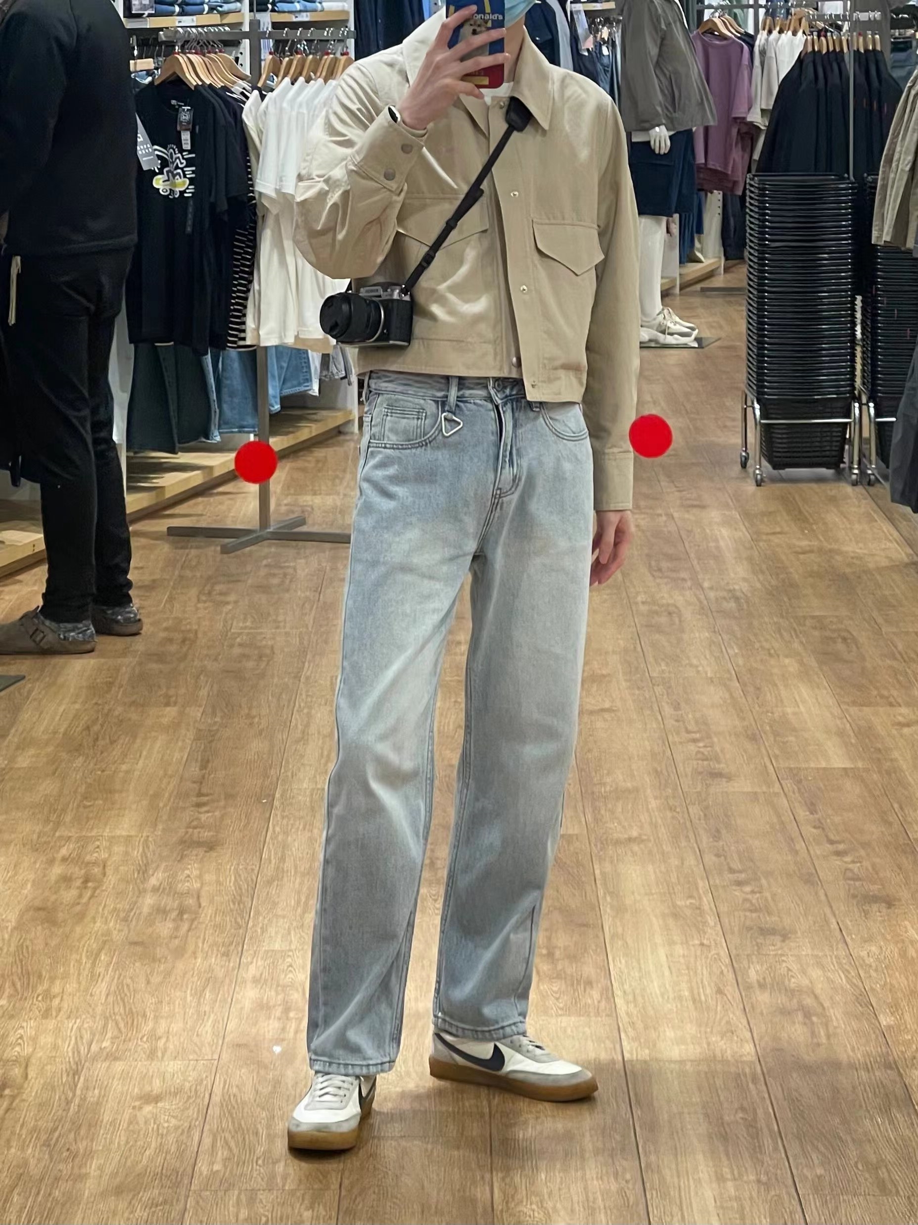 日系百搭簡約修身水洗泛白牛仔褲男潮流穿搭高級感設計直筒長褲子