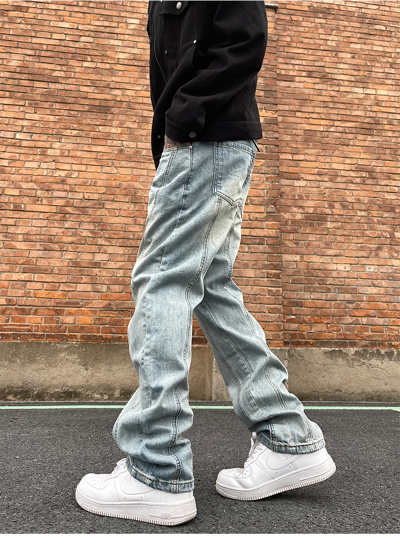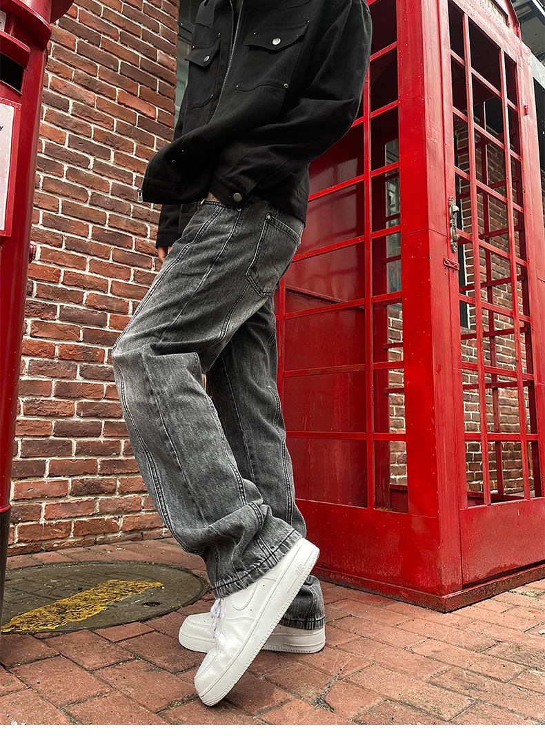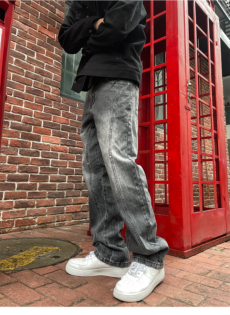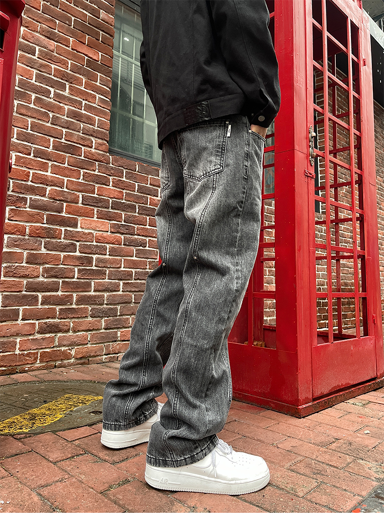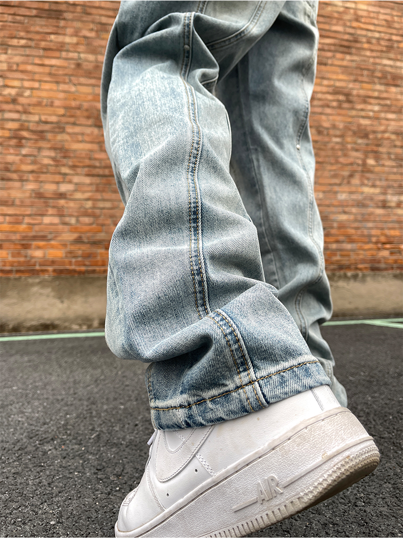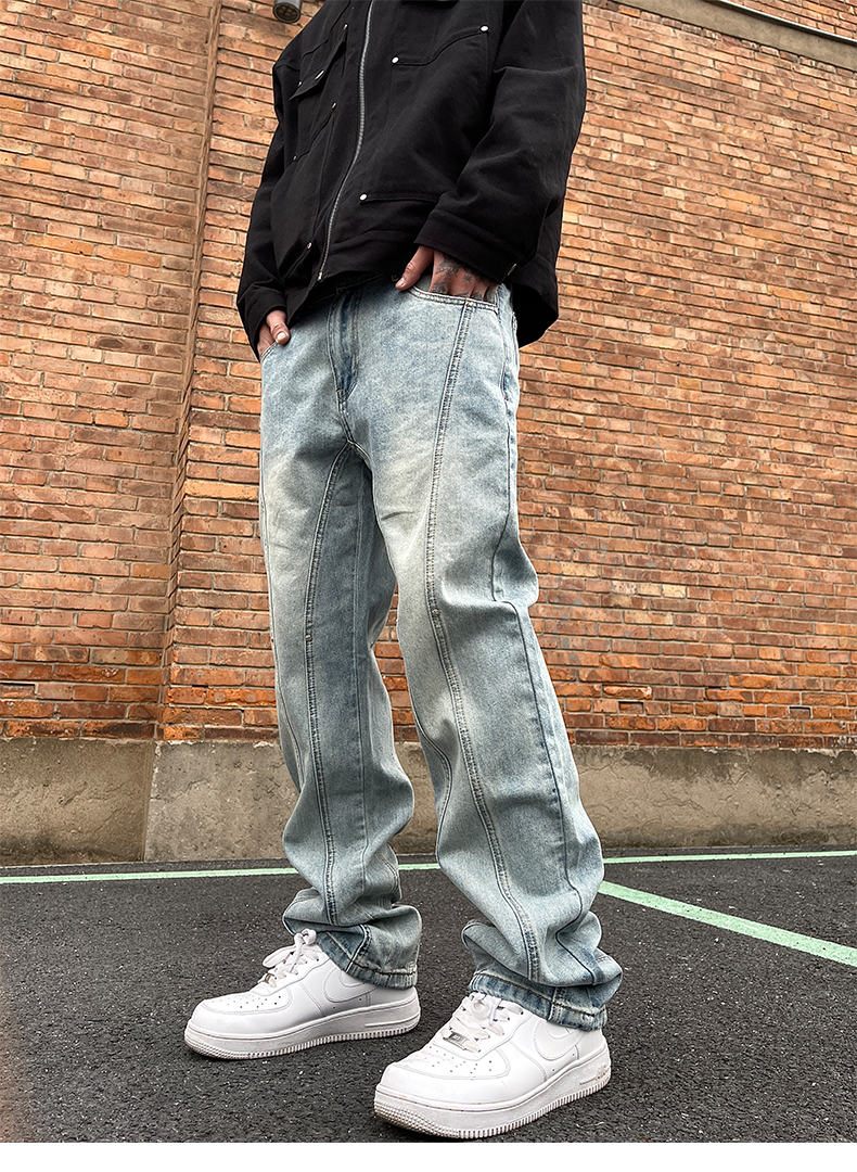 south美式春季水洗復古潮流寬松直筒休閒拼接解搆國潮牛仔長褲男