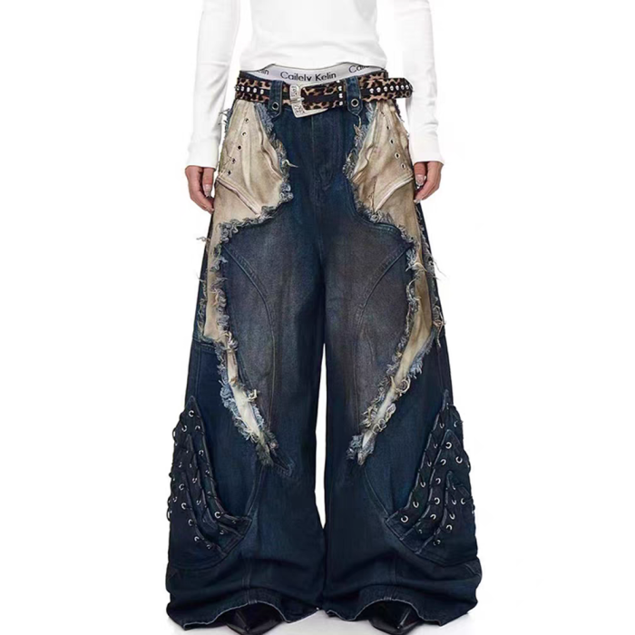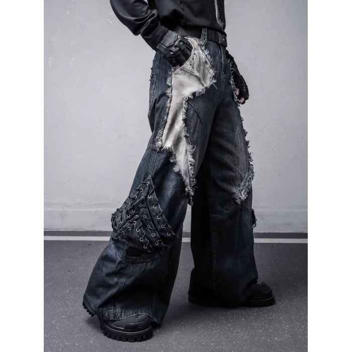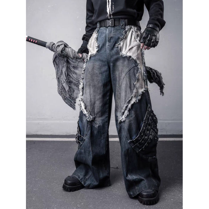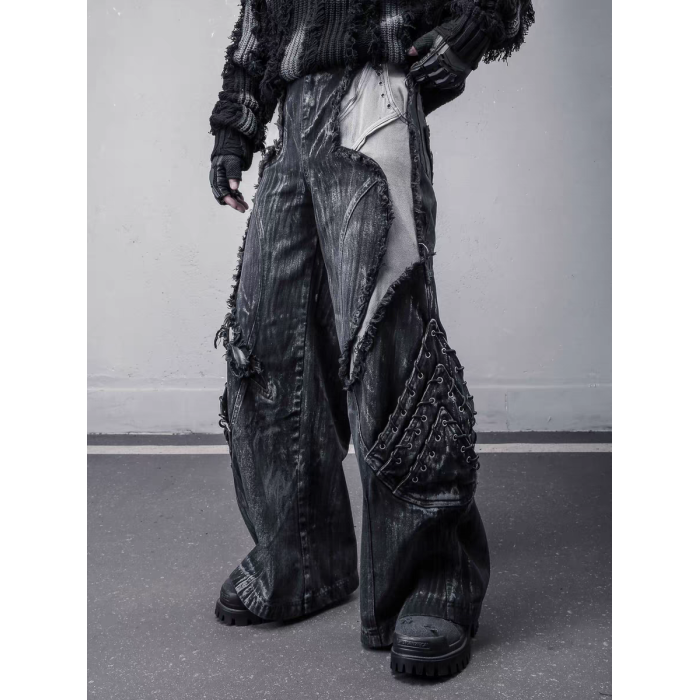 美式重工解搆毛邊拼接工裝牛仔褲男士潮牌做舊髒染亞文化y2k褲子