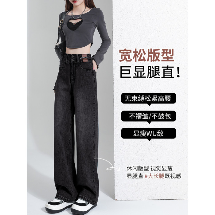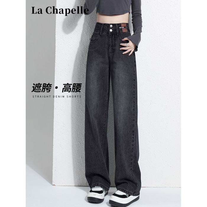 拉夏貝爾黑灰色春秋濶腿牛仔褲女夏季新款冬季加絨高腰窄版直筒褲