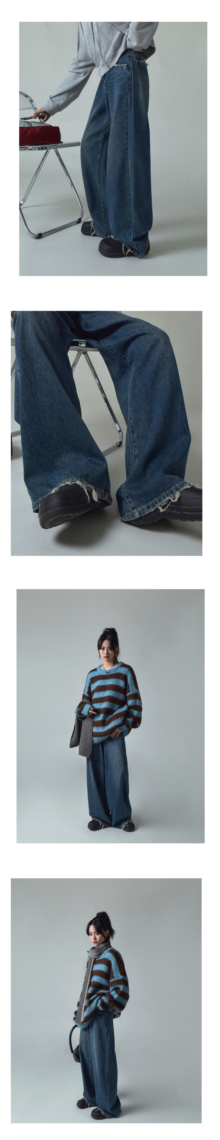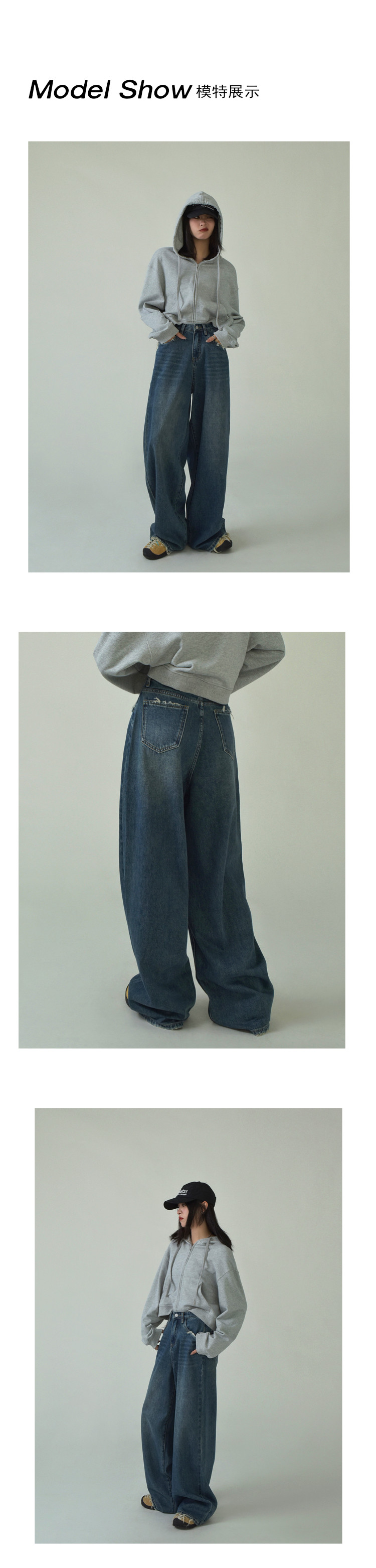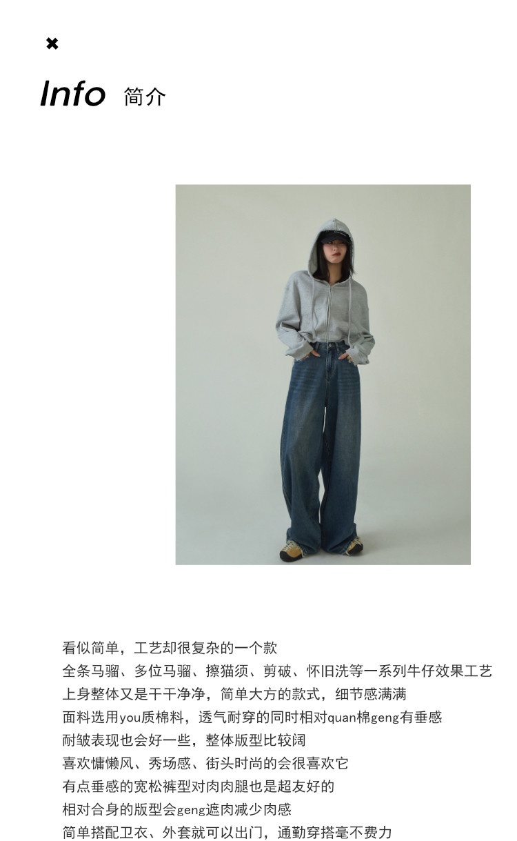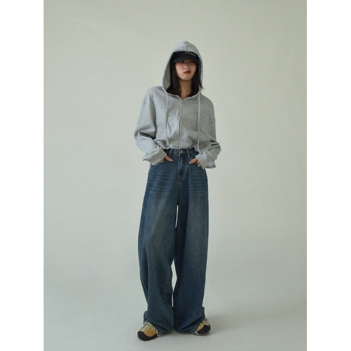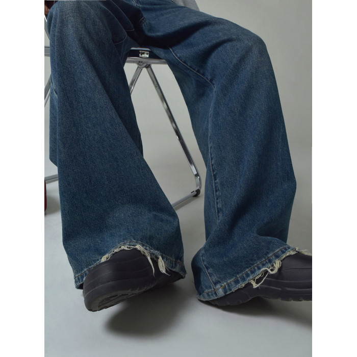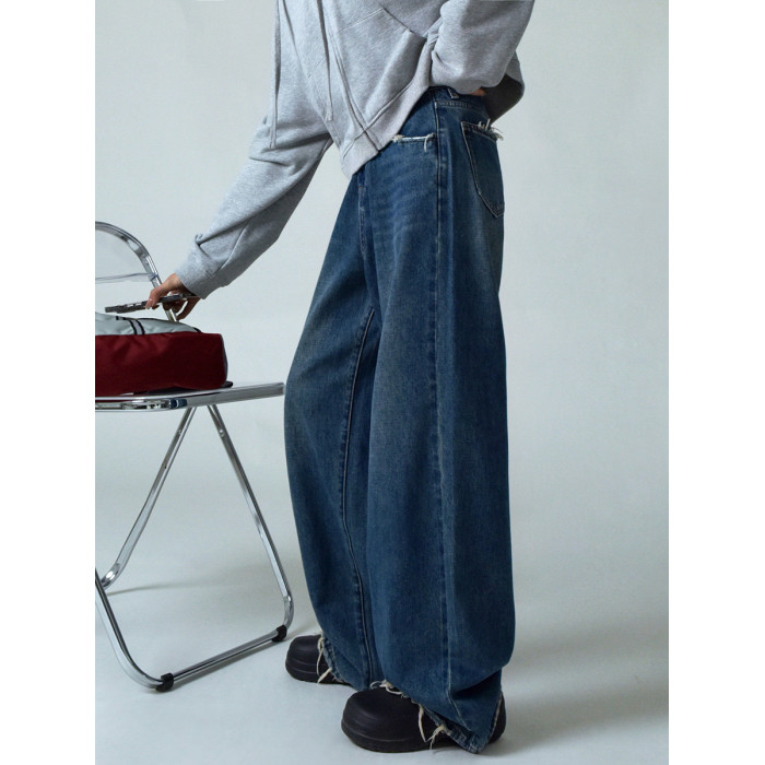 SIXI四喜家春季 復古做舊毛須邊濶腿牛仔褲女高腰直筒老爹拖地褲