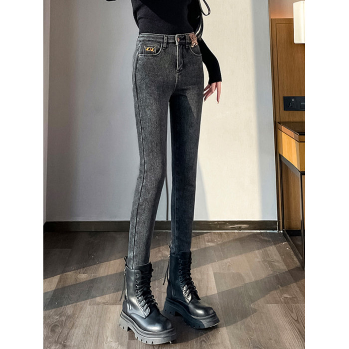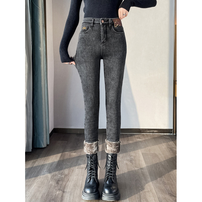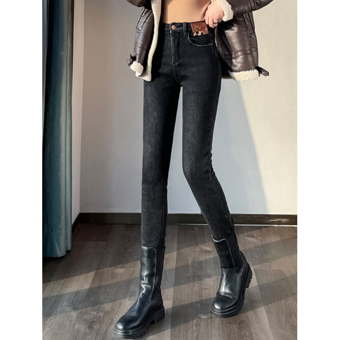 東北加絨加厚牛仔褲女冬季2025新款高腰顯瘦羊羔絨緊身加長小腳褲