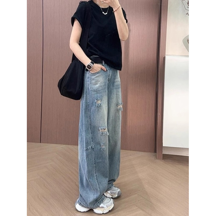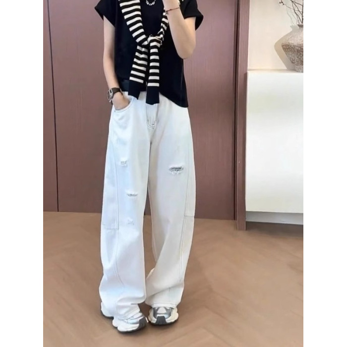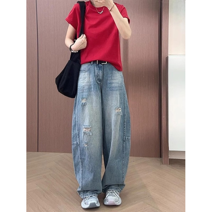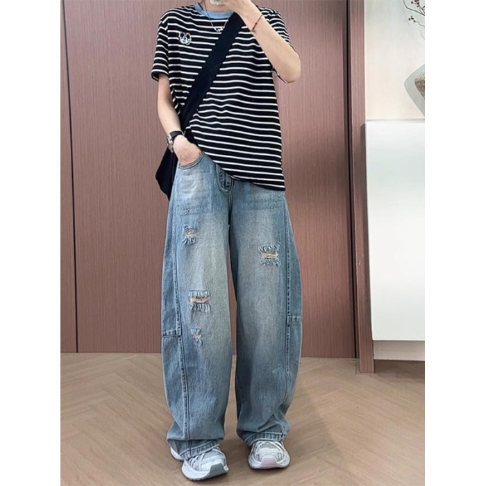 夏季破洞彎刀牛仔褲女薄款大碼梨型身材高腰寬松顯瘦香蕉濶腿褲