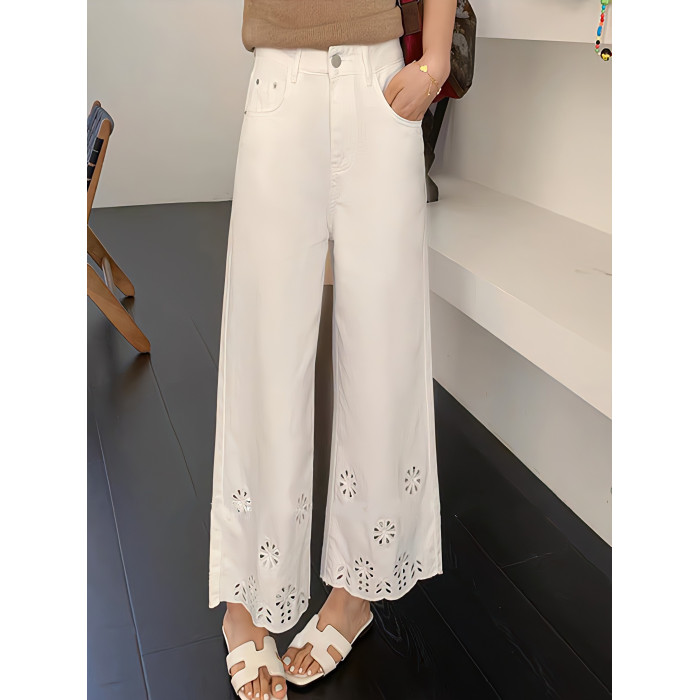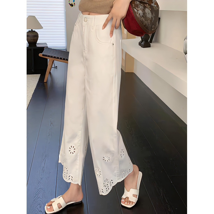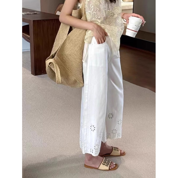 夏高級感韓系甜美鏤空花朵刺綉白色牛仔褲設計感時尚九分濶腿褲薄