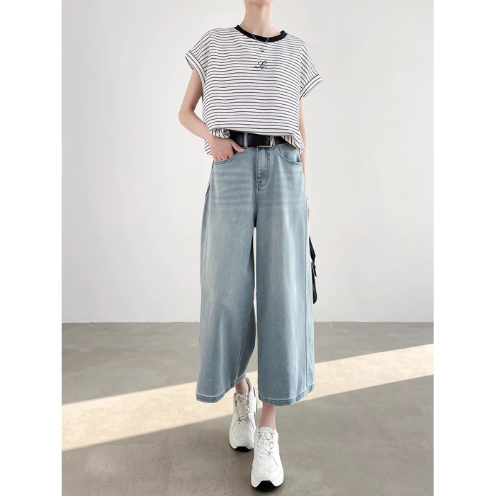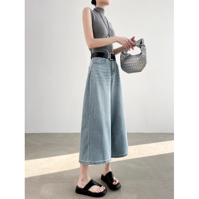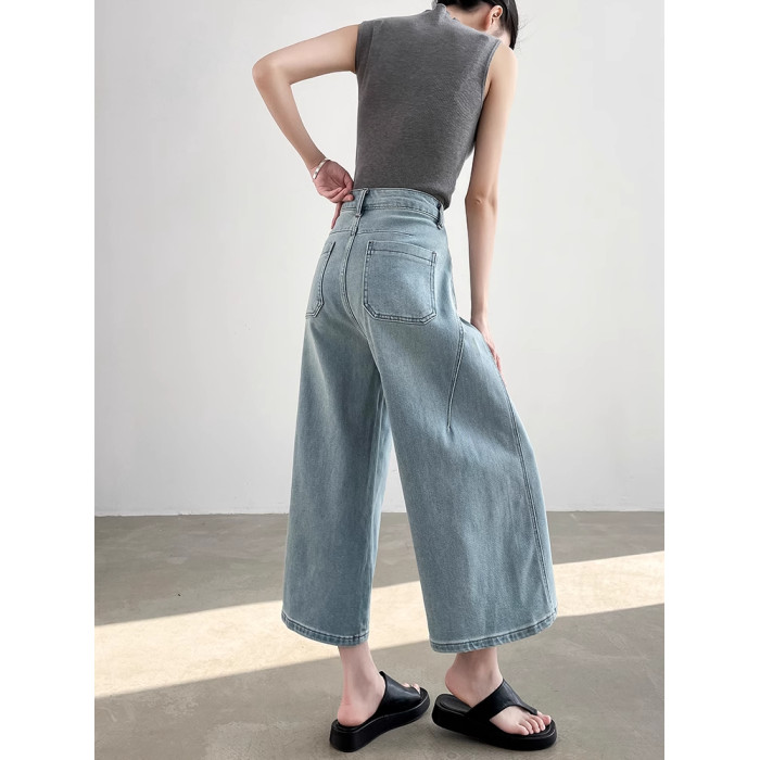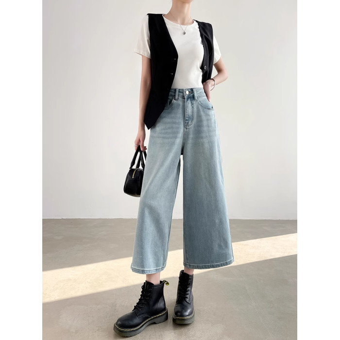 高級藍色直筒八分牛仔褲女夏季高腰百搭寬松顯瘦小個子氣質濶腿褲