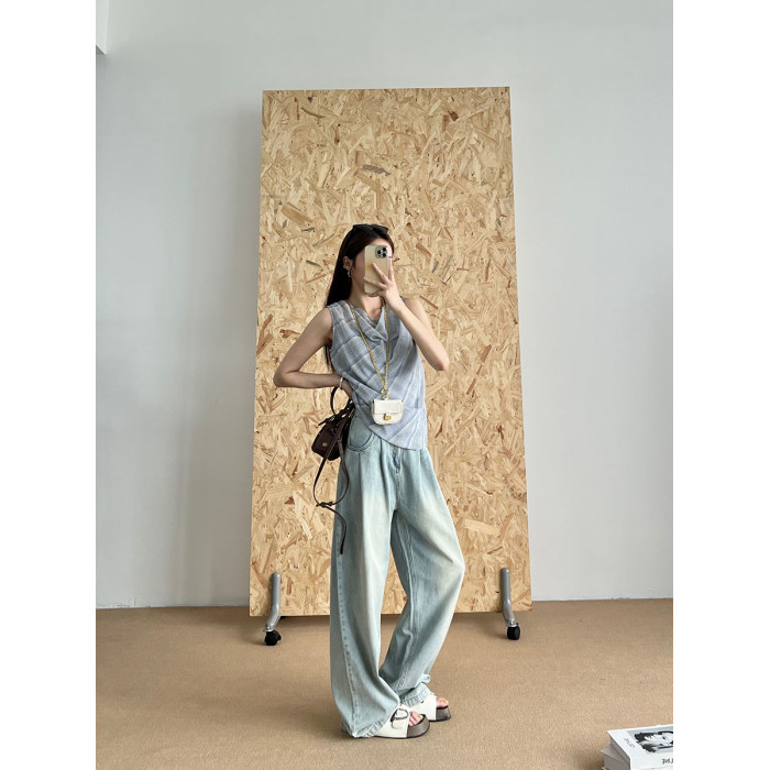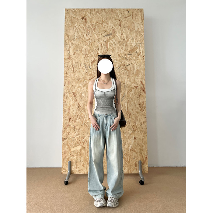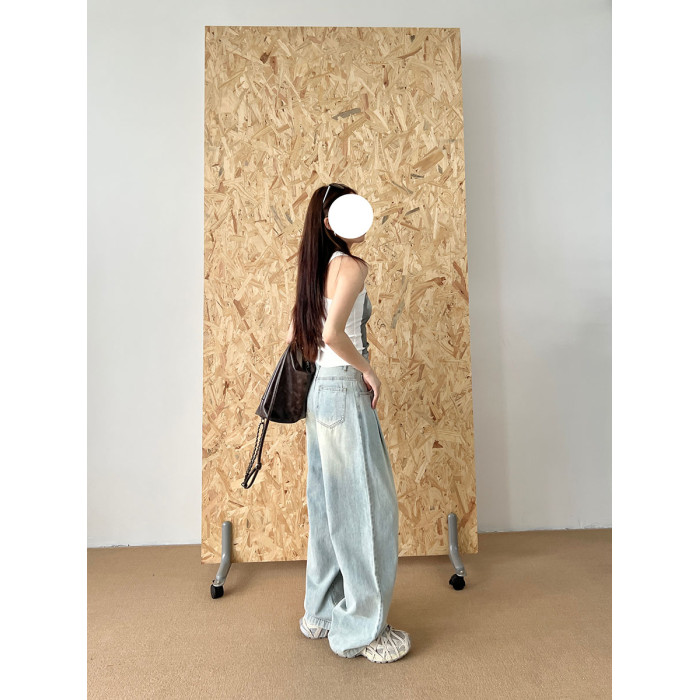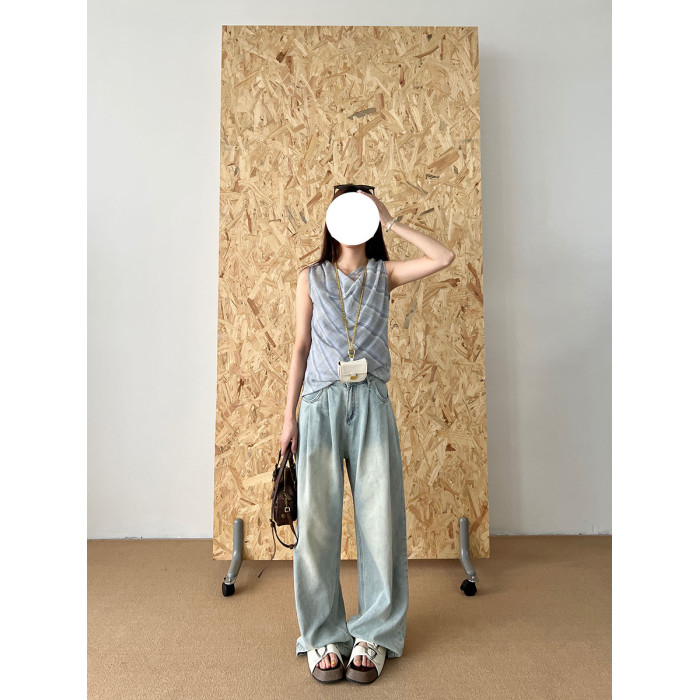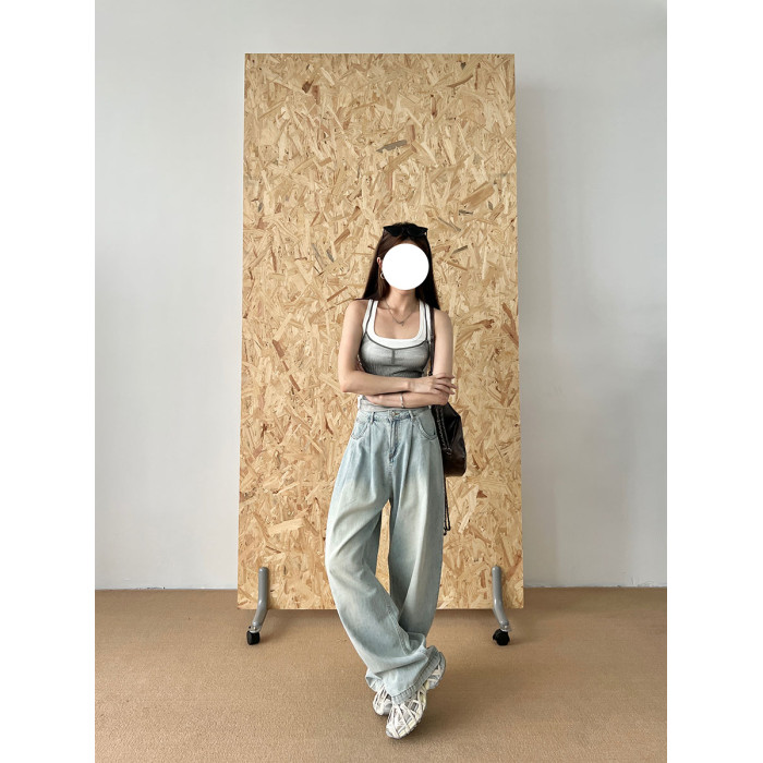 fuccykee春秋季高腰顯瘦小個子寬松直筒垂感拖地濶腿褲牛仔褲女