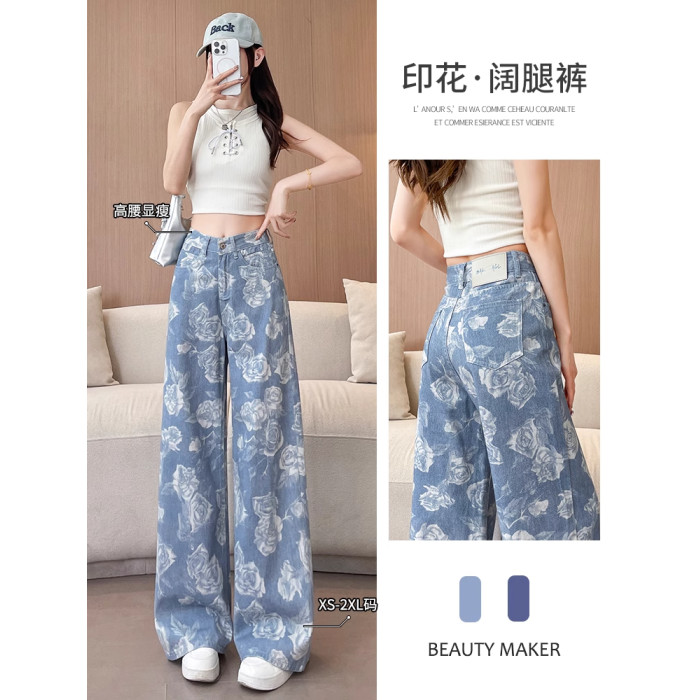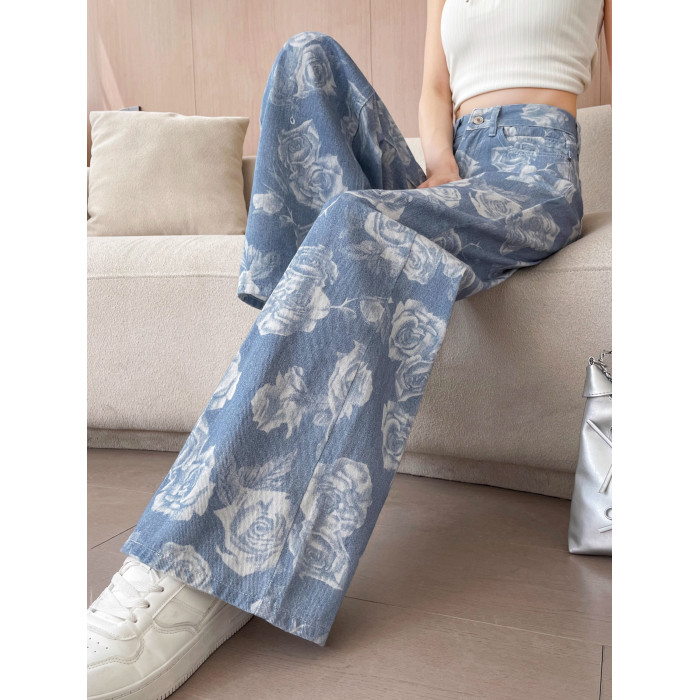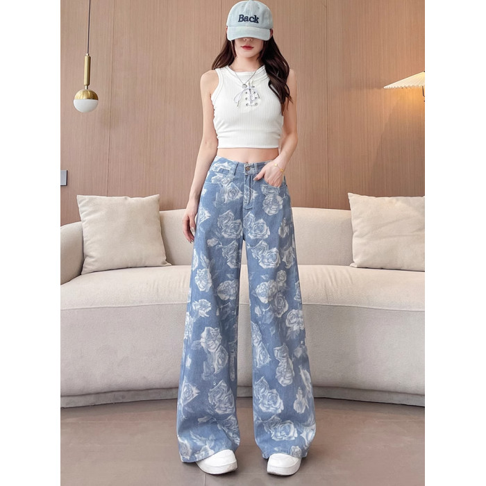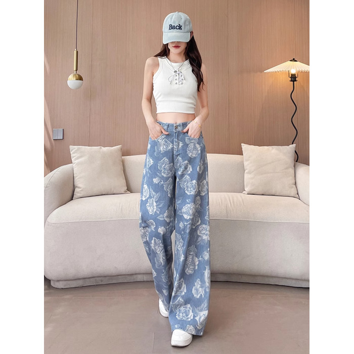 高級玫瑰印花牛仔褲女夏季薄款高品質寬松顯瘦百搭潮流休閒濶腿褲