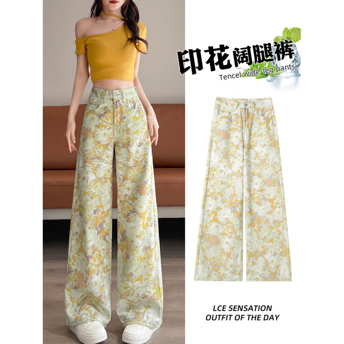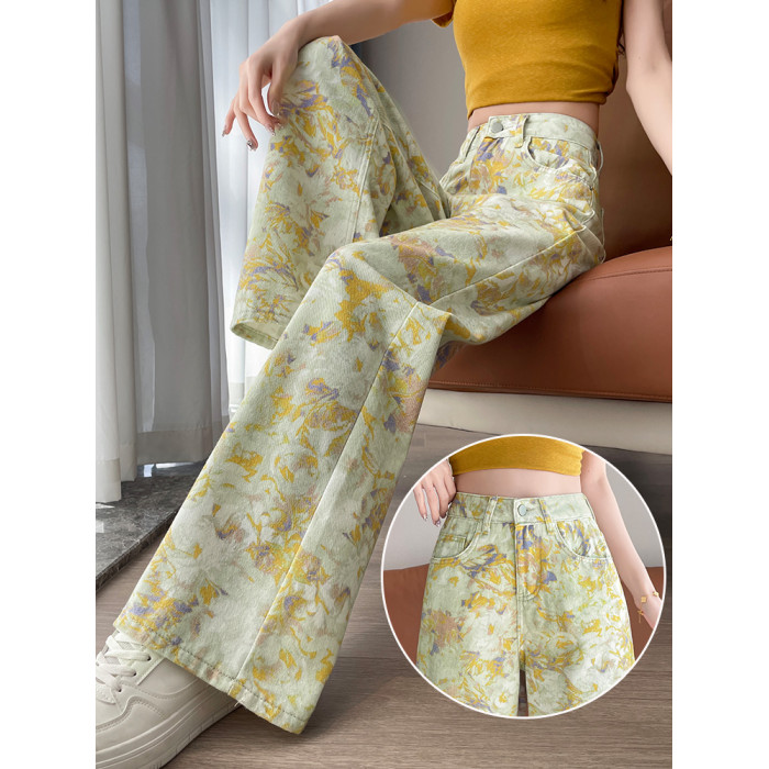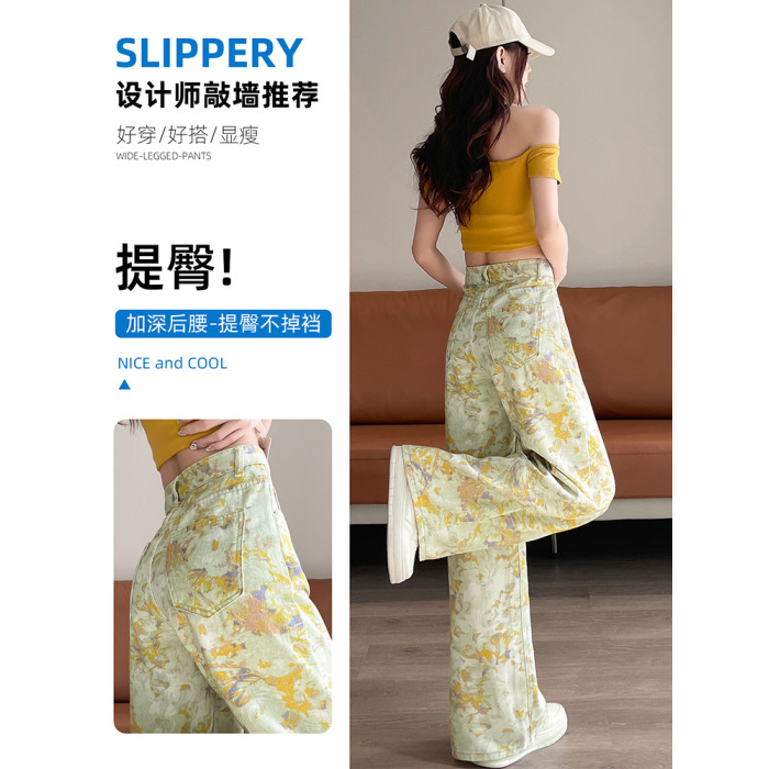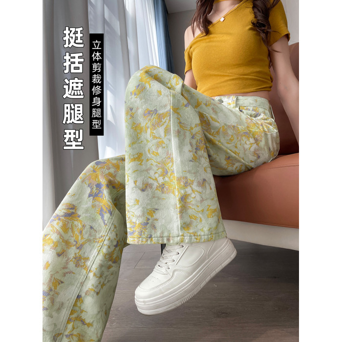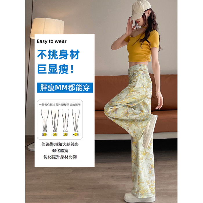 高級黃色紥染印花牛仔褲女夏季薄款高級感小衆炸街休閒百搭濶腿褲