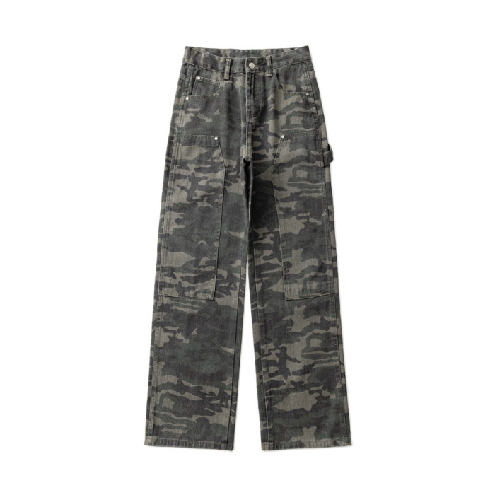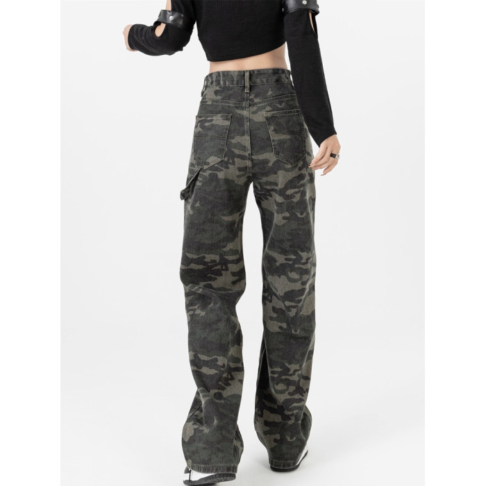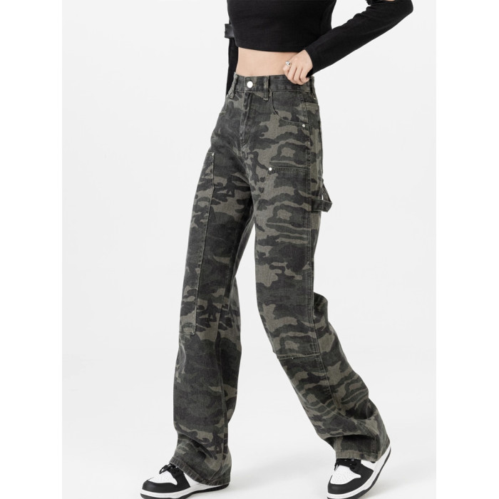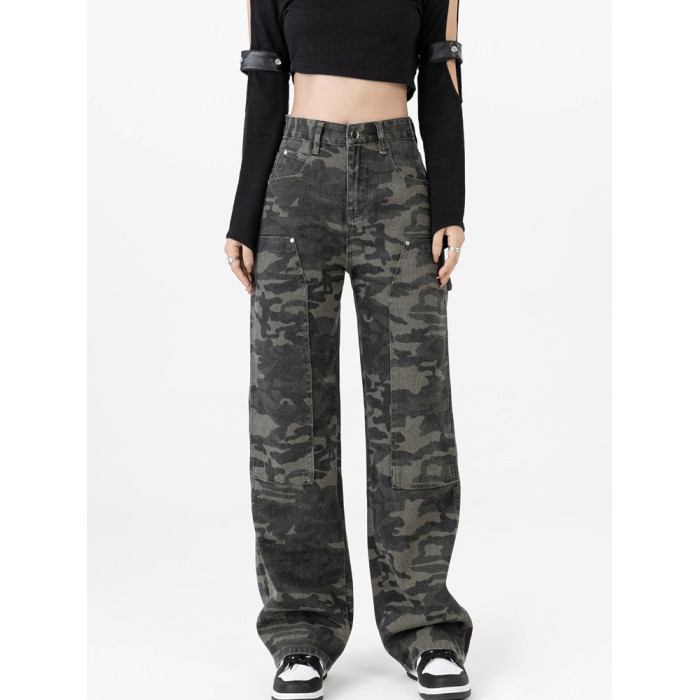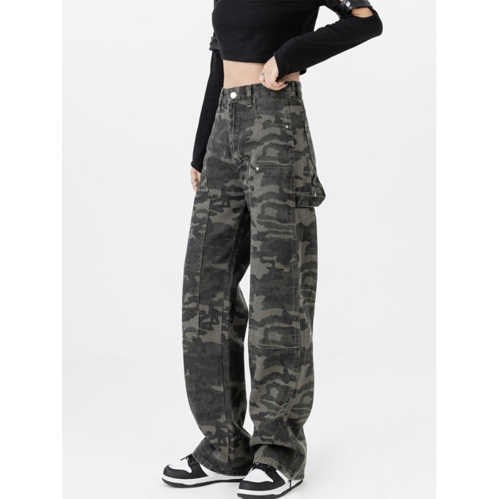 高級迷彩工裝牛仔褲女新款高街設計感寬松顯瘦時尚百搭直筒濶腿褲