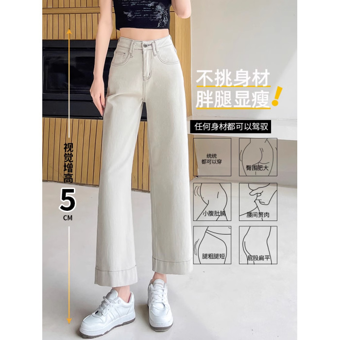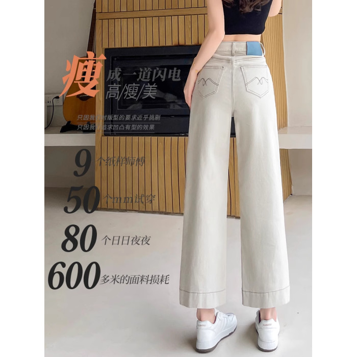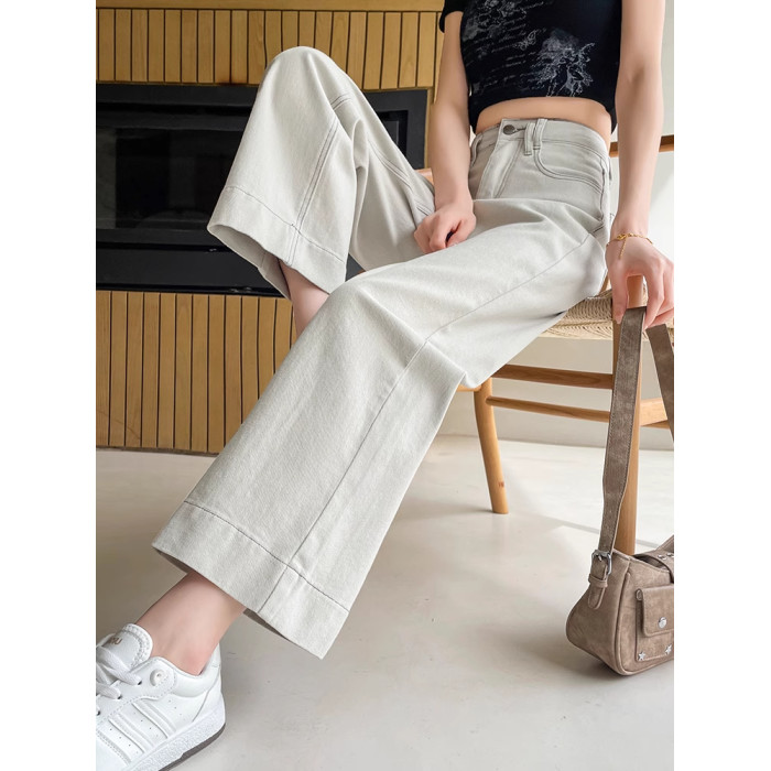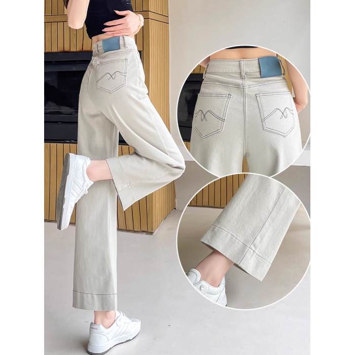 高級灰色直筒牛仔褲女夏季高腰顯瘦垂感窄版小個子百搭九分濶腿褲
