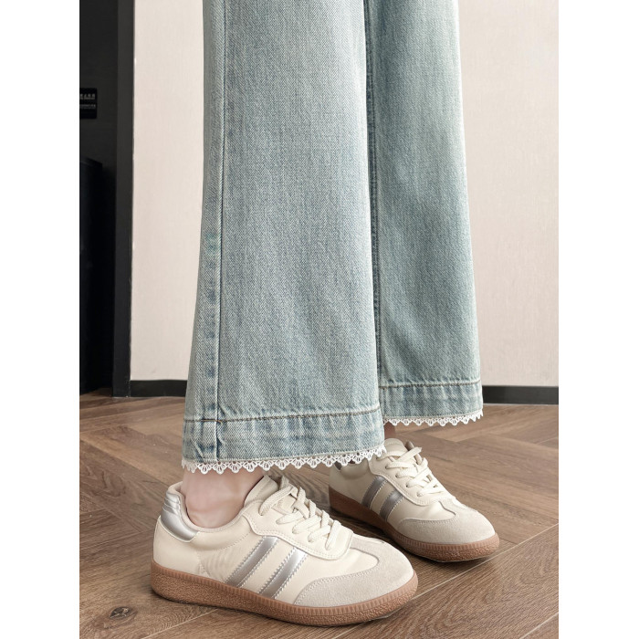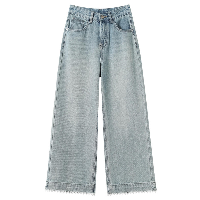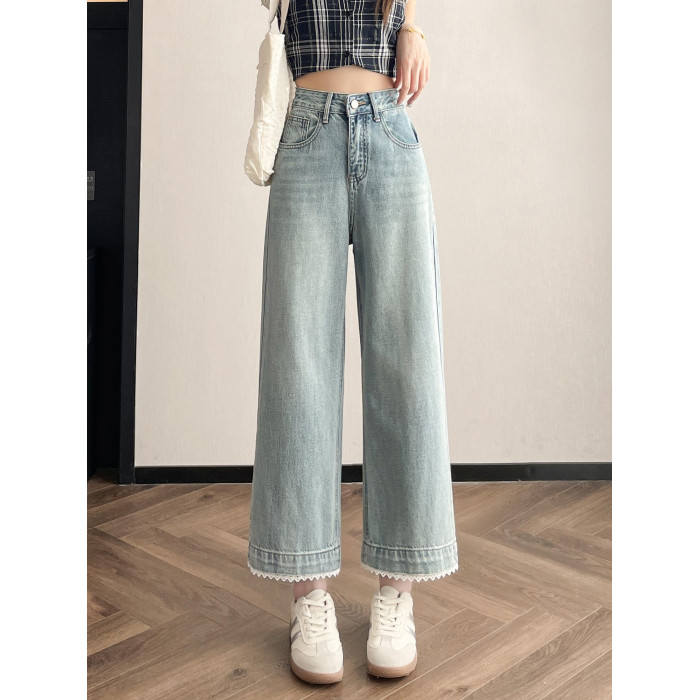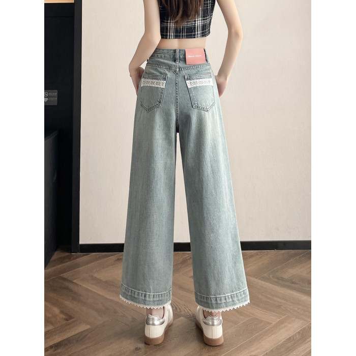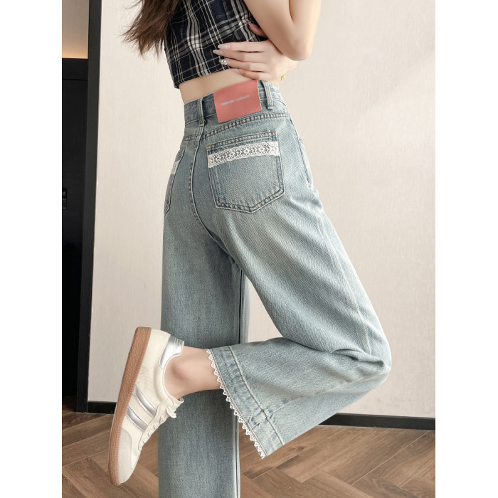 mjae蕾絲花邊牛仔褲女夏季2025年新款小個子濶腿褲薄款直筒九分褲