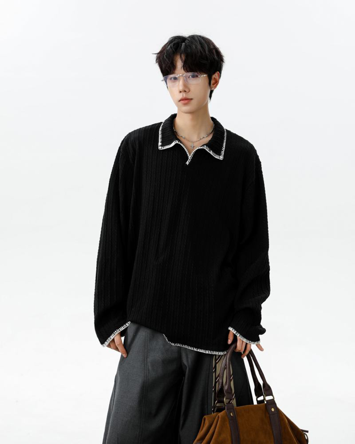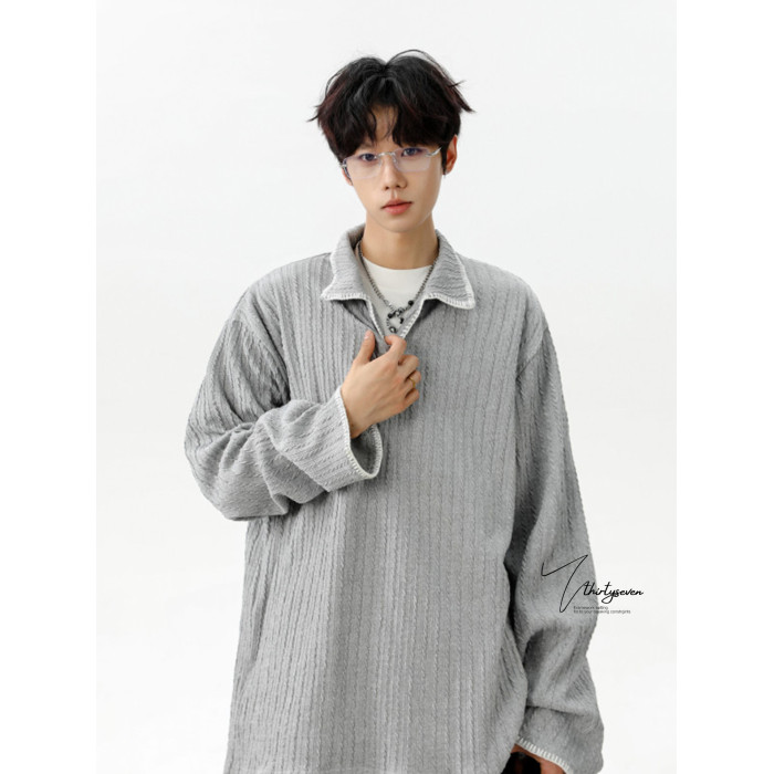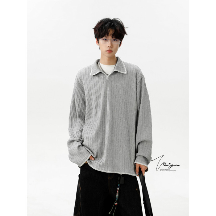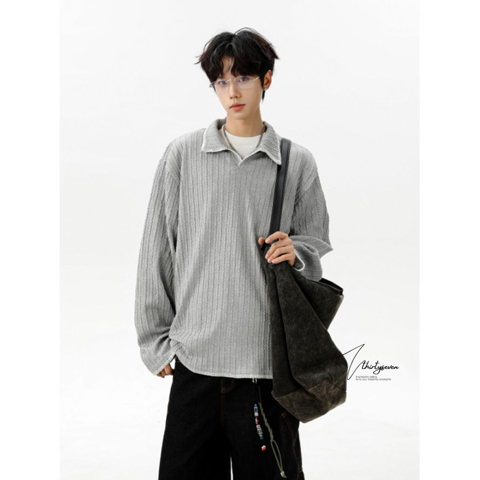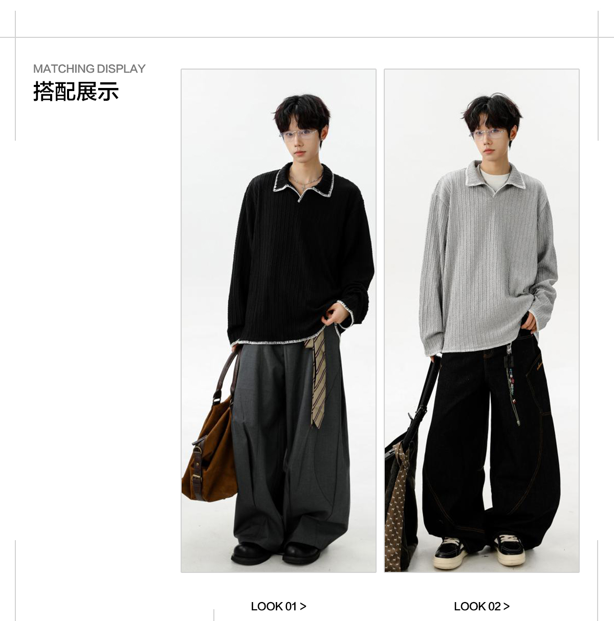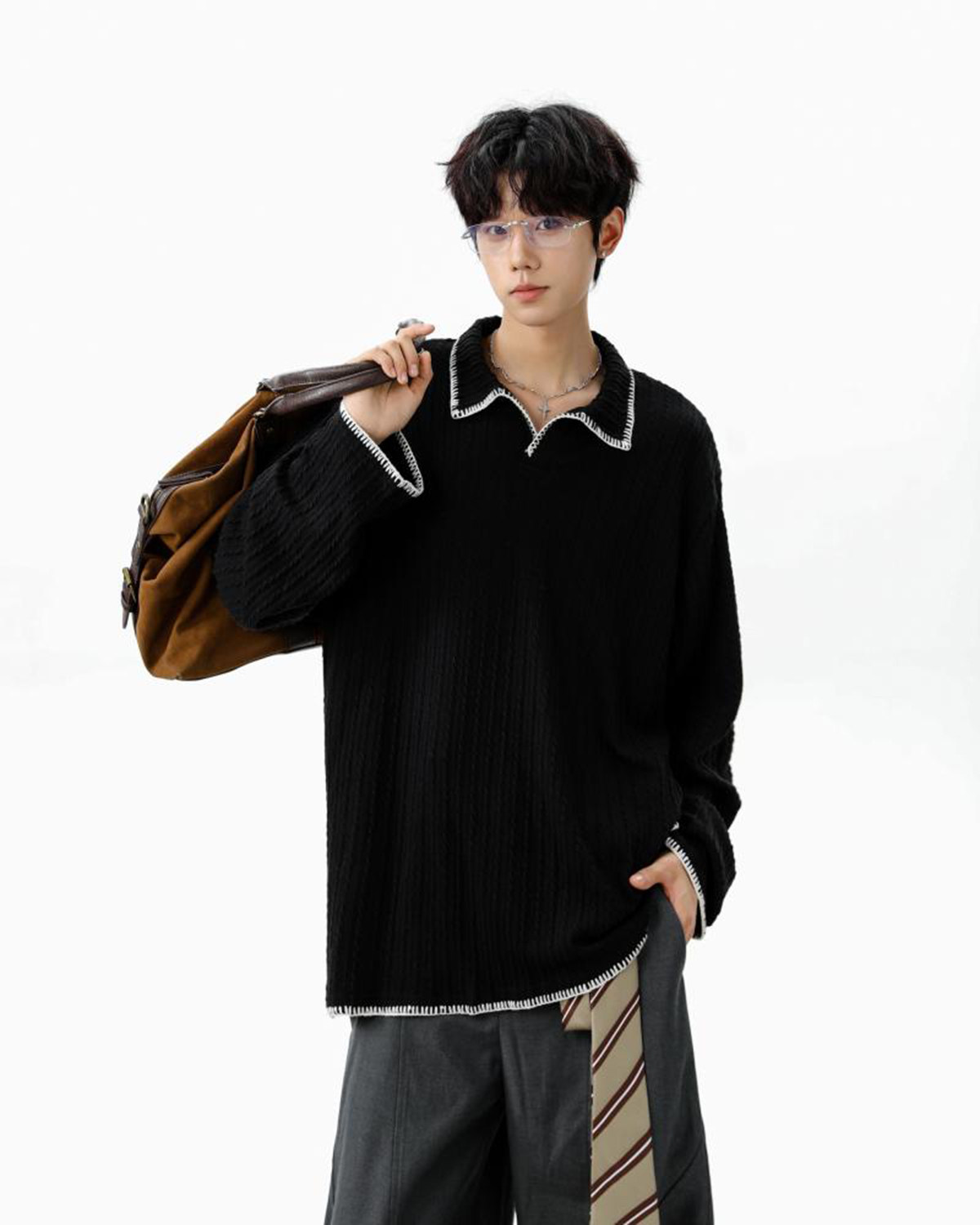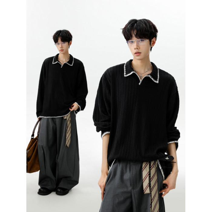 V37老錢風慵懶感翻領打底衛衣男款秋季美式肌理感潮牌撞色長袖T恤