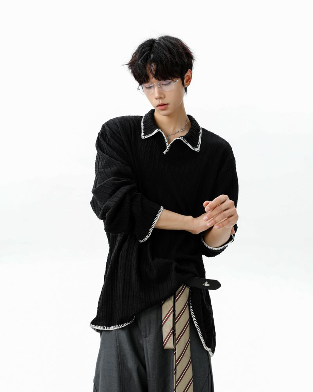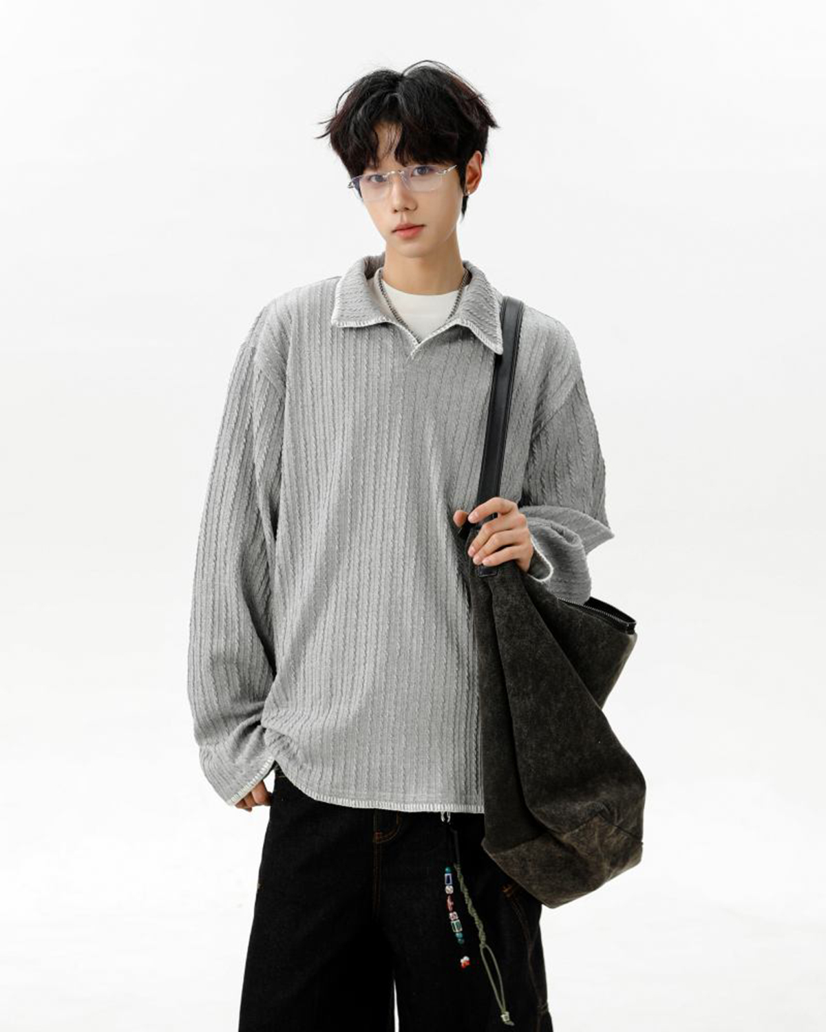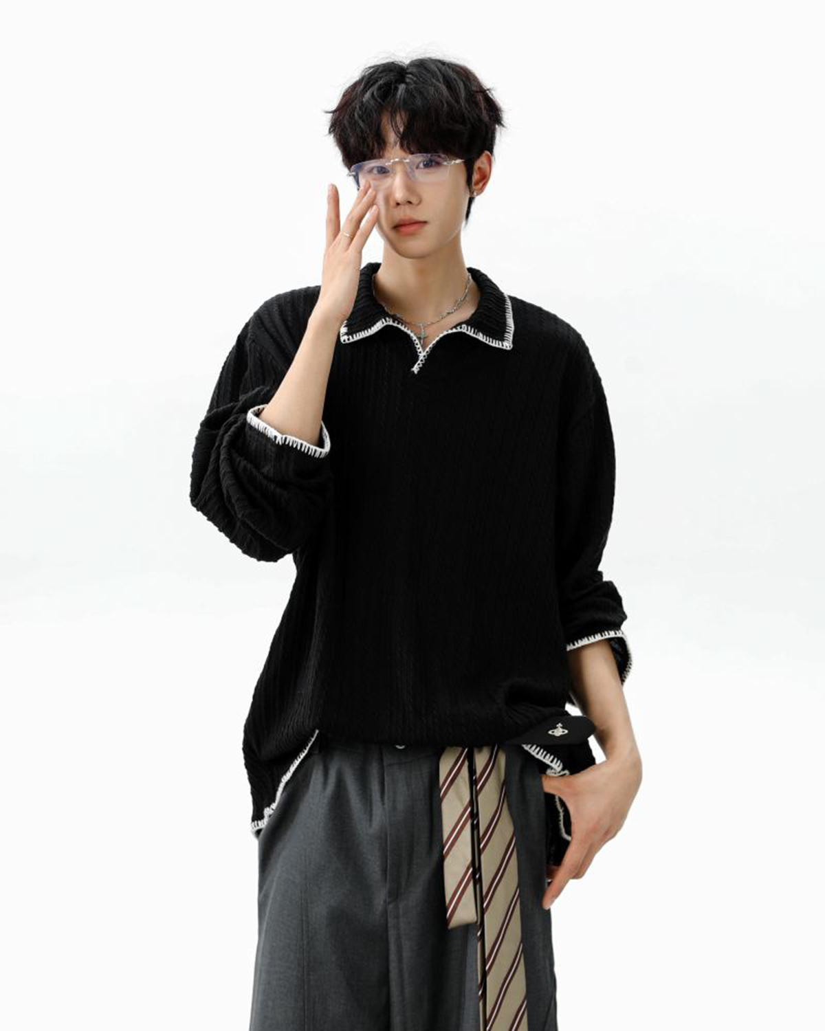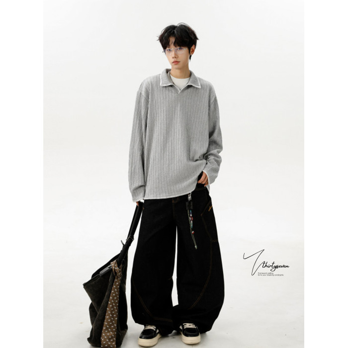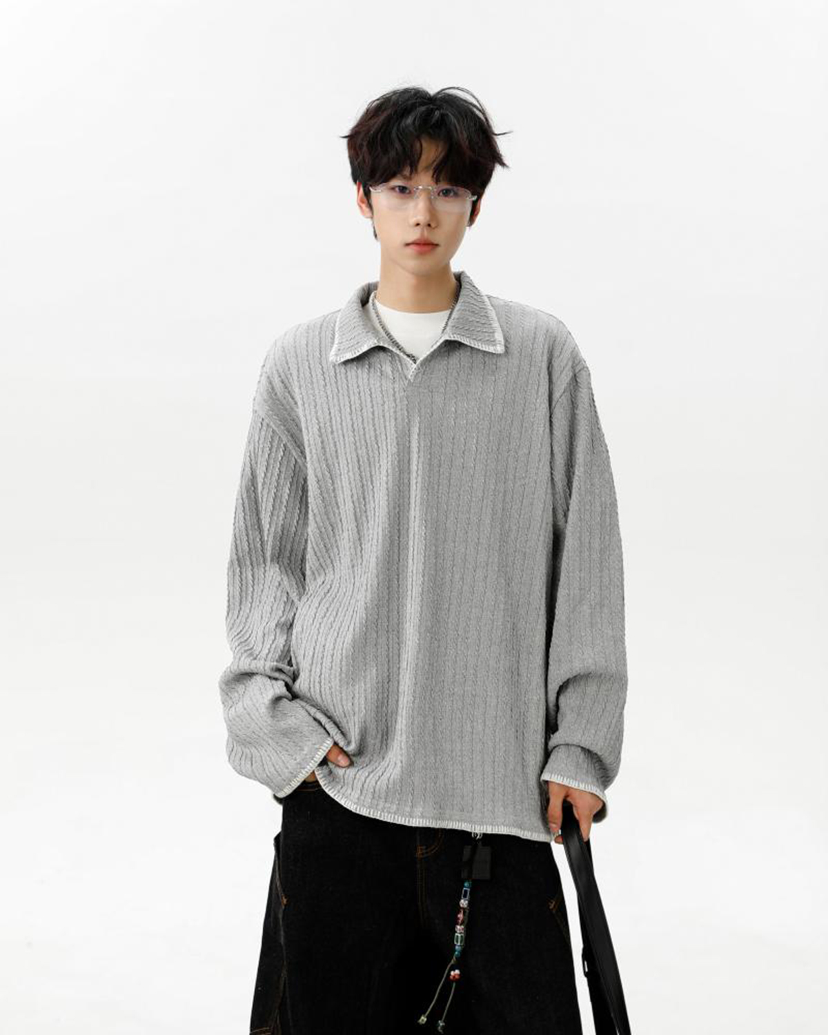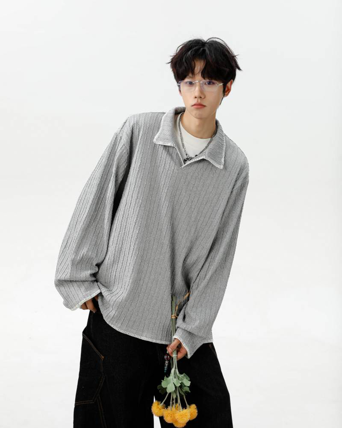 V37老錢風慵懶感翻領打底衛衣男款秋季美式肌理感潮牌撞色長袖T恤