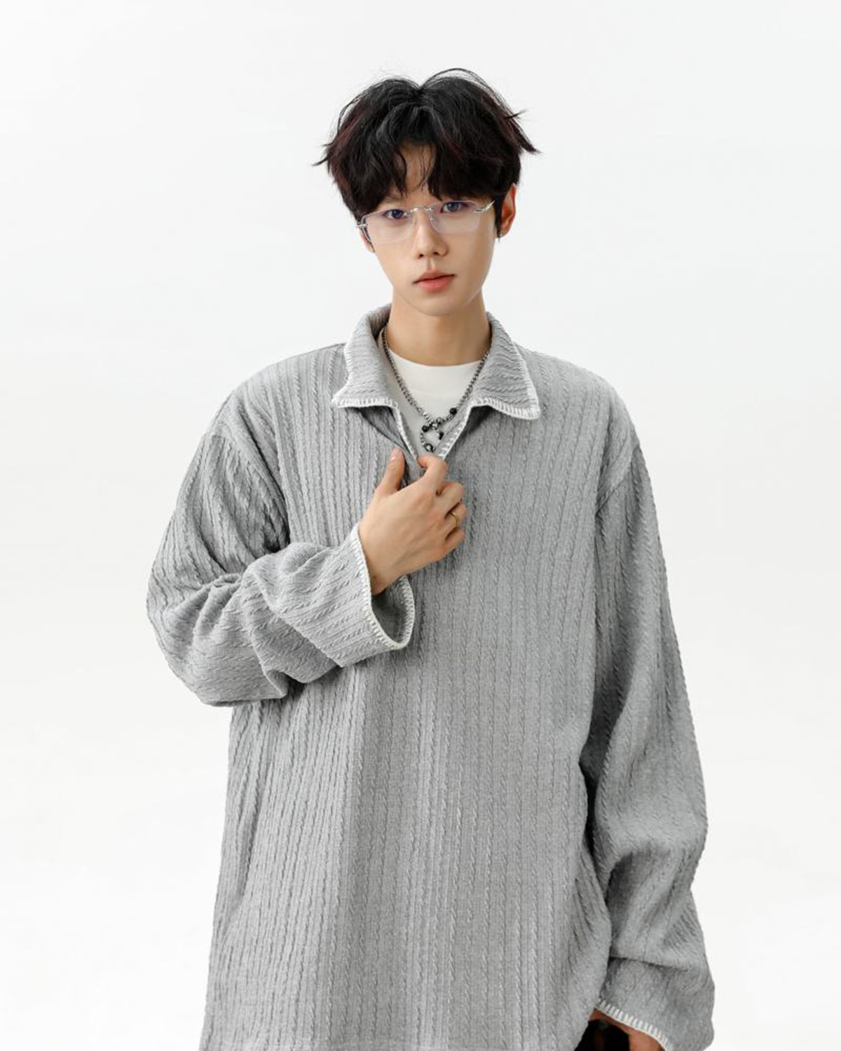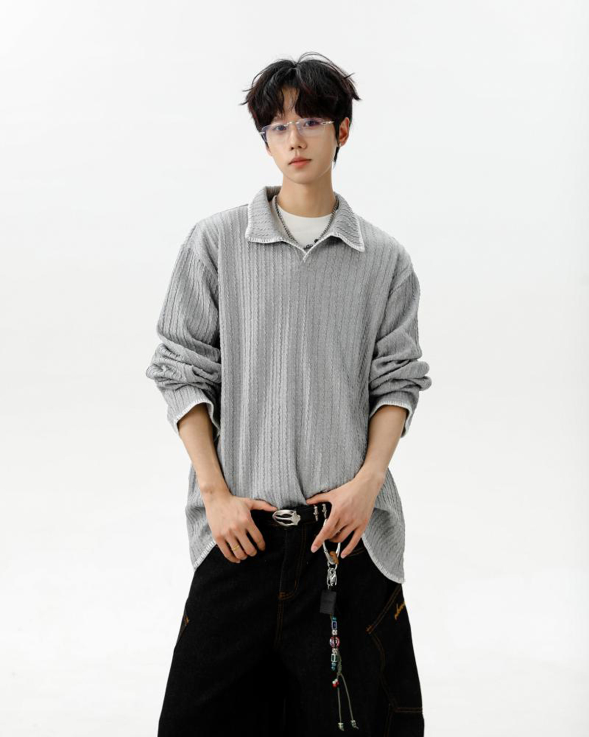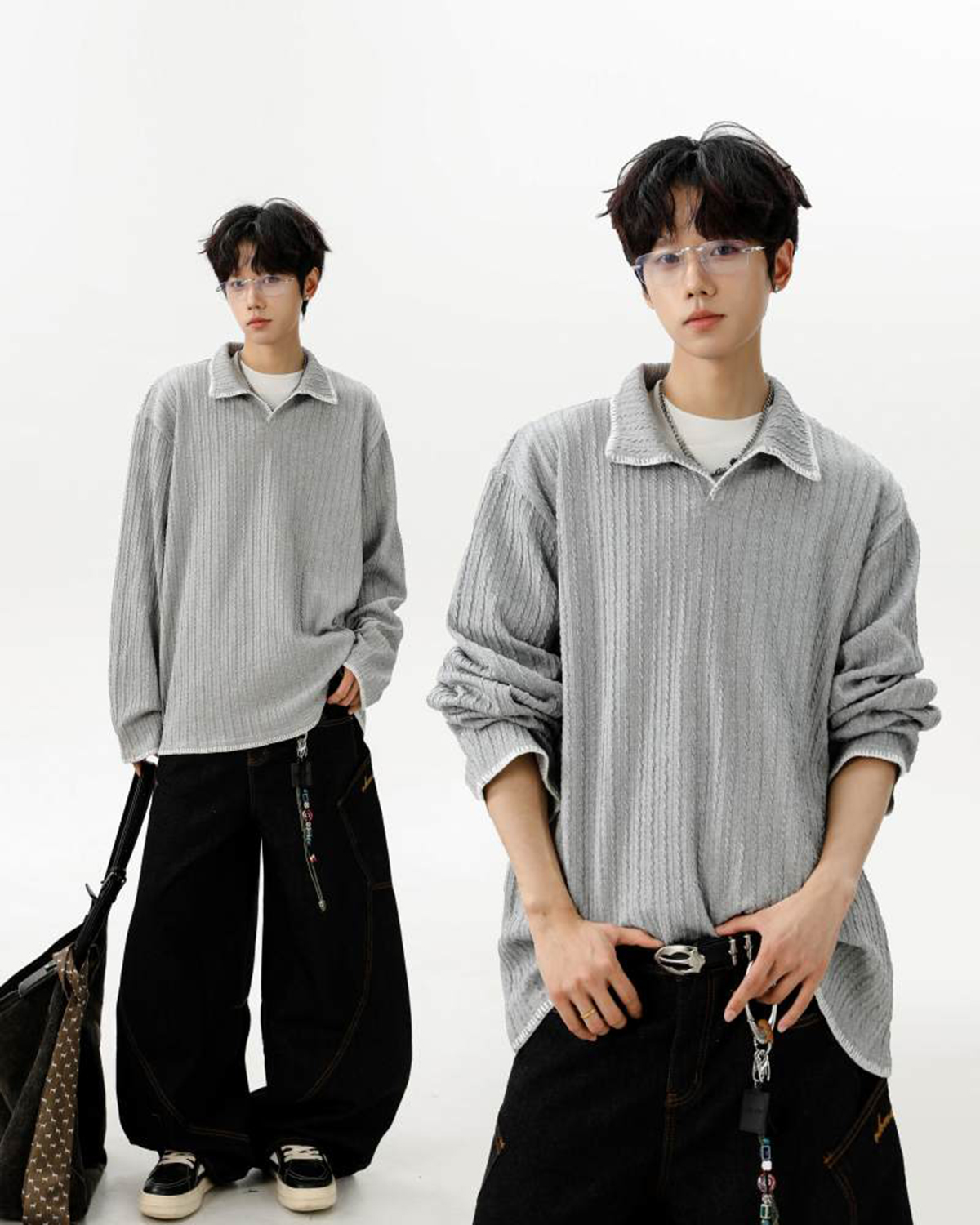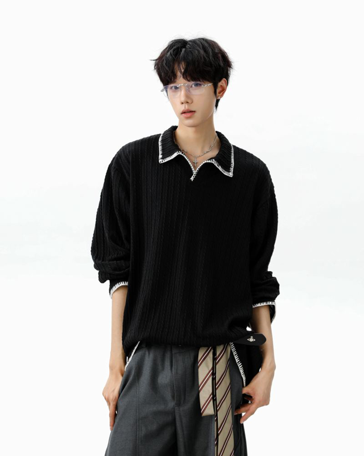 V37老錢風慵懶感翻領打底衛衣男款秋季美式肌理感潮牌撞色長袖T恤