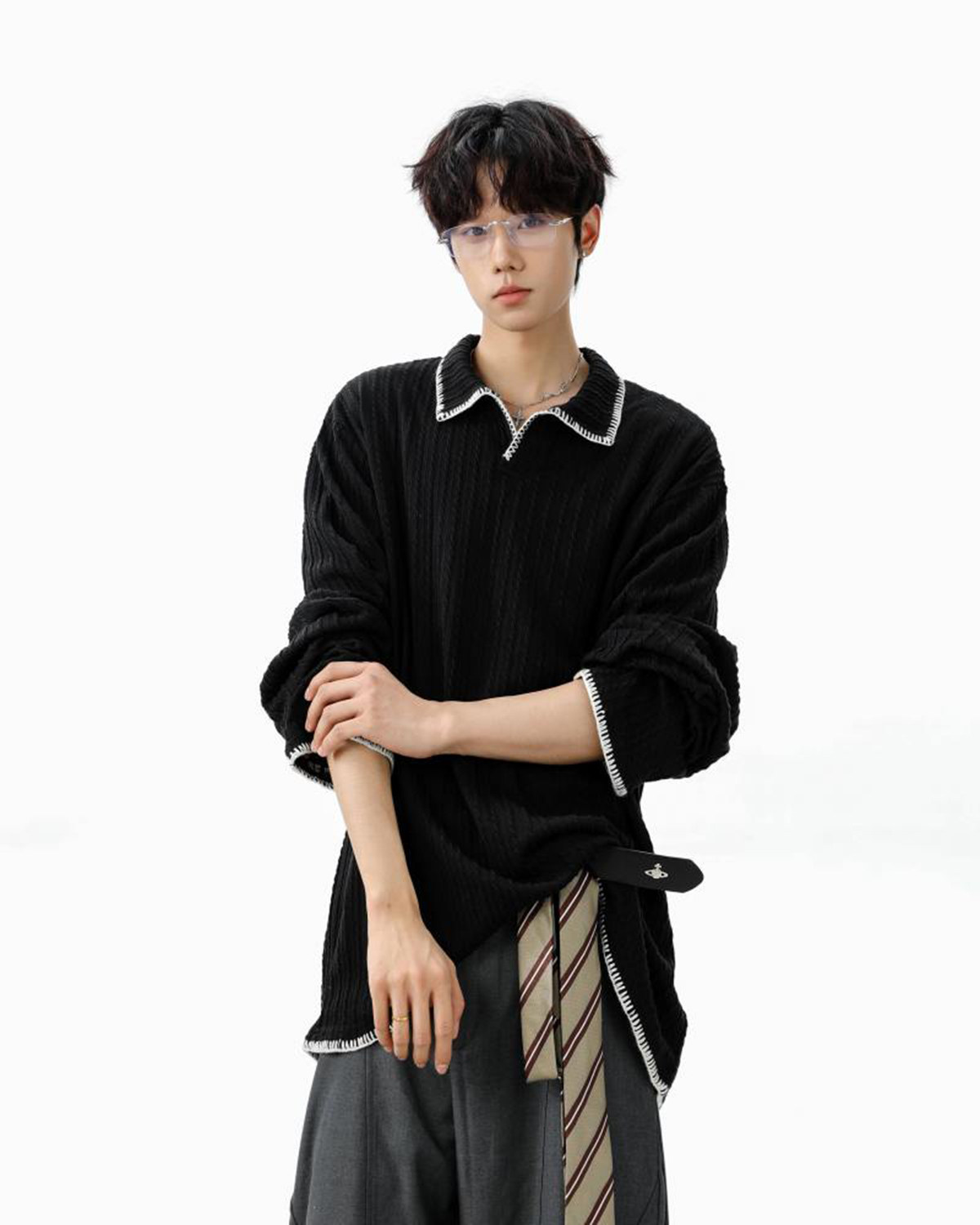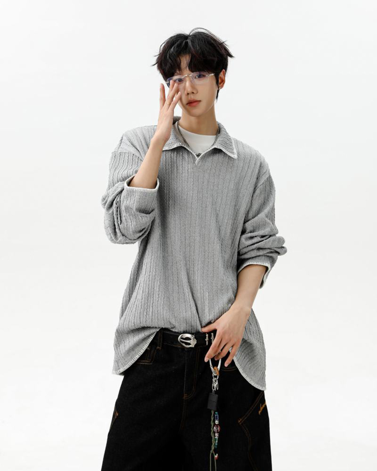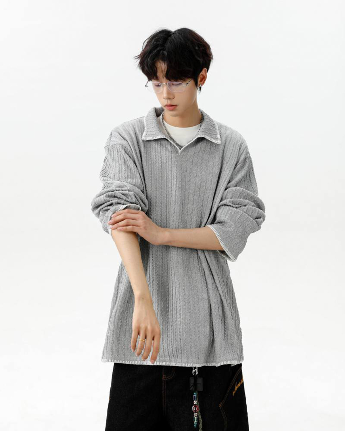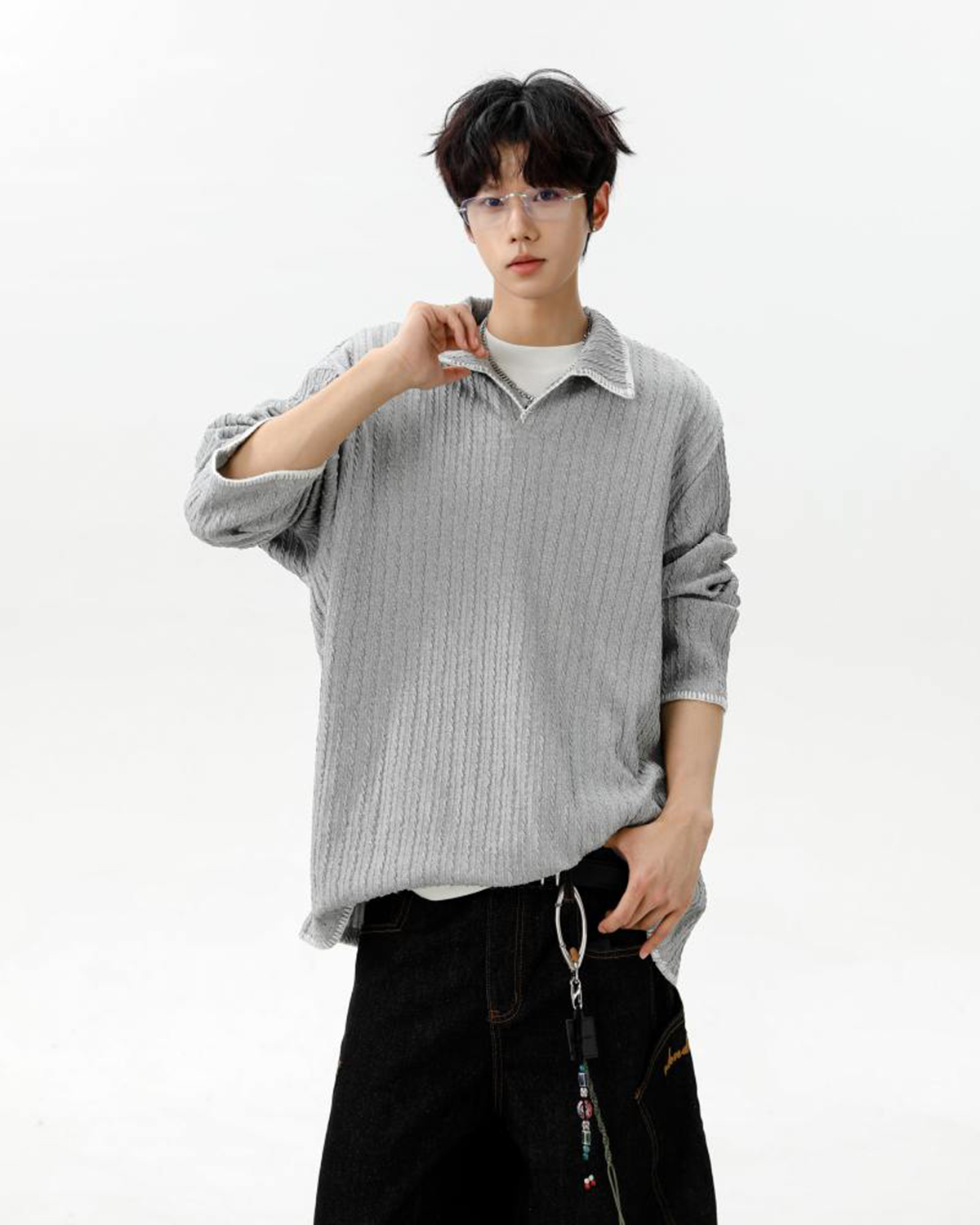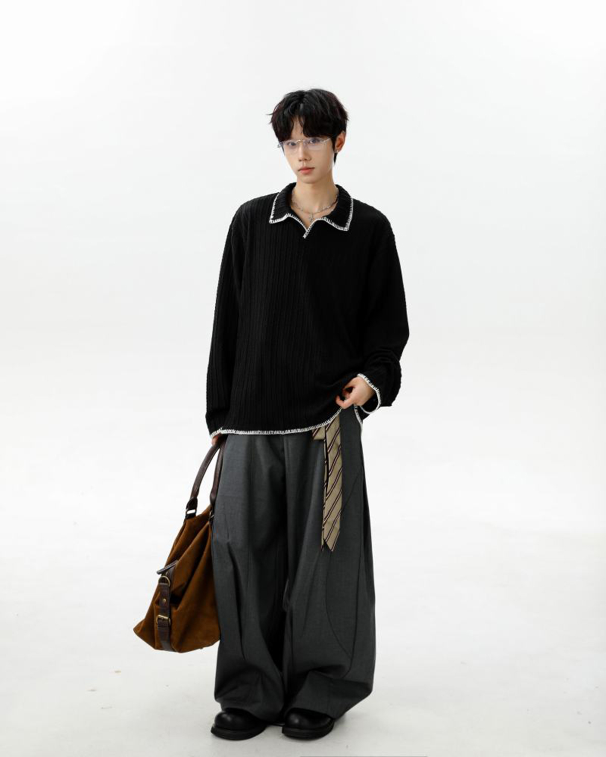 V37老錢風慵懶感翻領打底衛衣男款秋季美式肌理感潮牌撞色長袖T恤