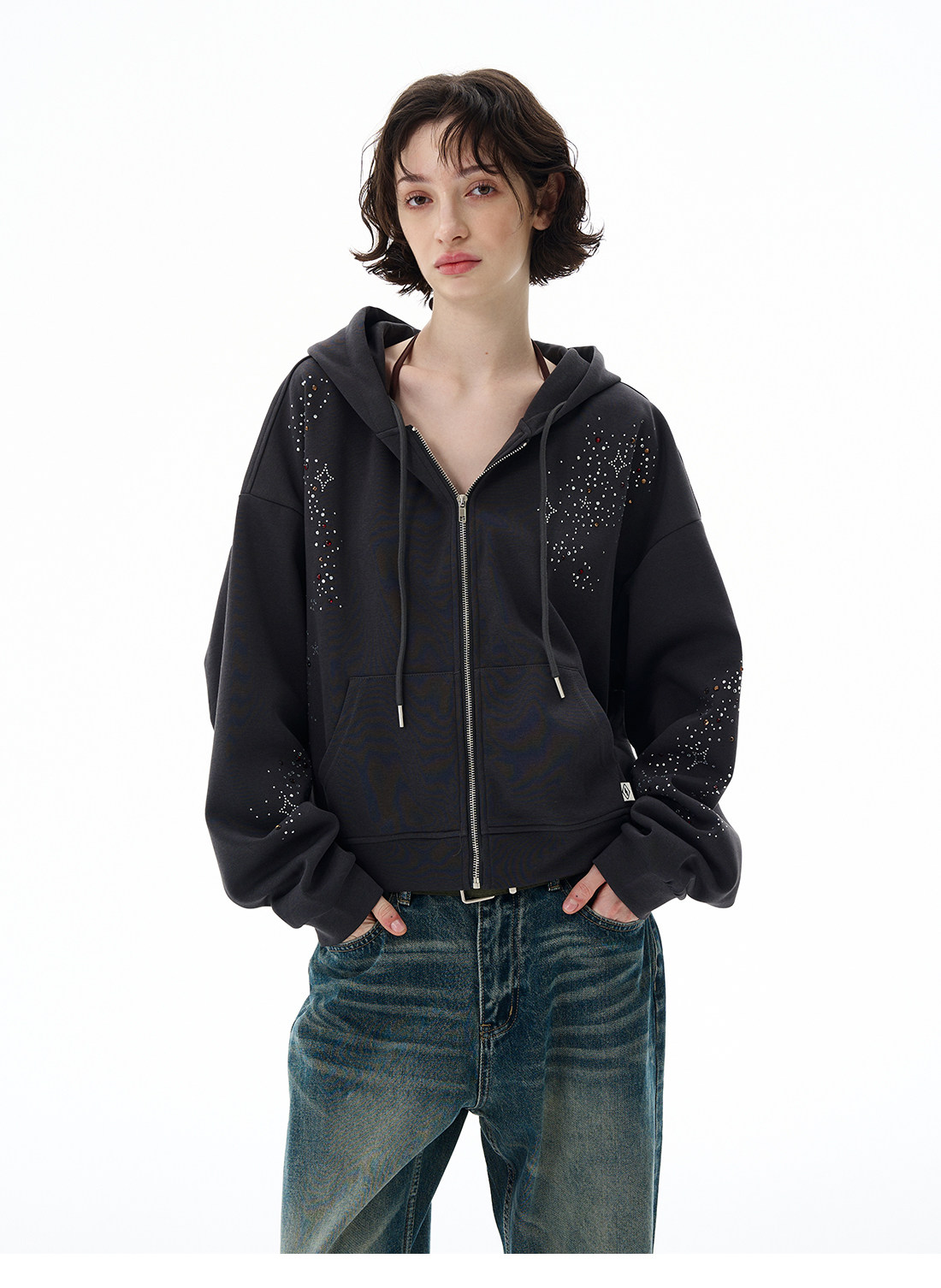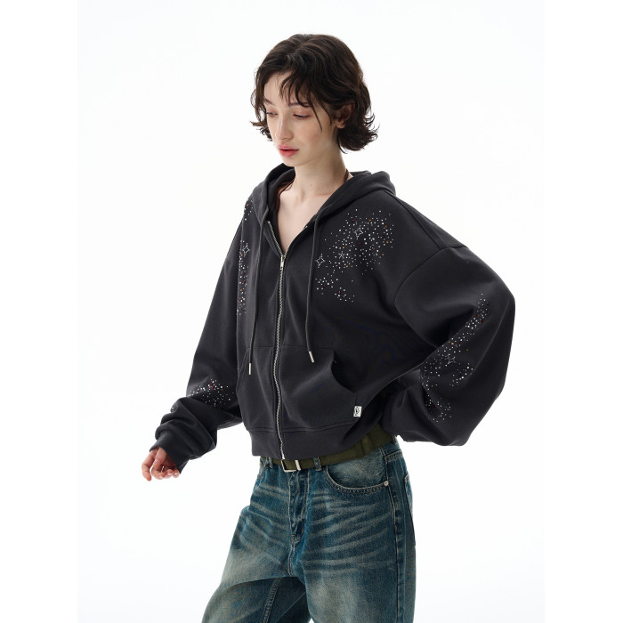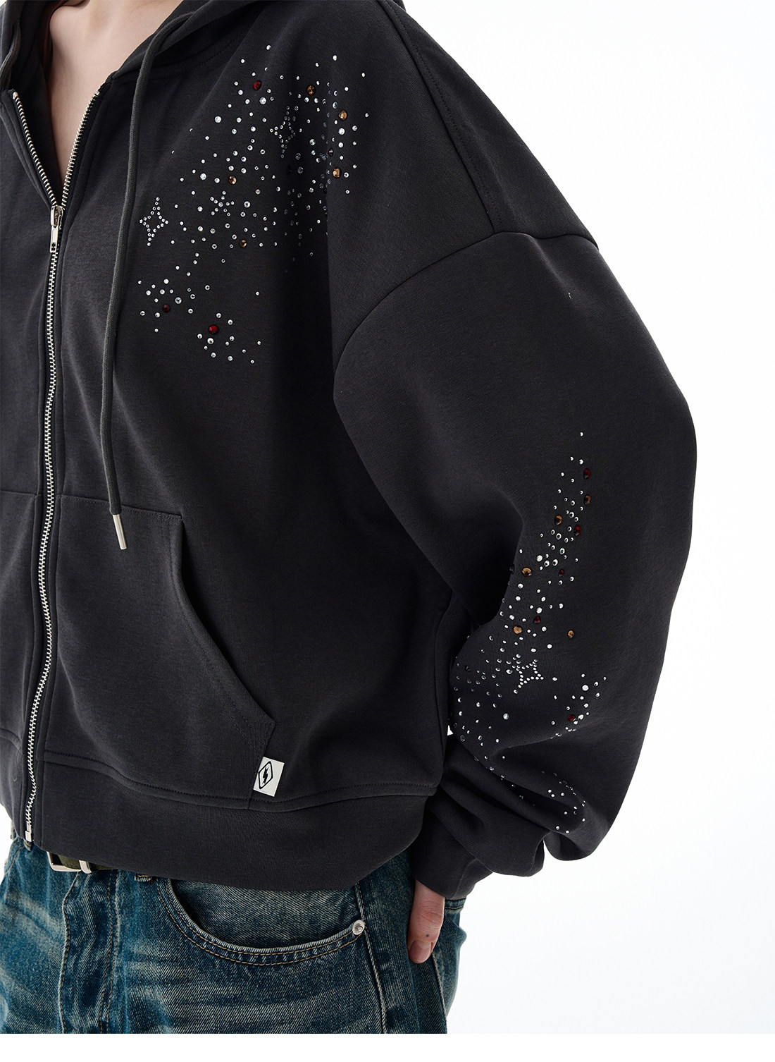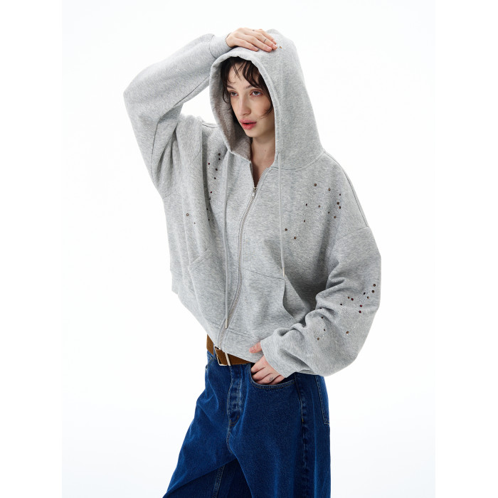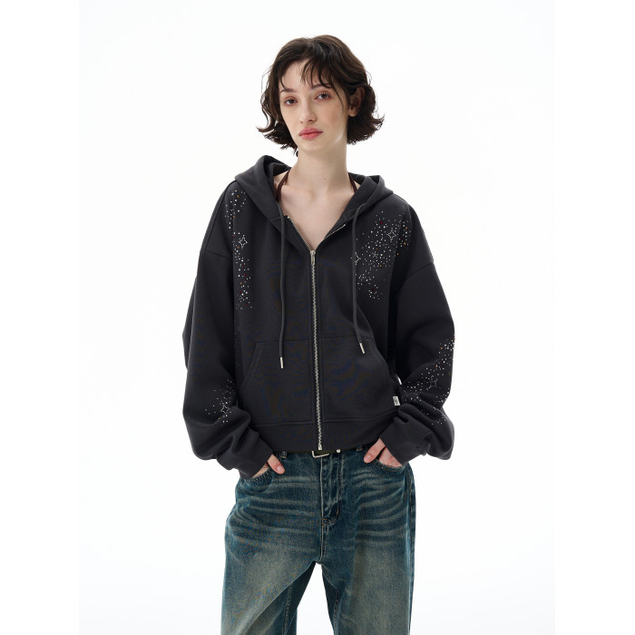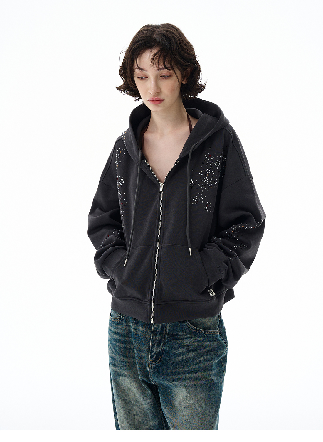 尾郎的店秋冬美式復古燙鑽開衫拉鍊衛衣男女設計感小衆外套情侶潮