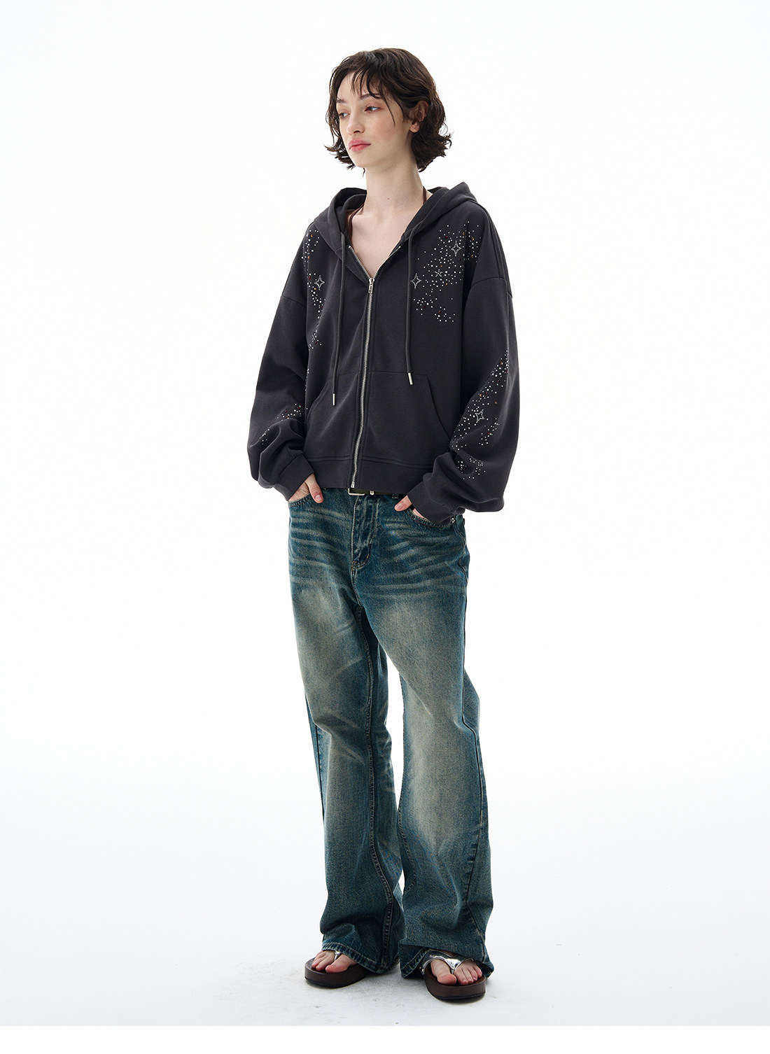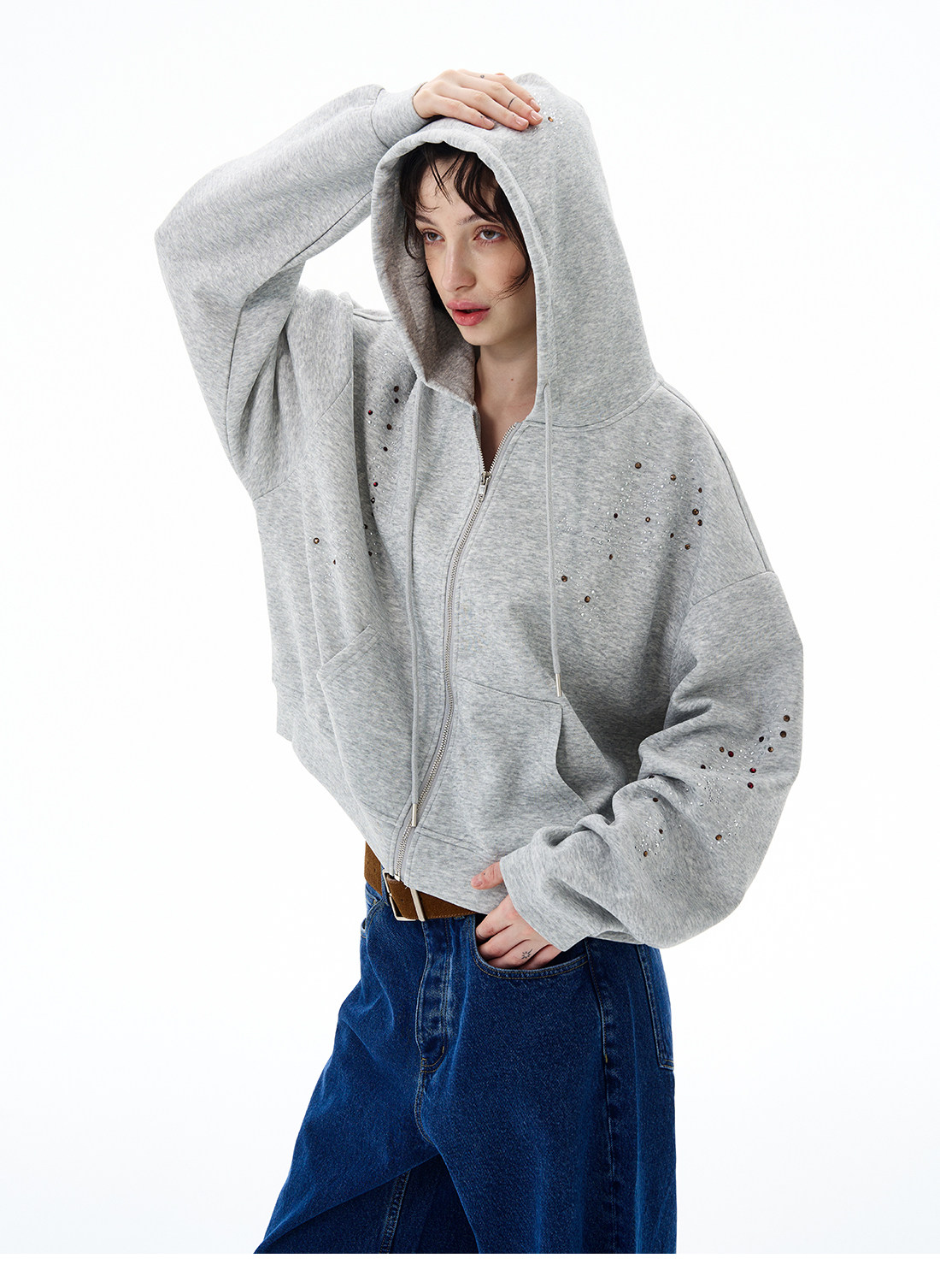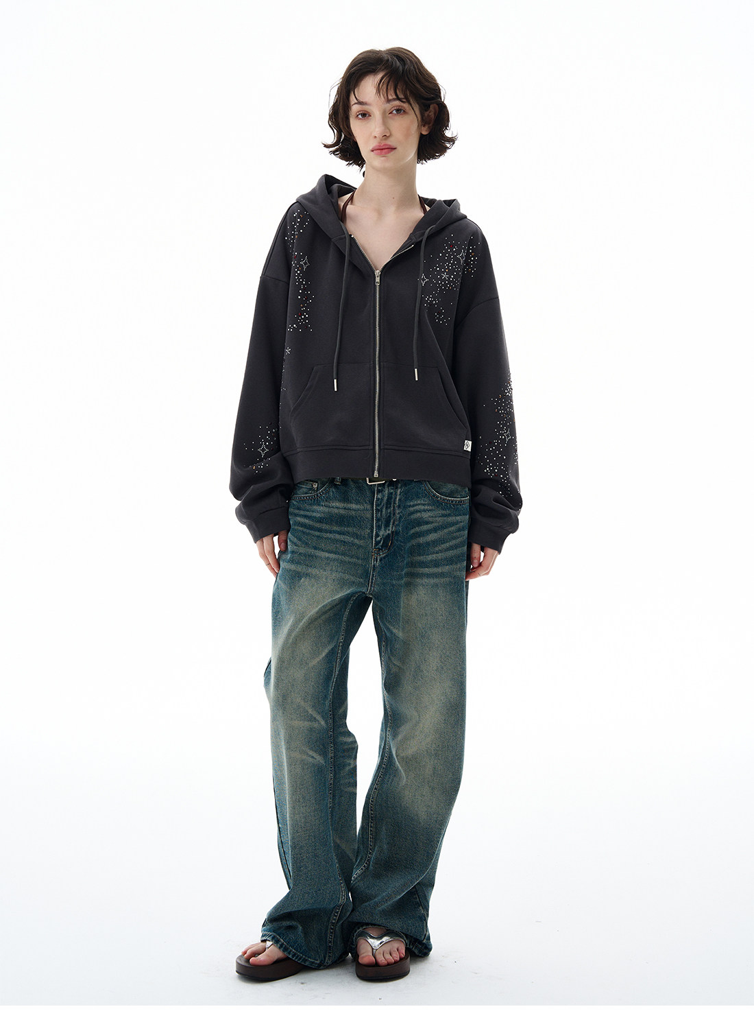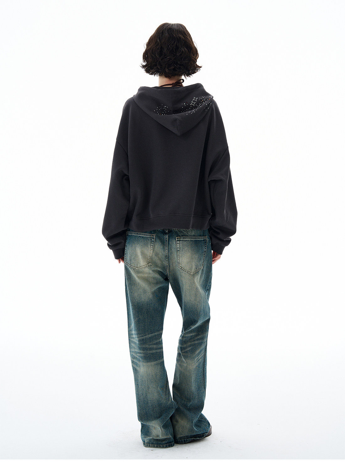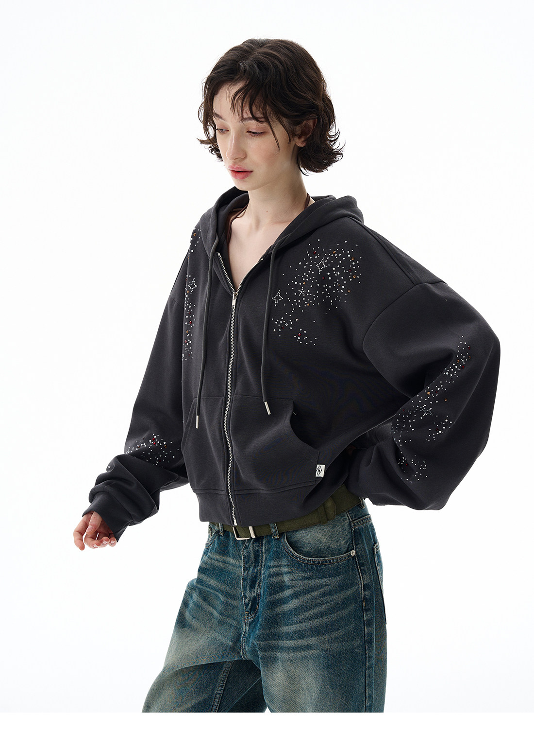 尾郎的店秋冬美式復古燙鑽開衫拉鍊衛衣男女設計感小衆外套情侶潮