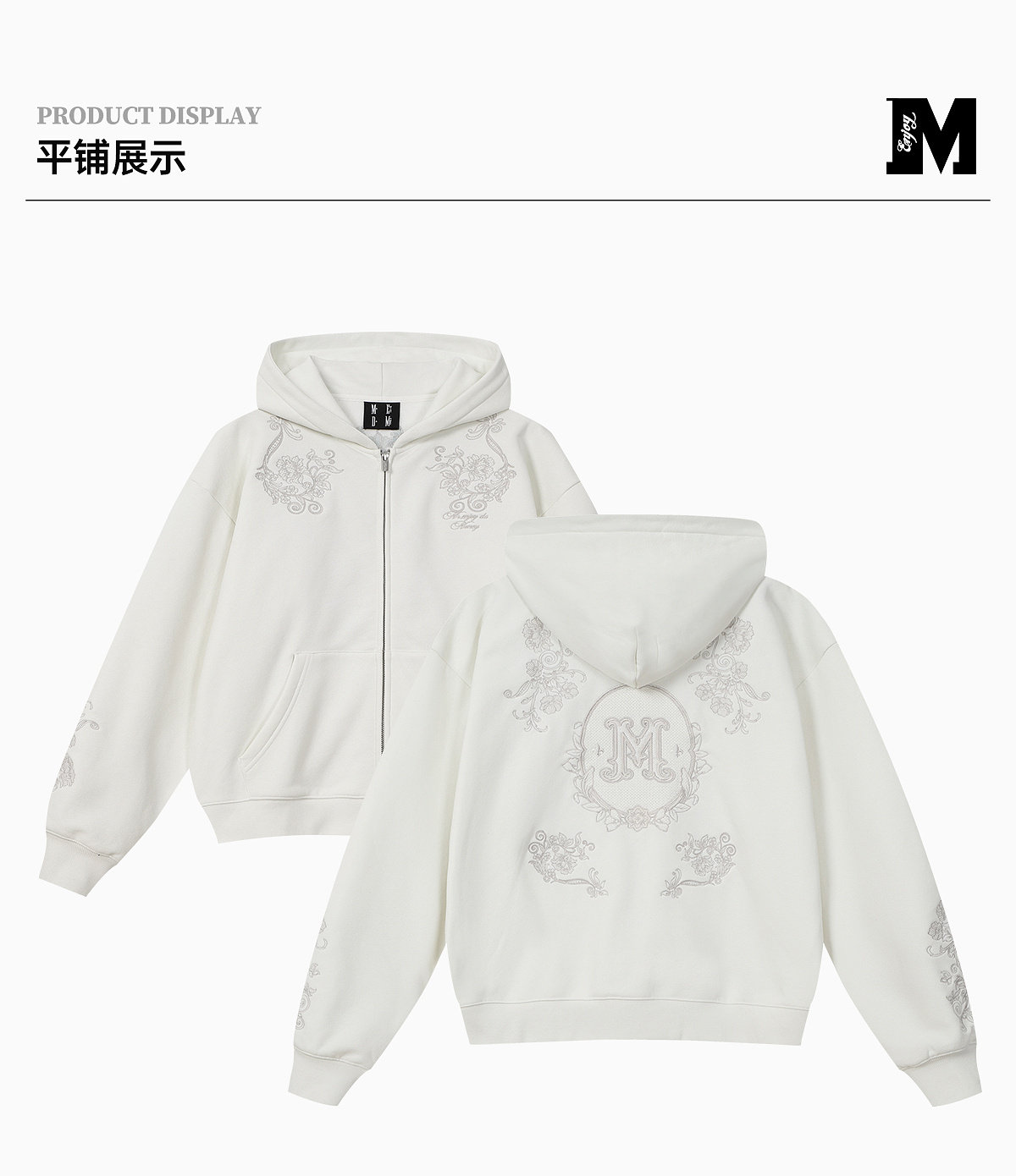 MEDM重磅刺綉花紋休閒拉鍊帽衫美式通勤寬松情侶連帽衛衣春秋