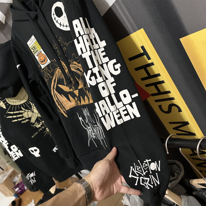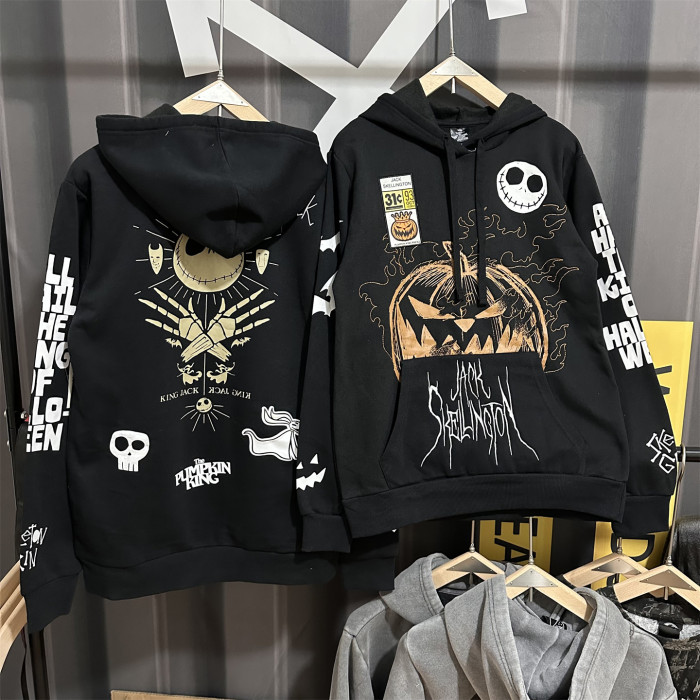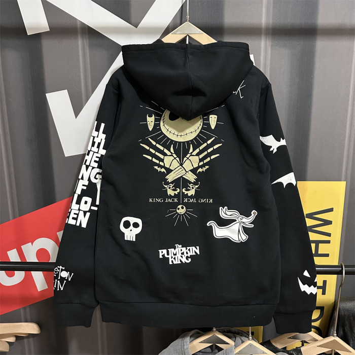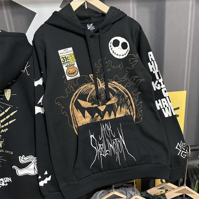 美單男女士衛衣帽衫加絨刺綉印花卡通聖誕驚魂夜傑克骷髏美式休閒
