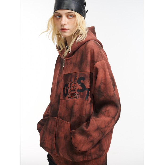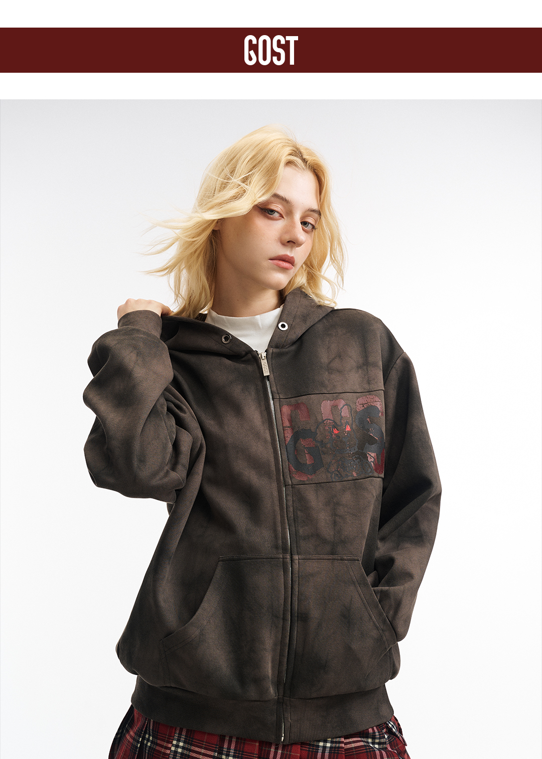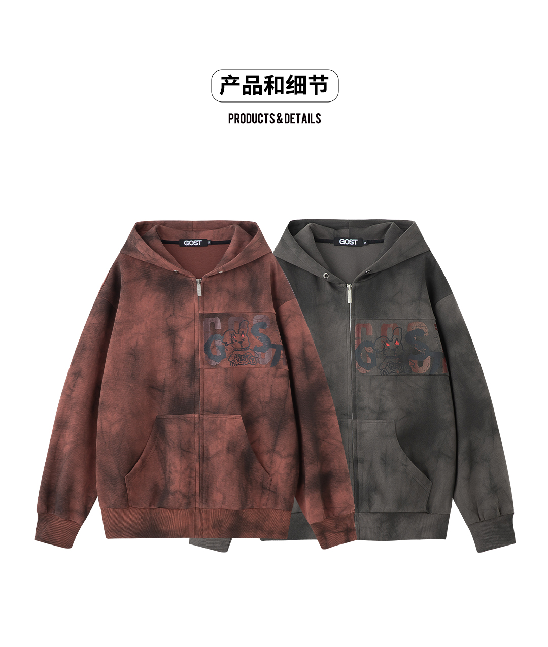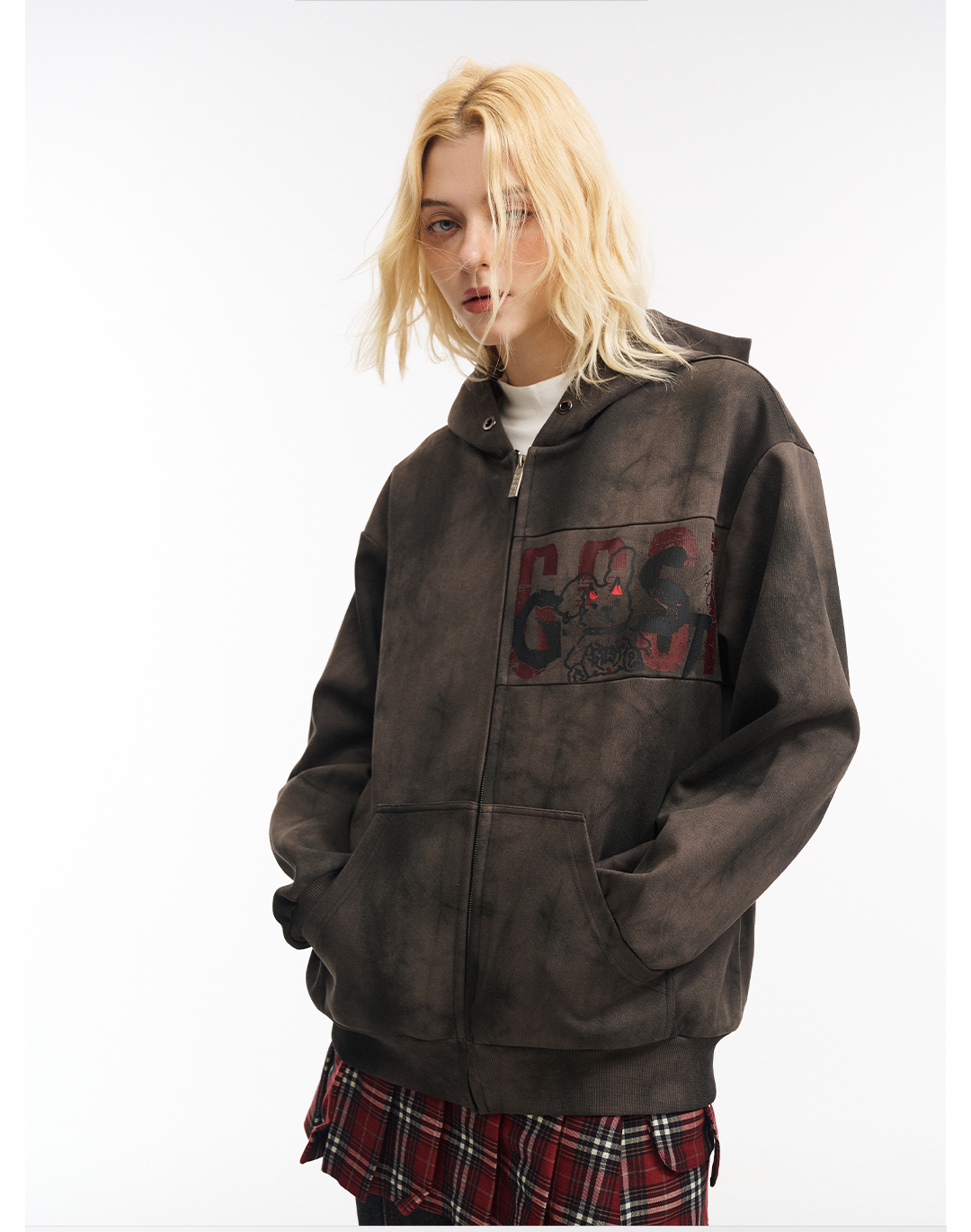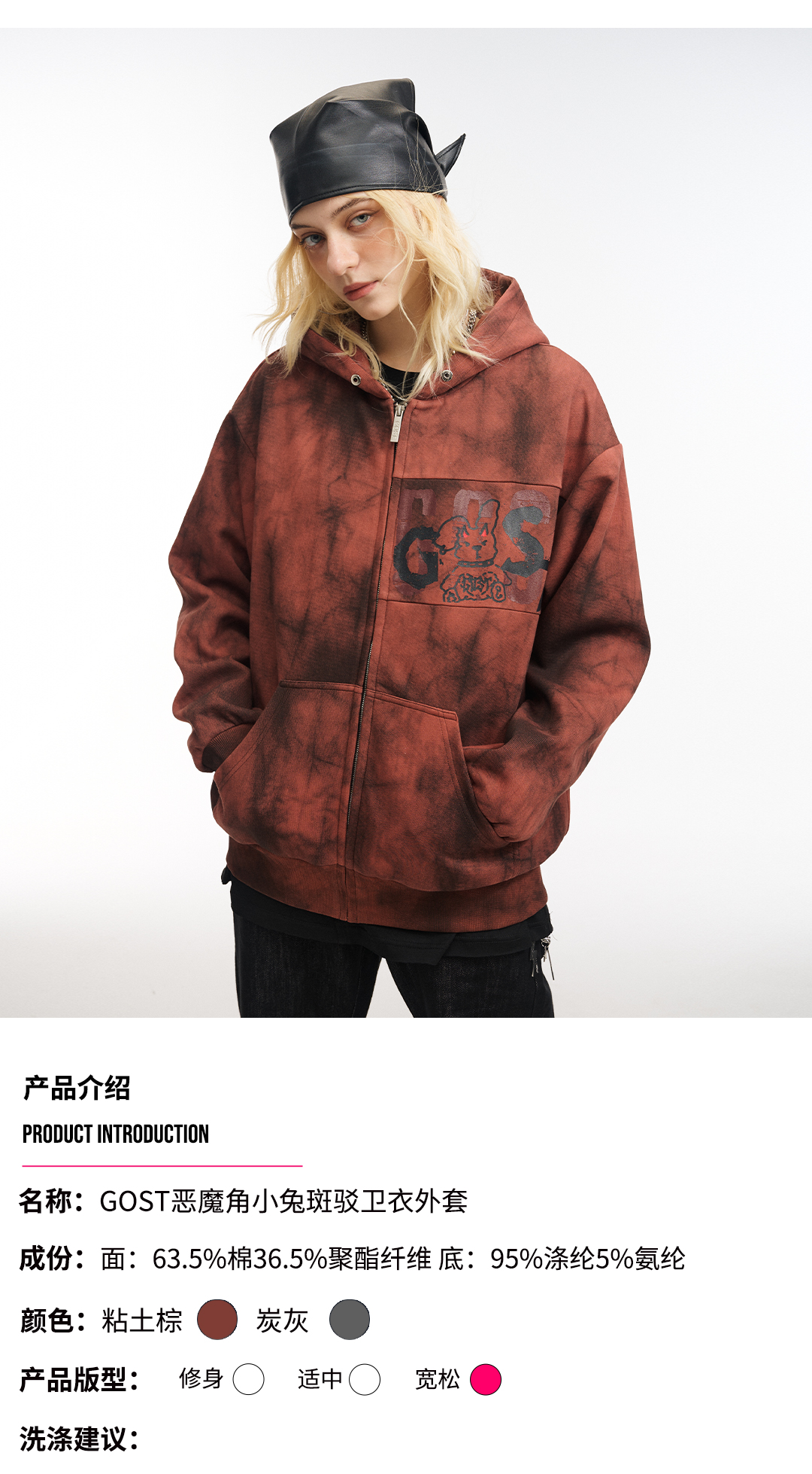 GOST美式復古惡魔角小兔斑駁迷彩拉鍊衛衣女連帽衫情侶款開衫外套