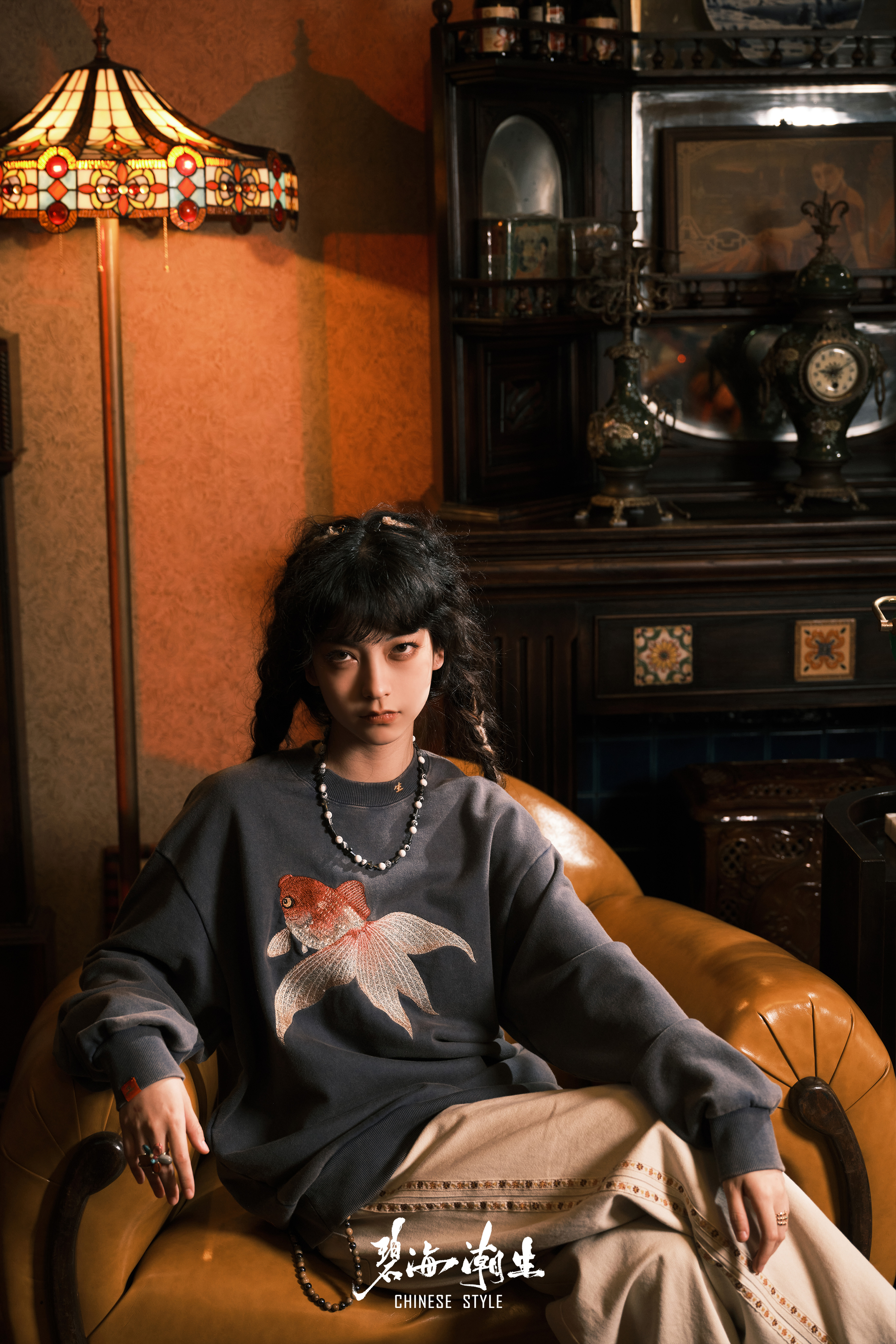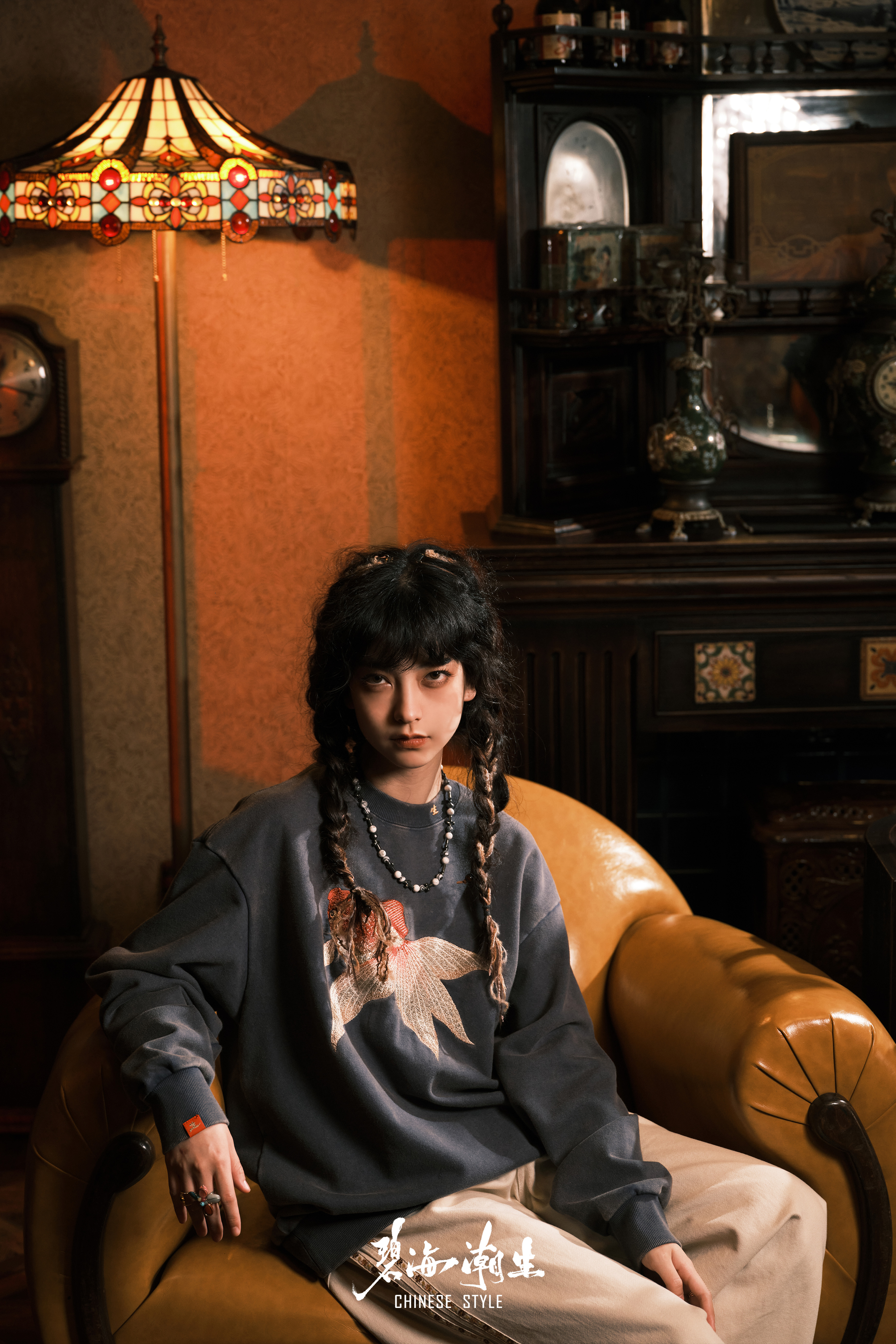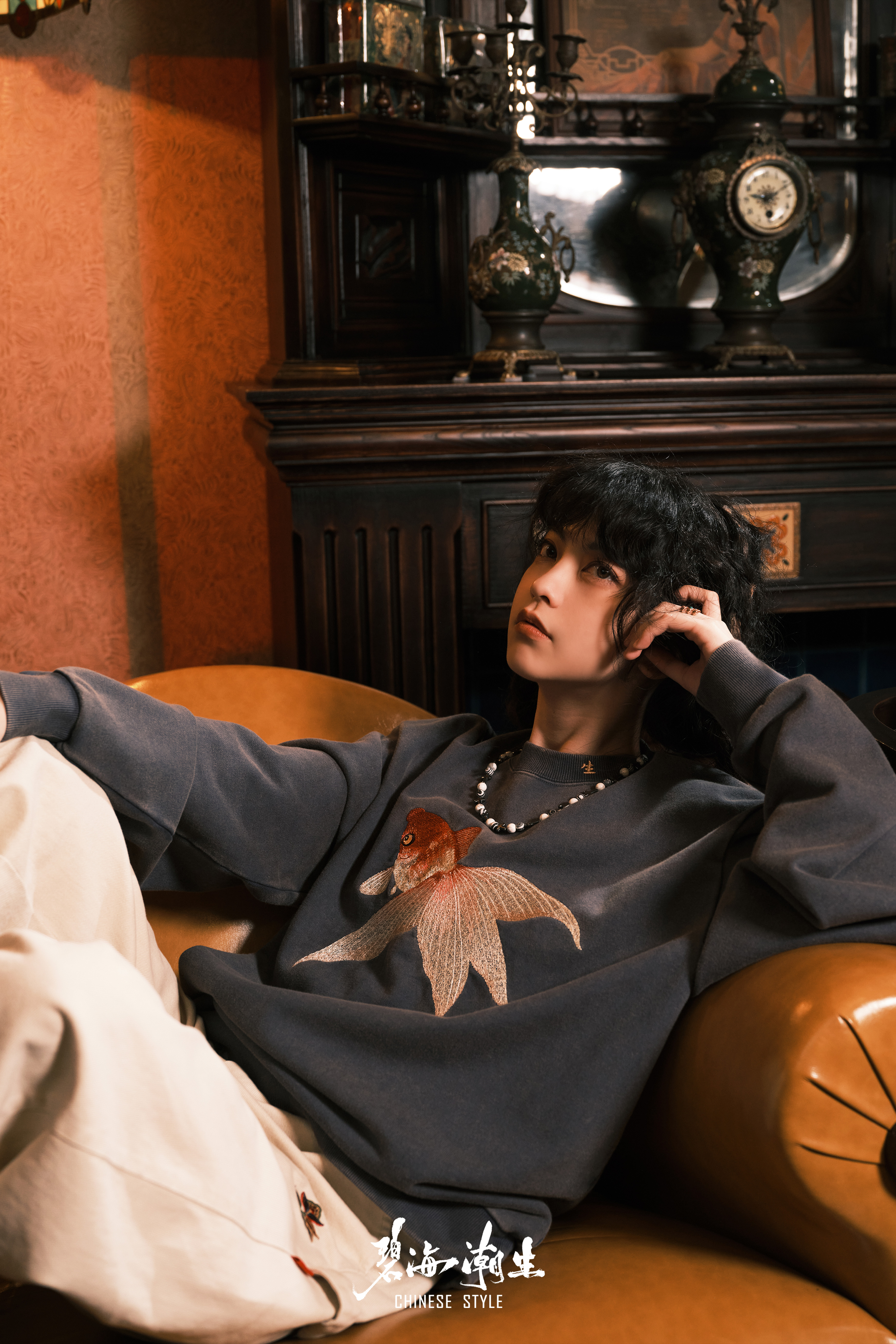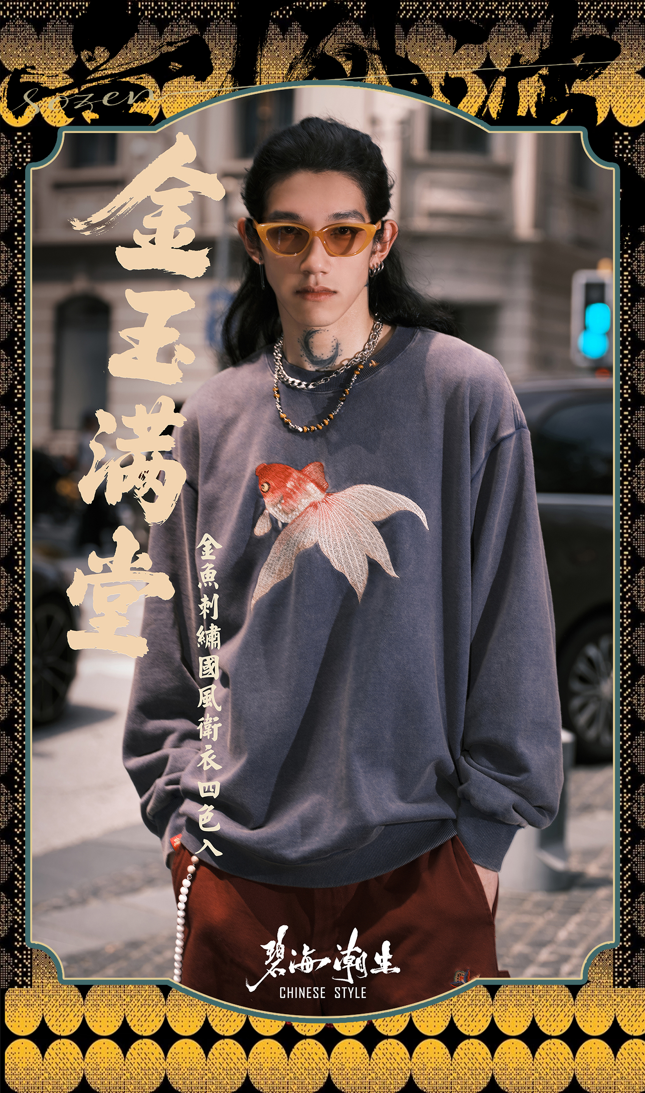 碧海潮生【金玉滿堂•藍】秋冬新款風國潮刺綉套頭圓領衛衣