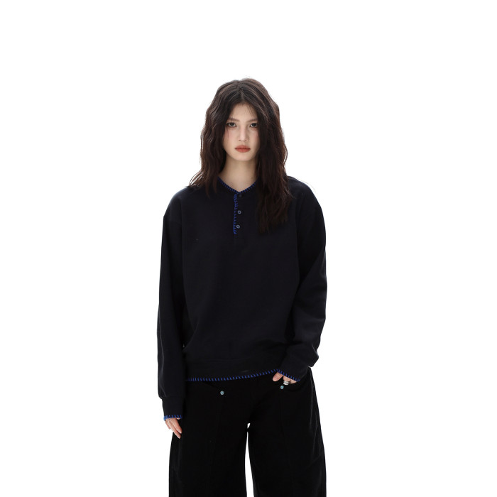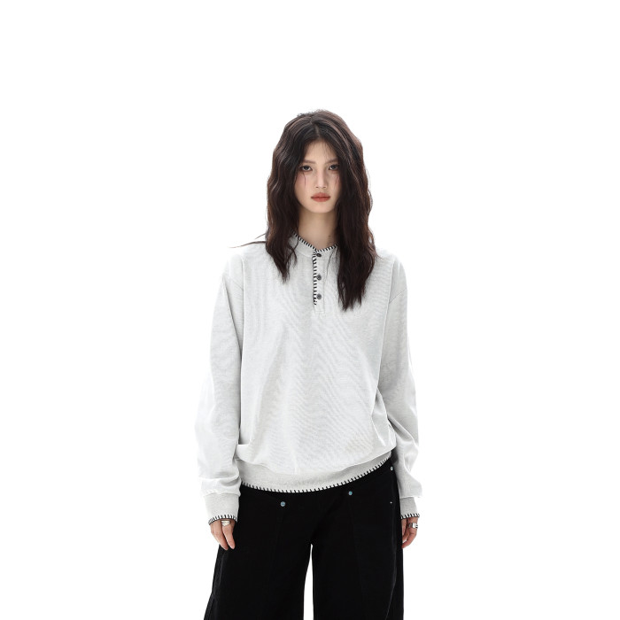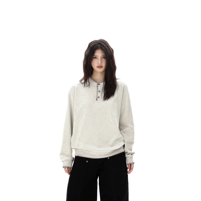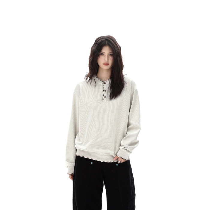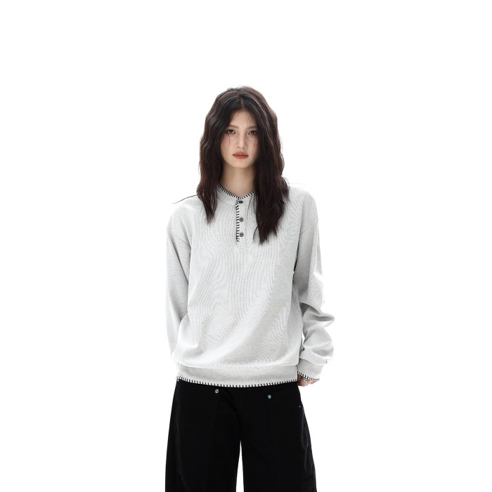 AFOEOT秋季美式手縫線亨利領針織衛衣男女老錢風休閒寬松長袖上衣