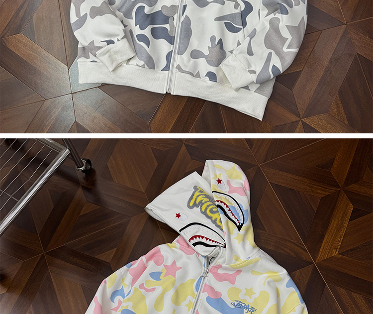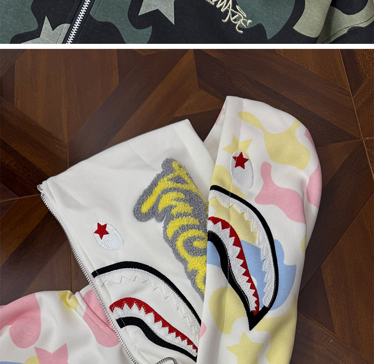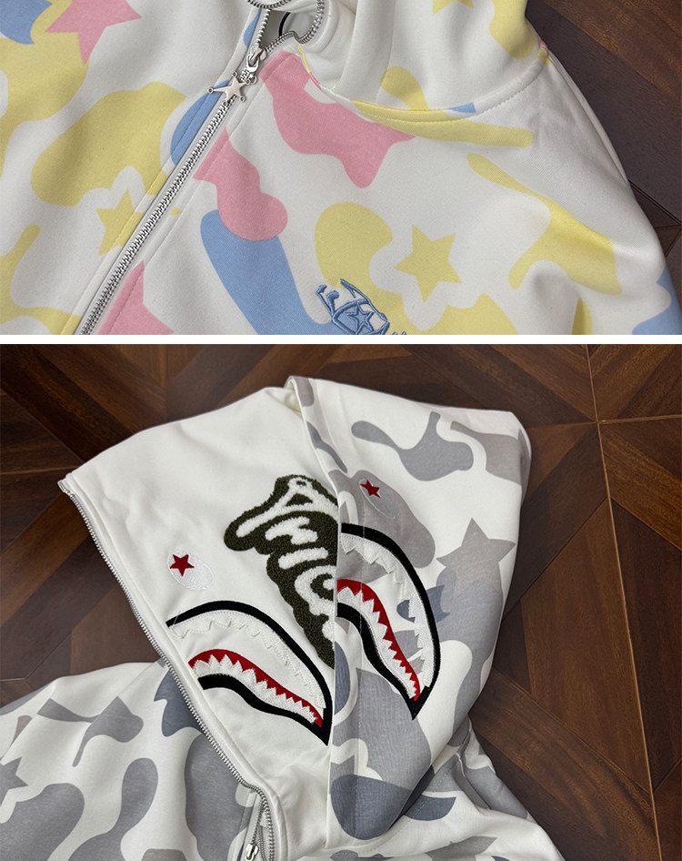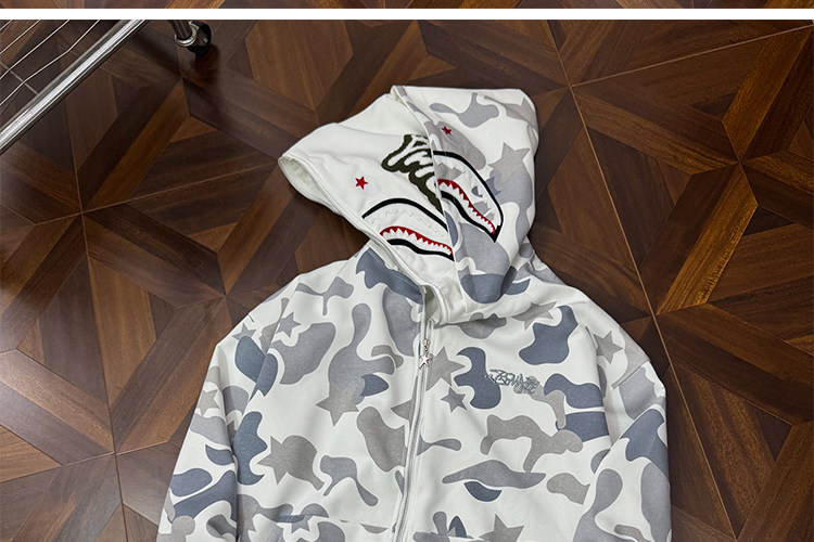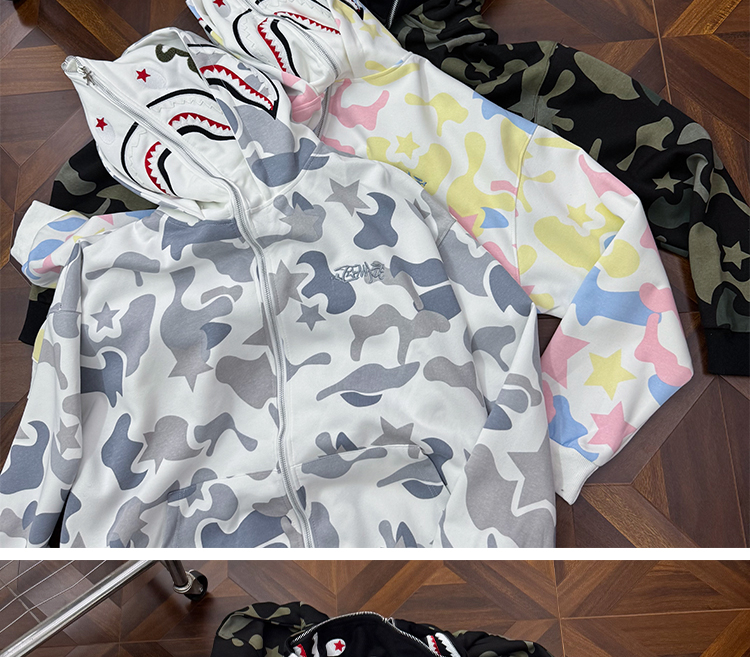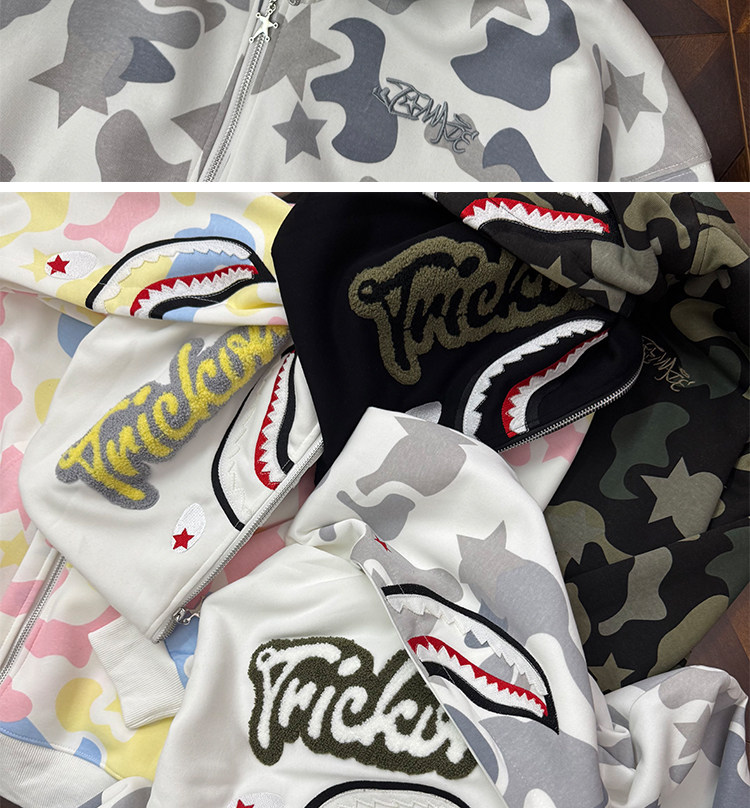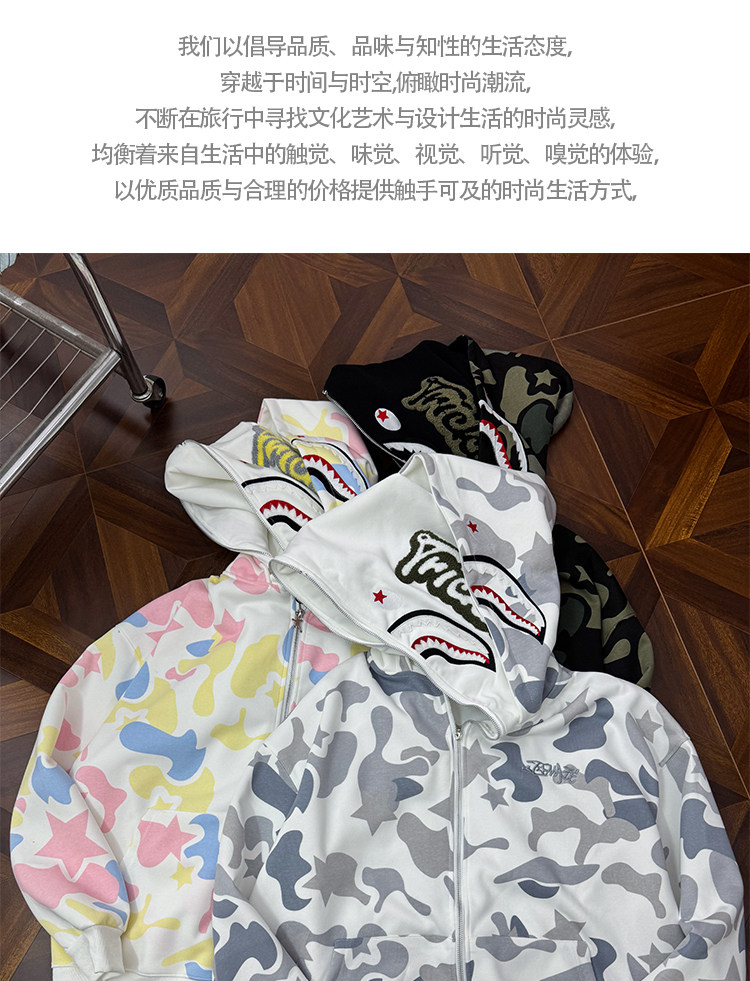 秋冬迷彩鯊魚刺綉雙帽衛衣男女情侶連帽拉鍊開衫寬松上衣夾克外套