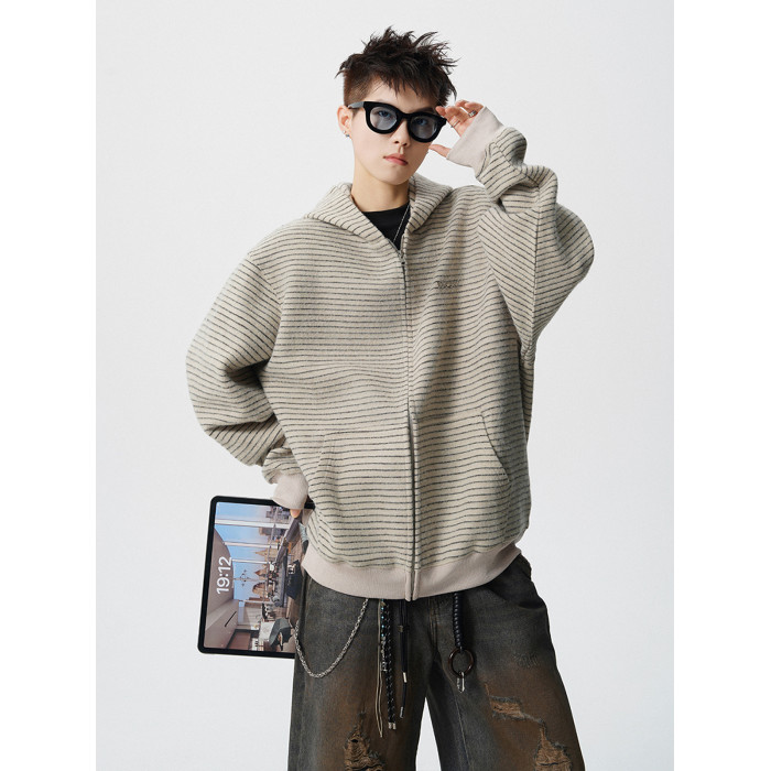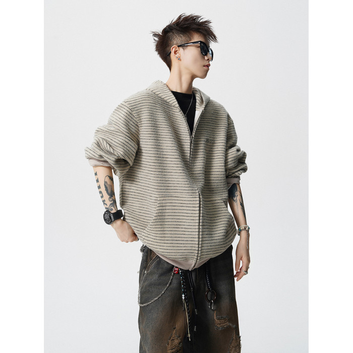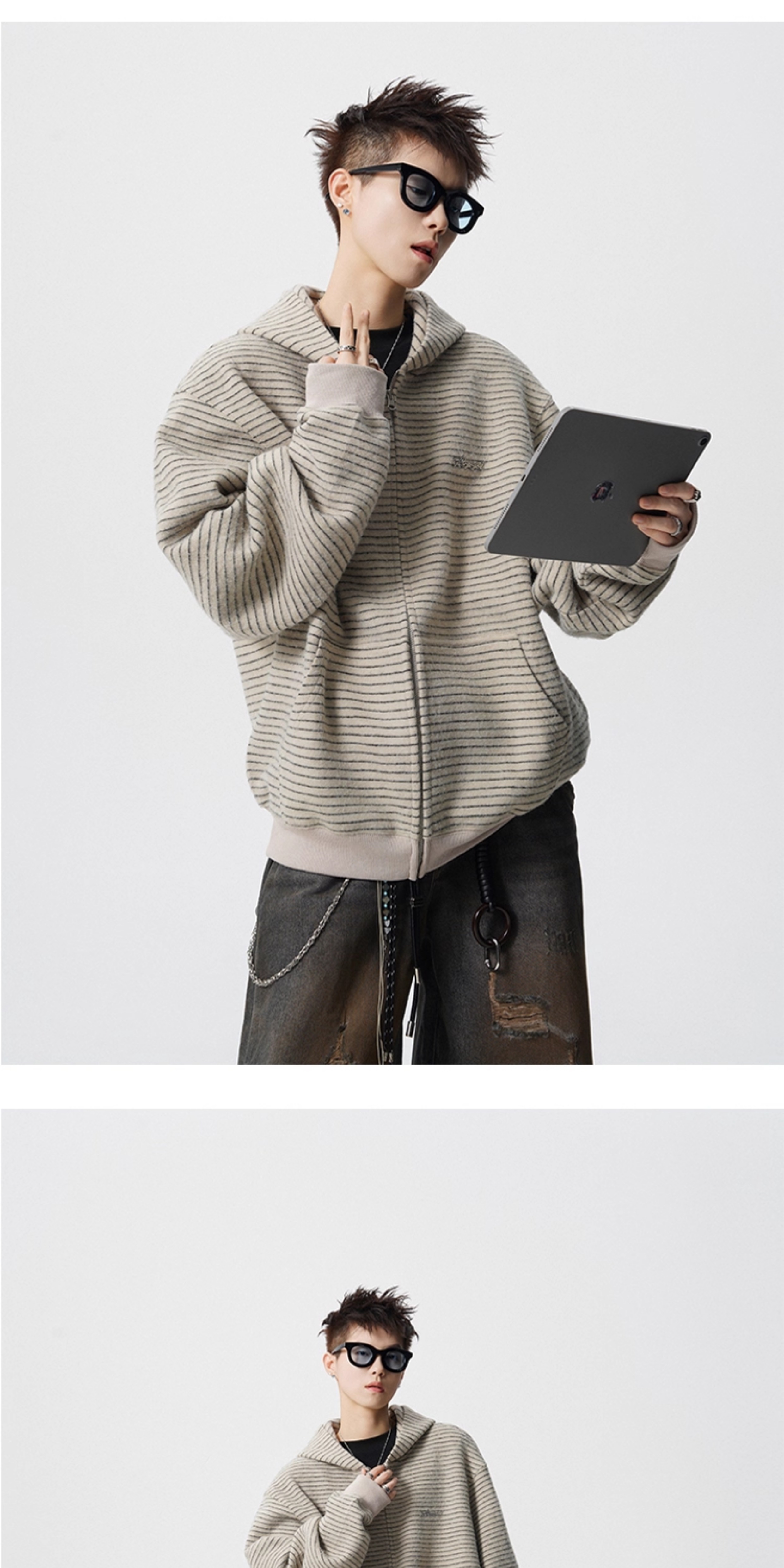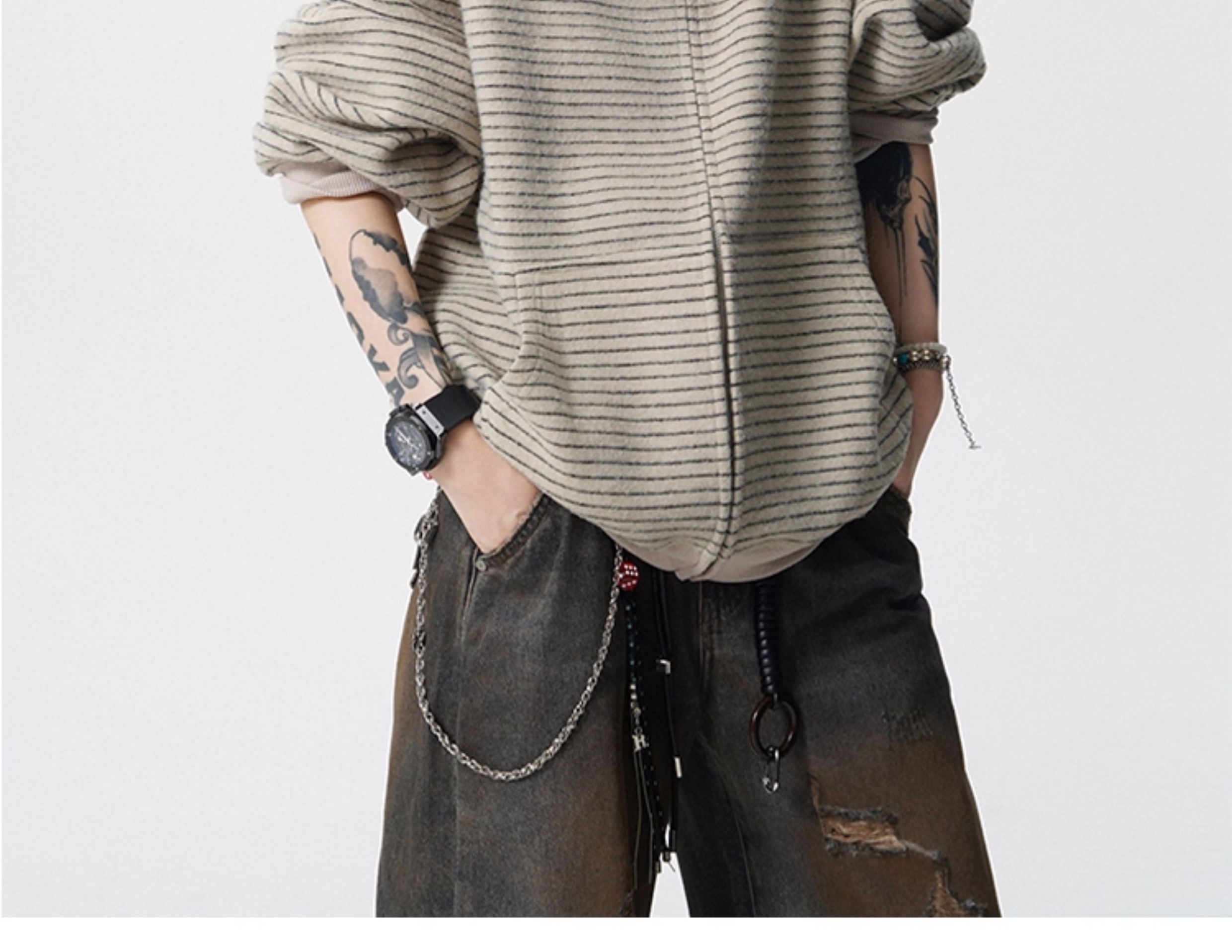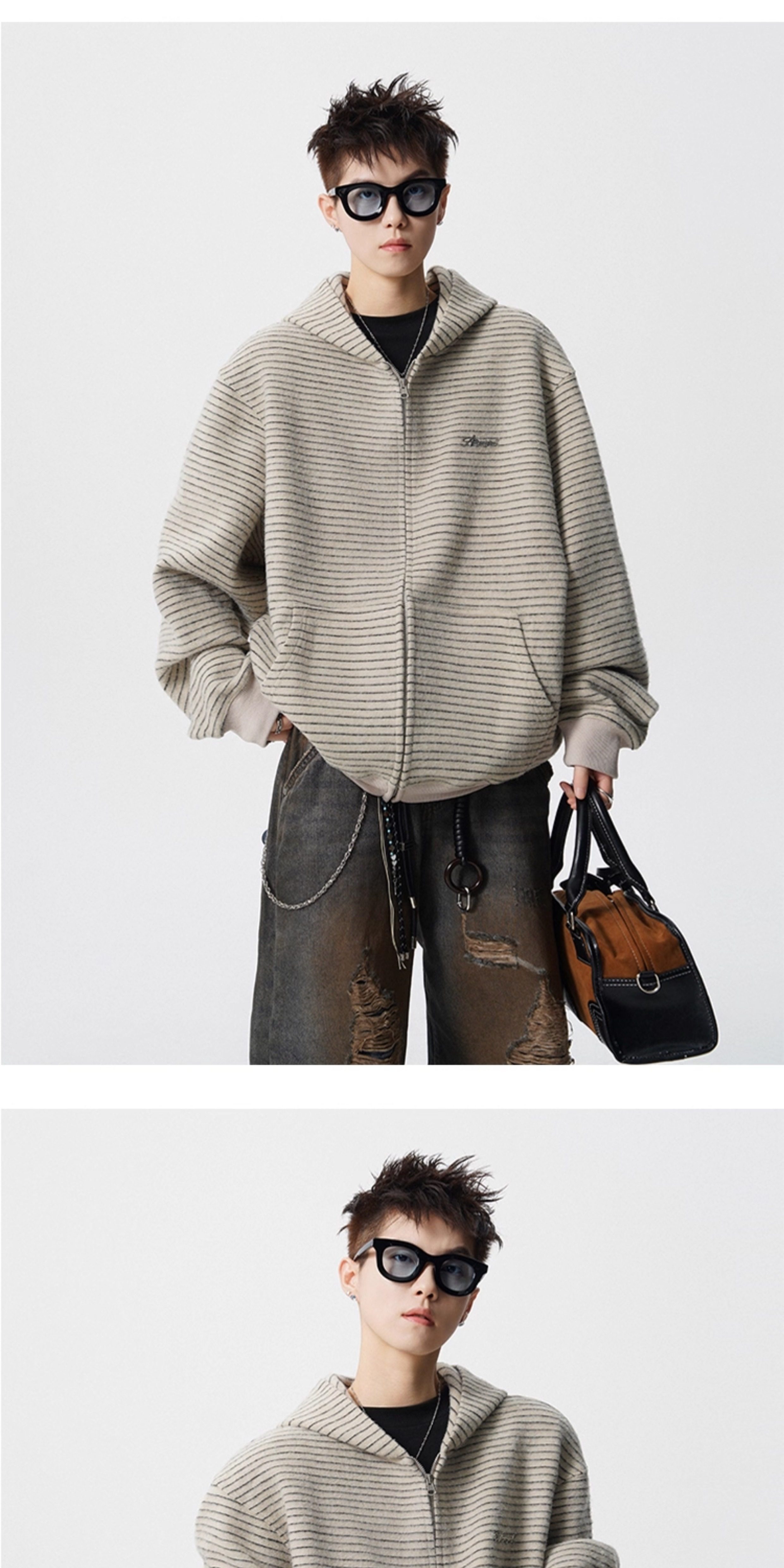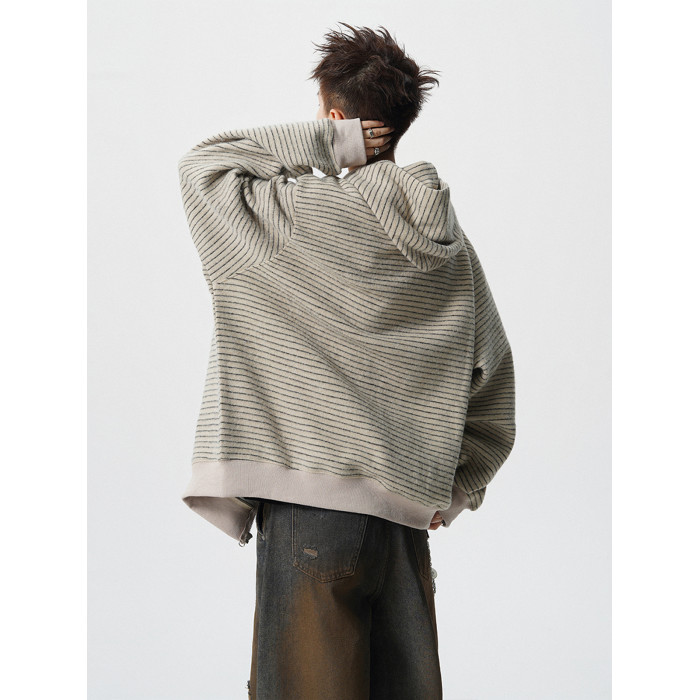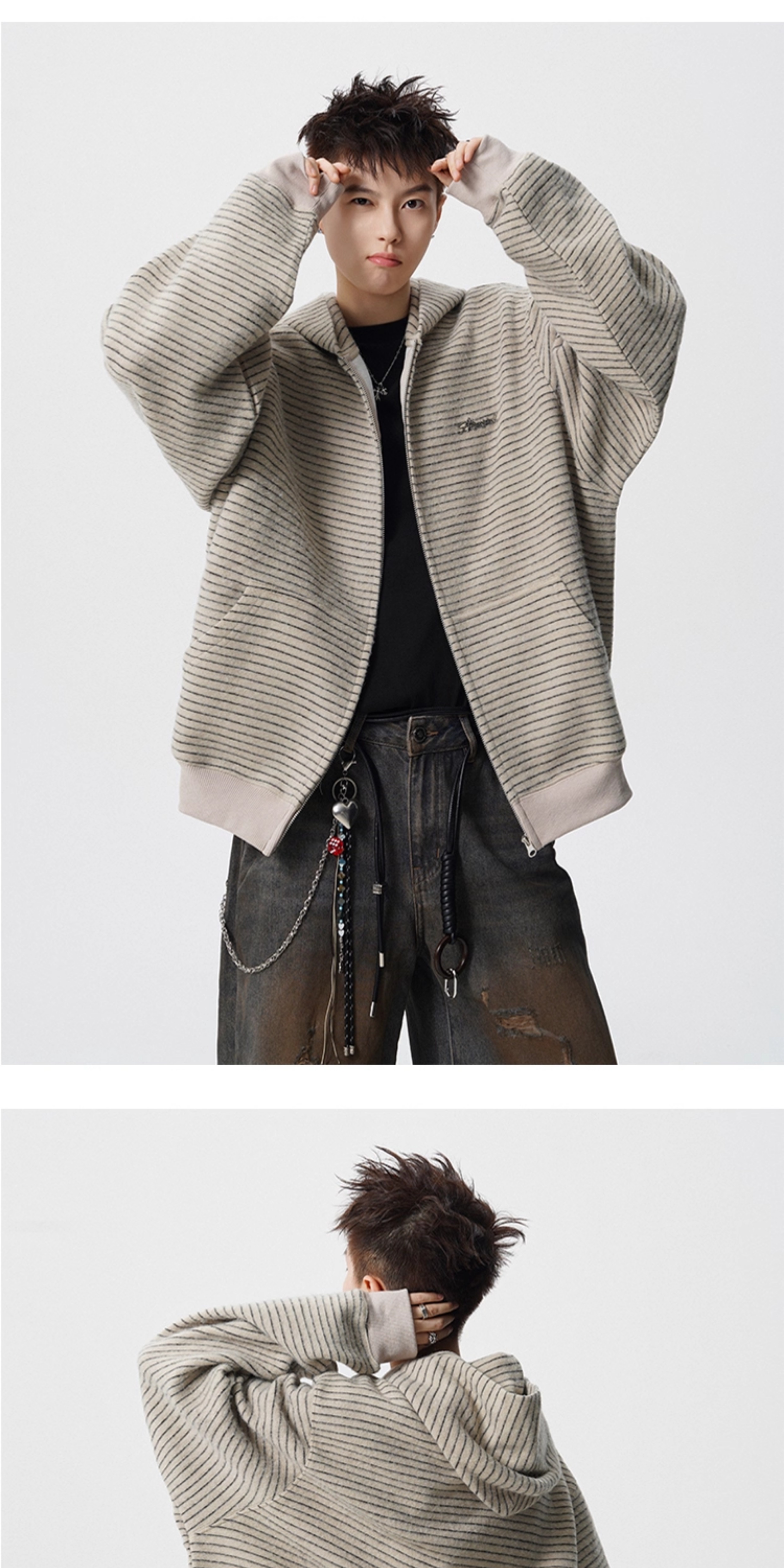 復古老錢風條紋開衫衛衣男秋休閒慵懶風連帽外套美式運動情侶夾克