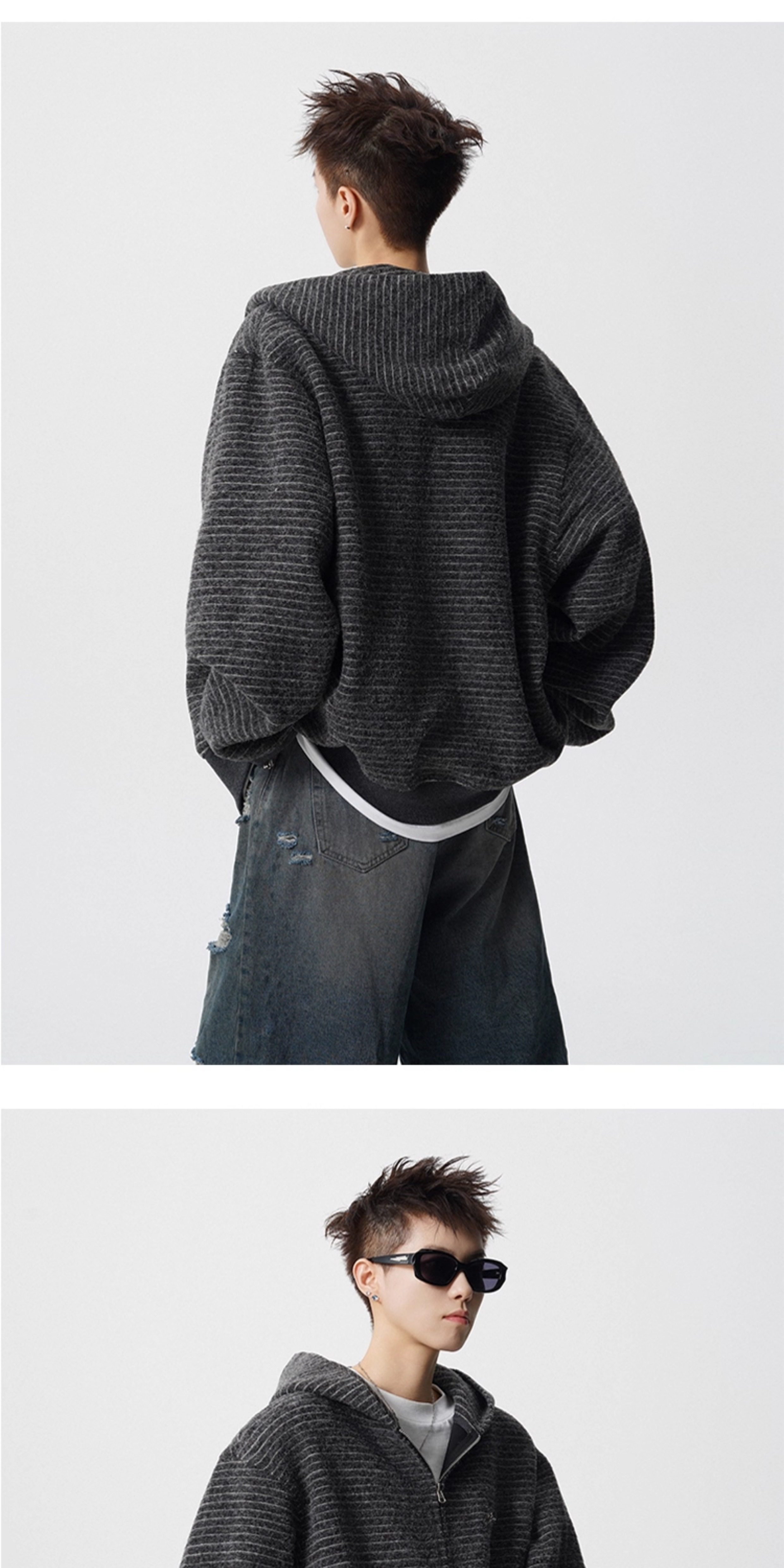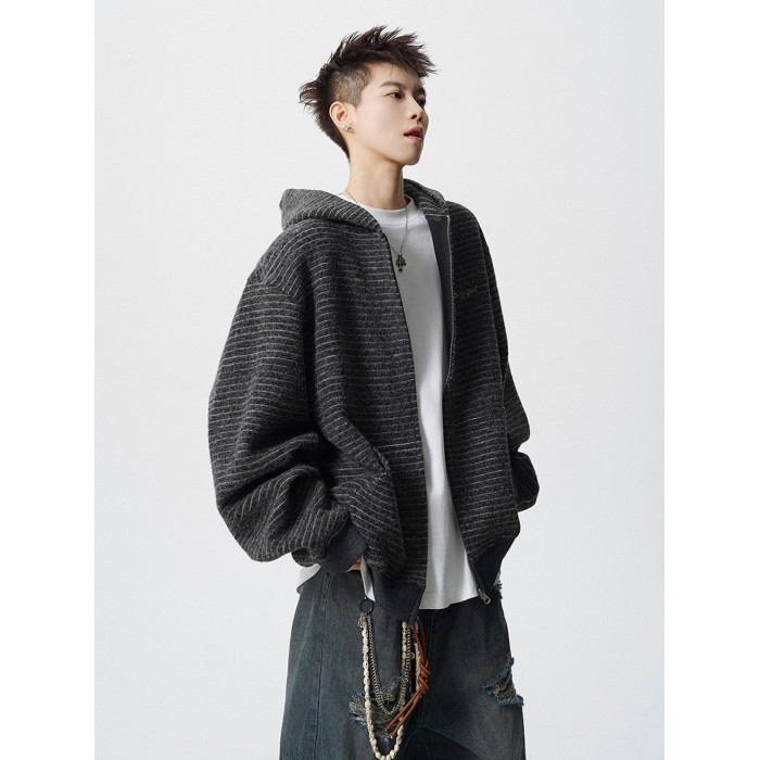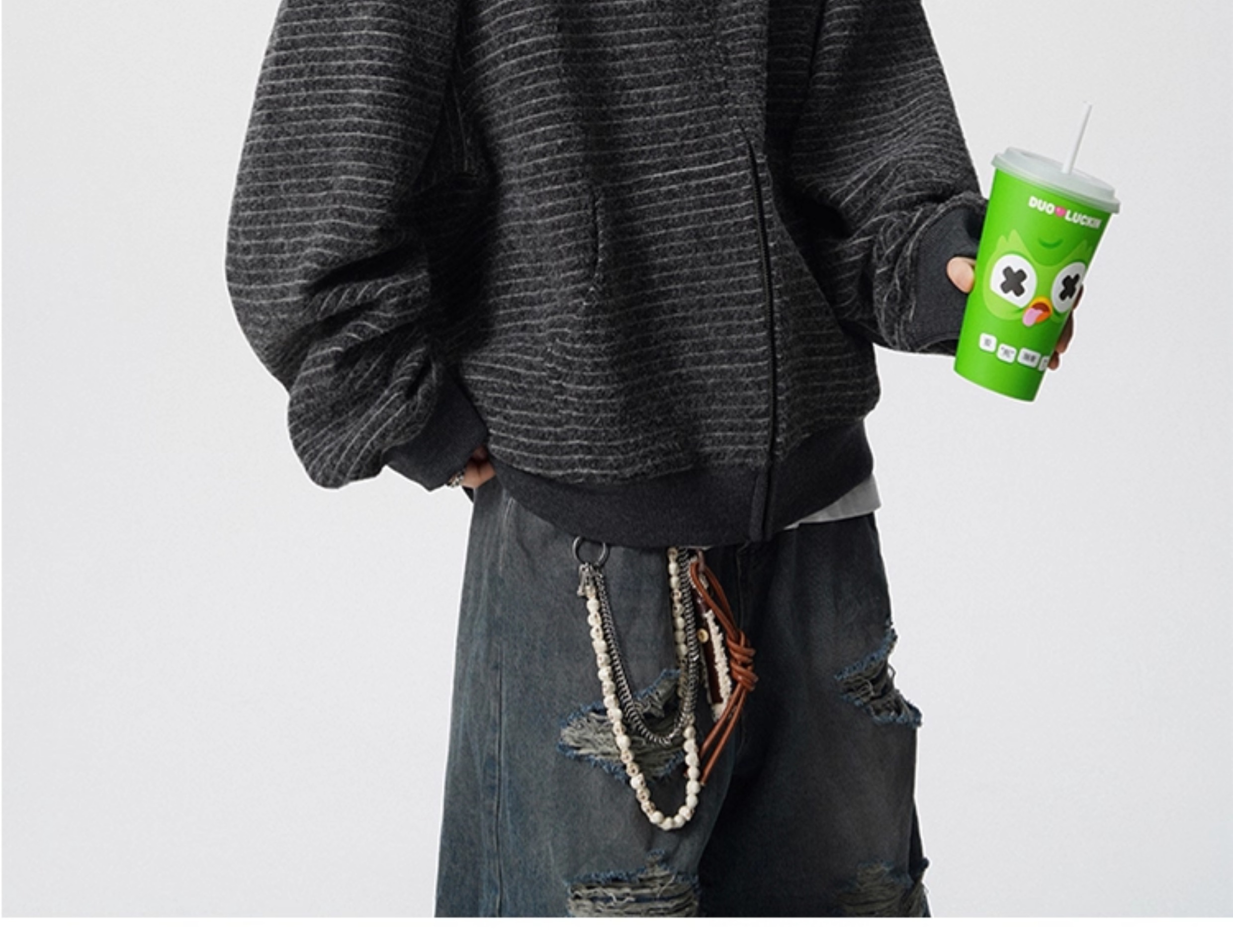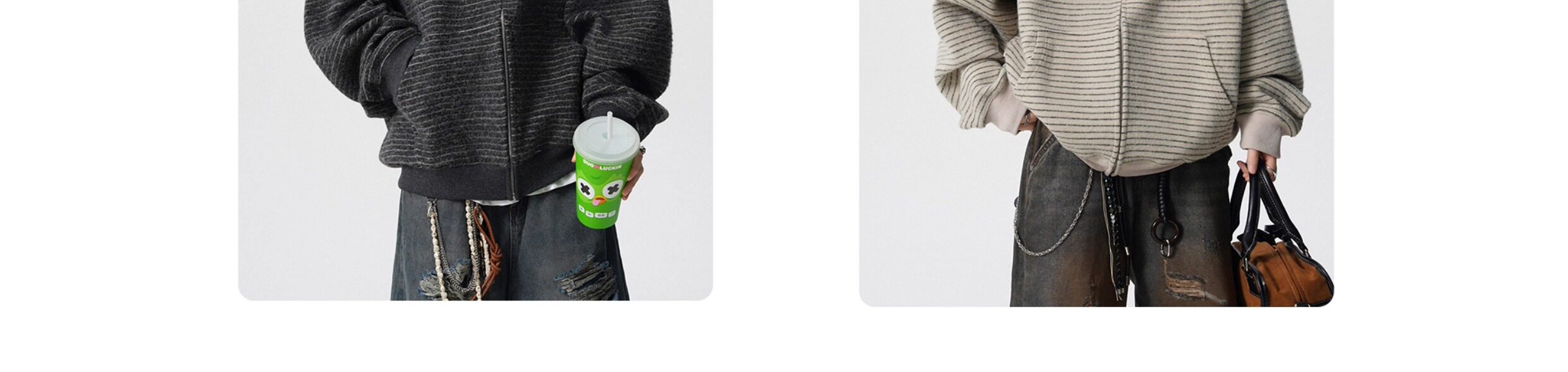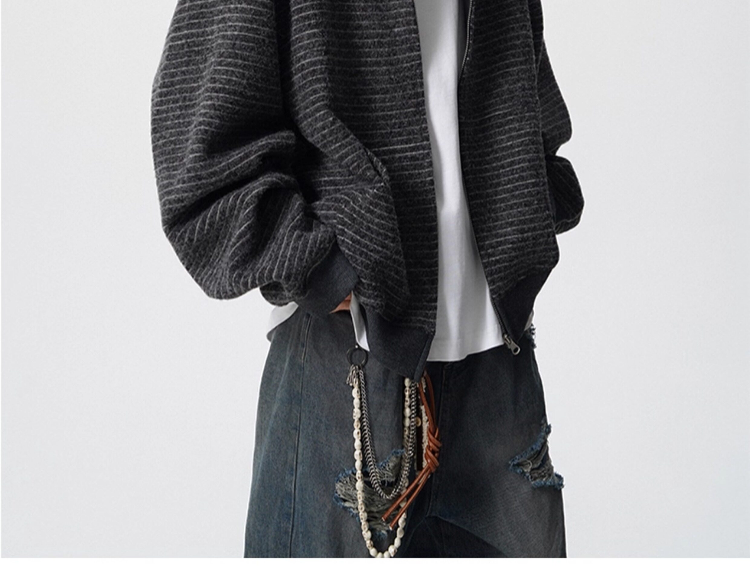 復古老錢風條紋開衫衛衣男秋休閒慵懶風連帽外套美式運動情侶夾克