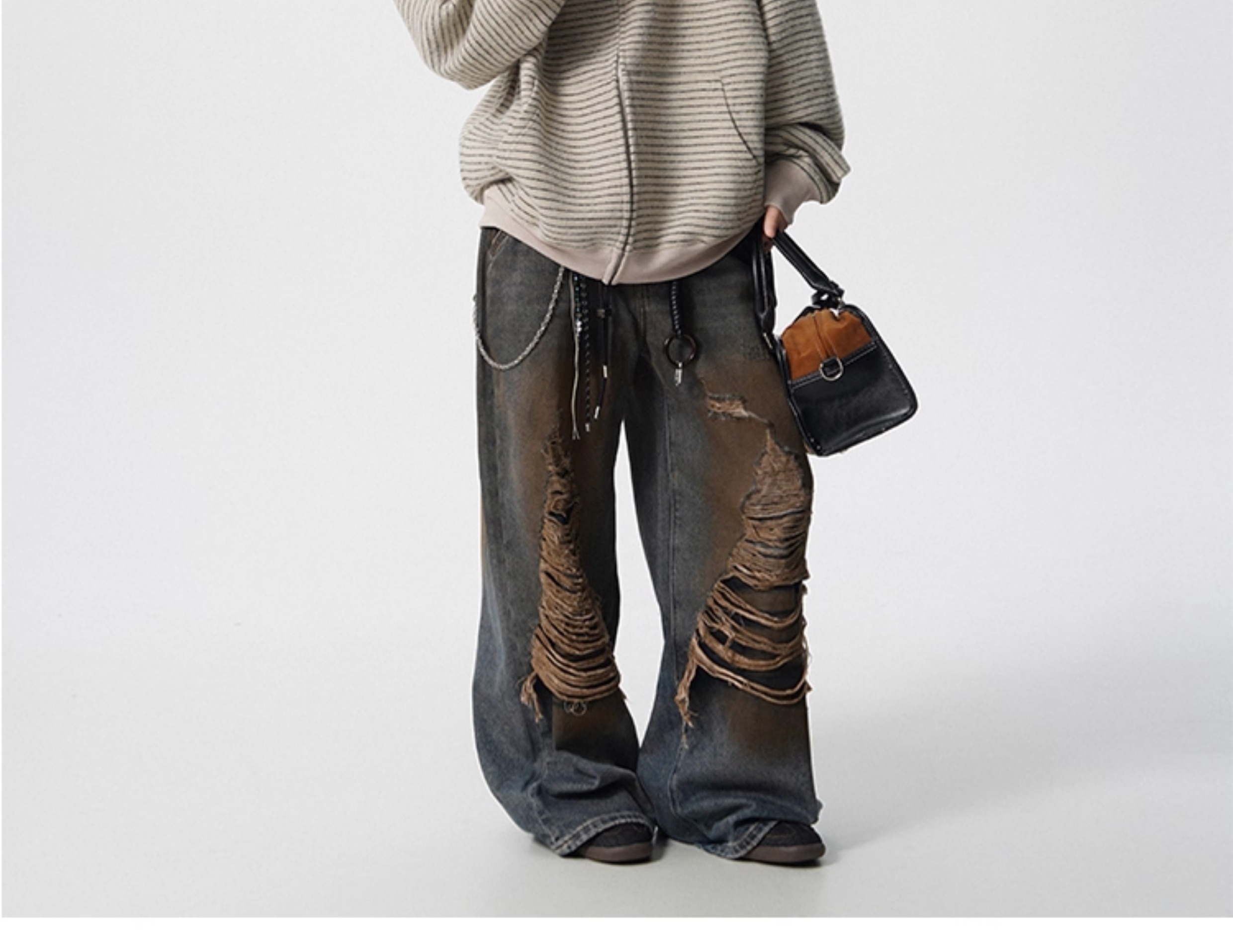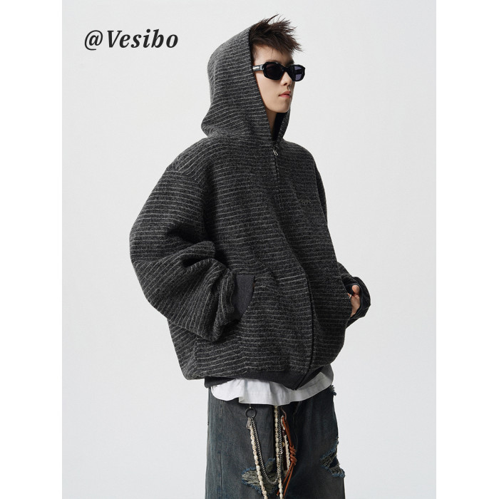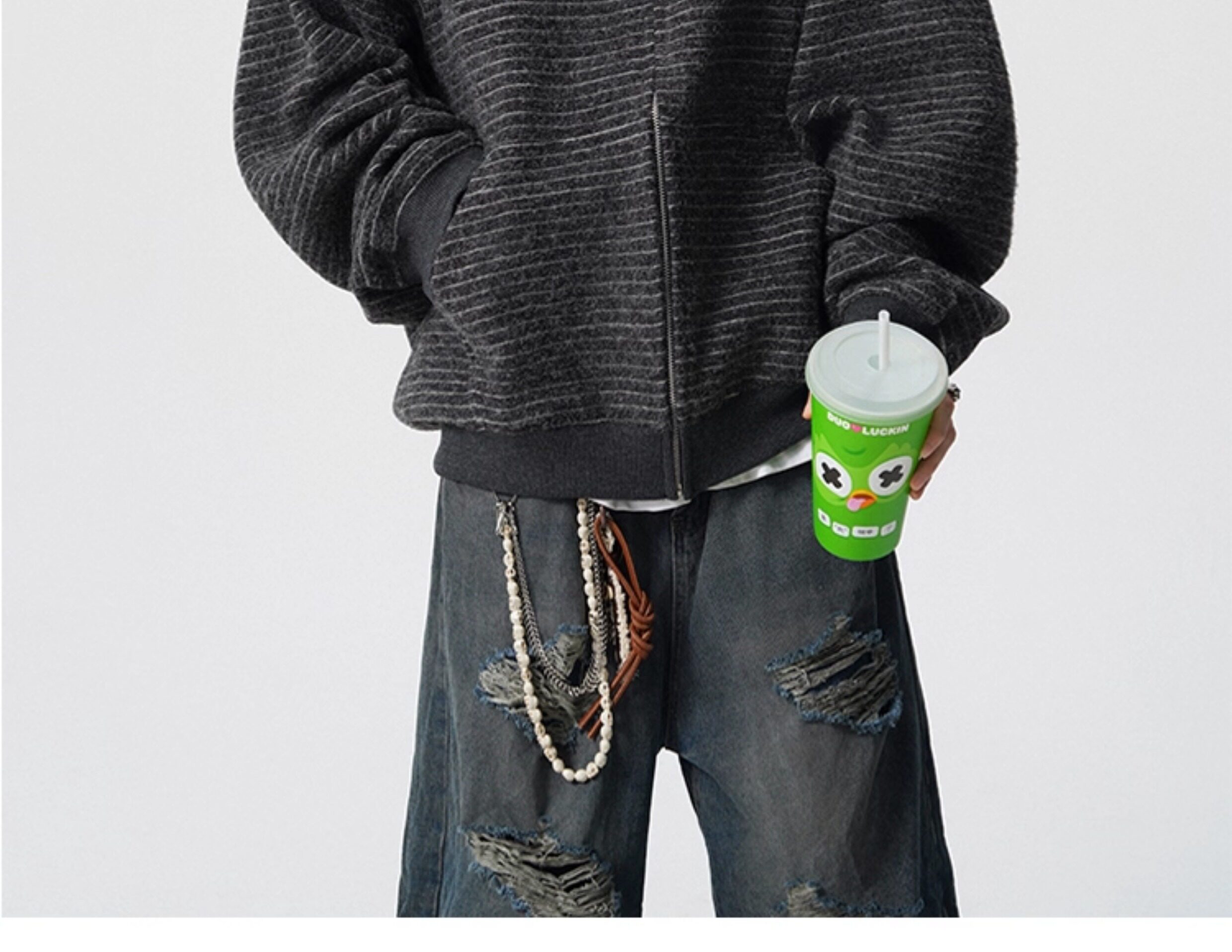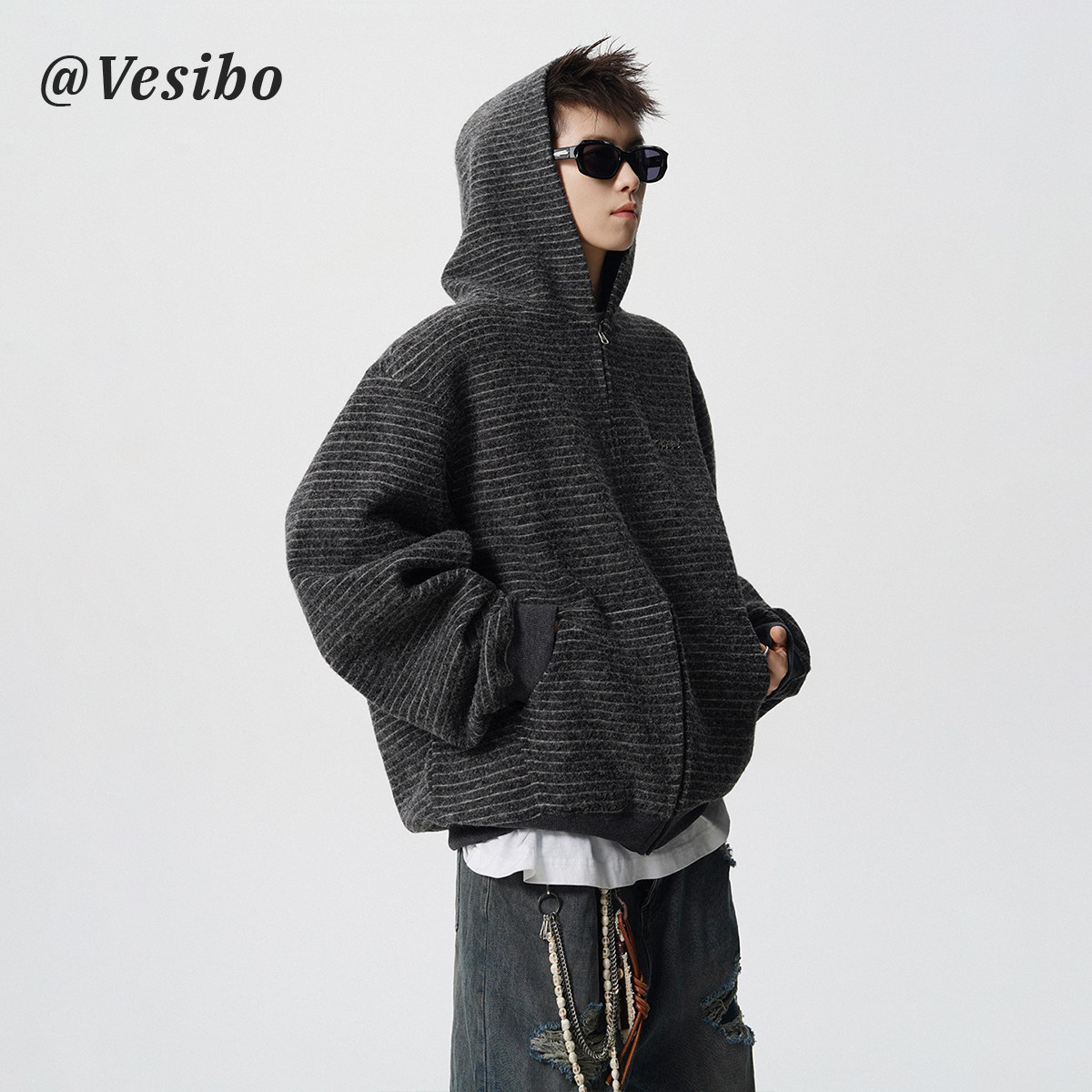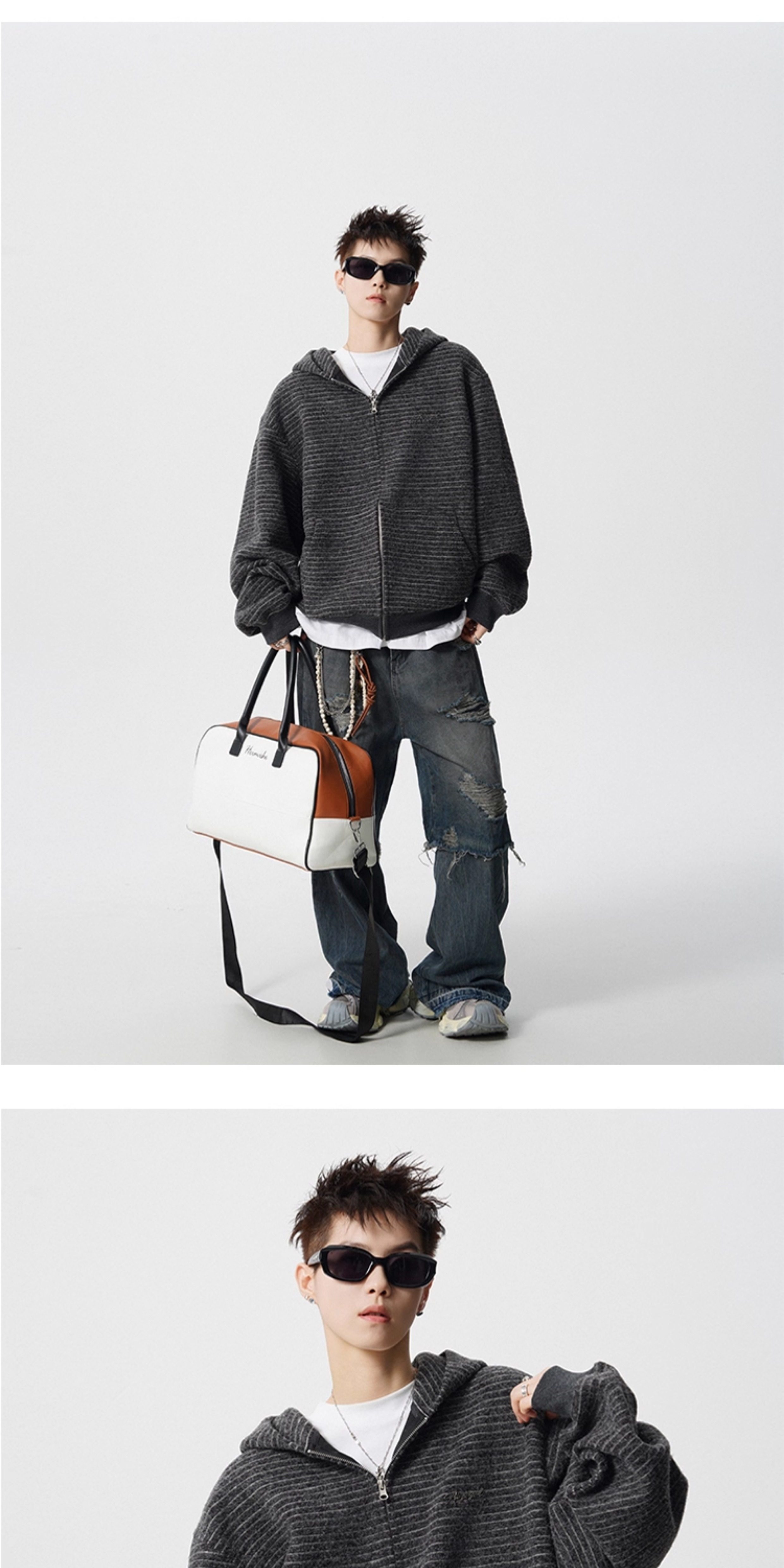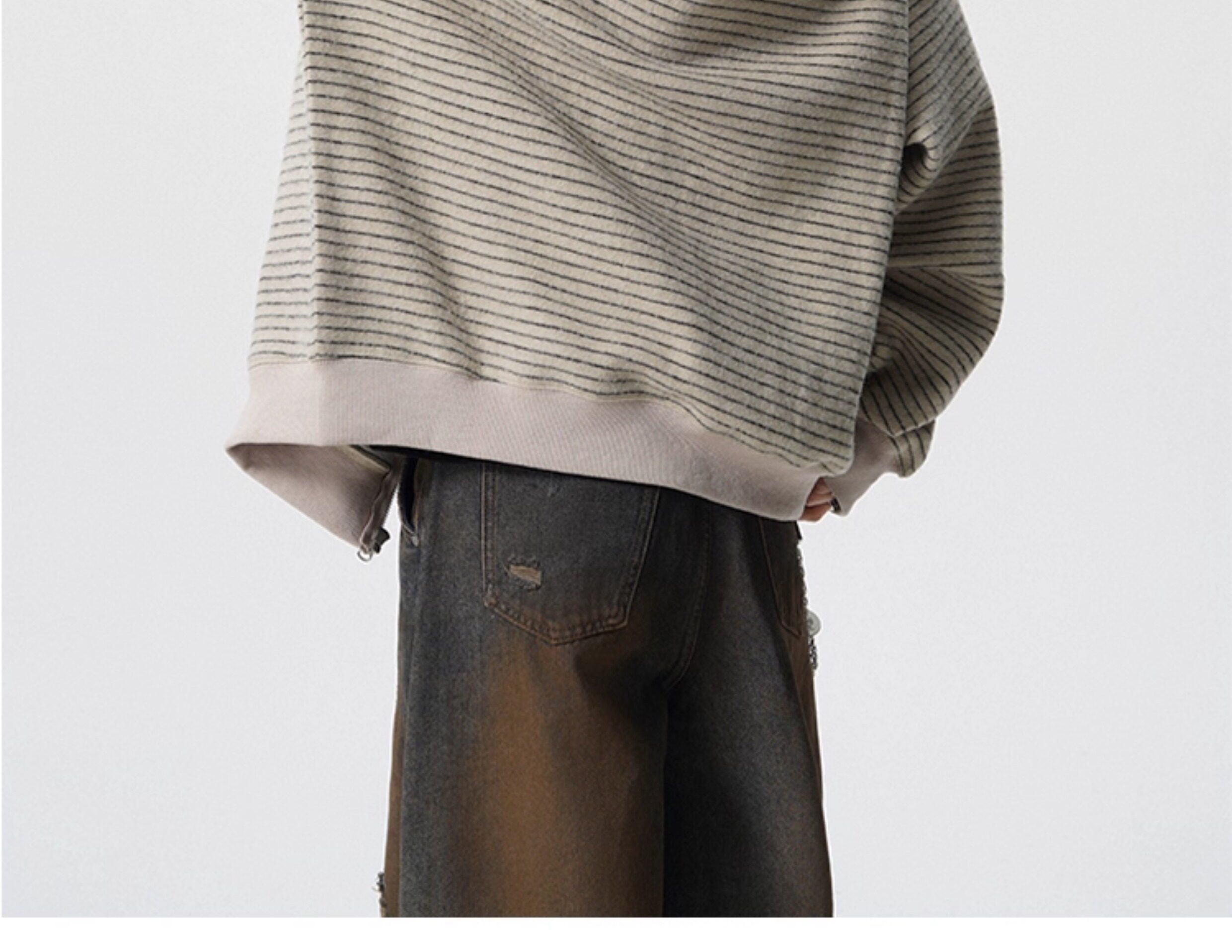 復古老錢風條紋開衫衛衣男秋休閒慵懶風連帽外套美式運動情侶夾克