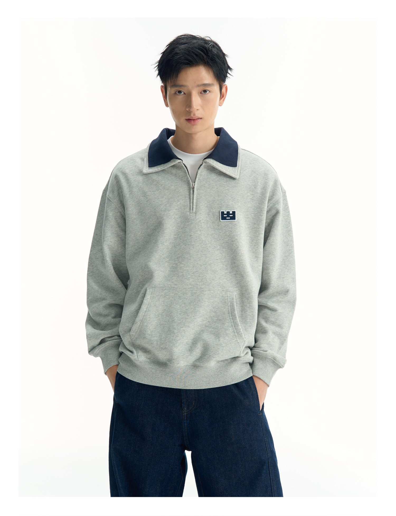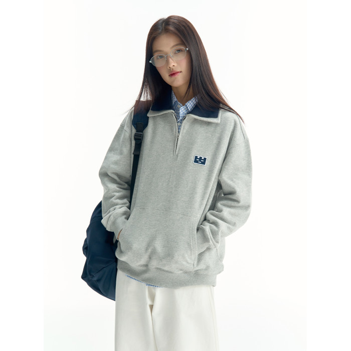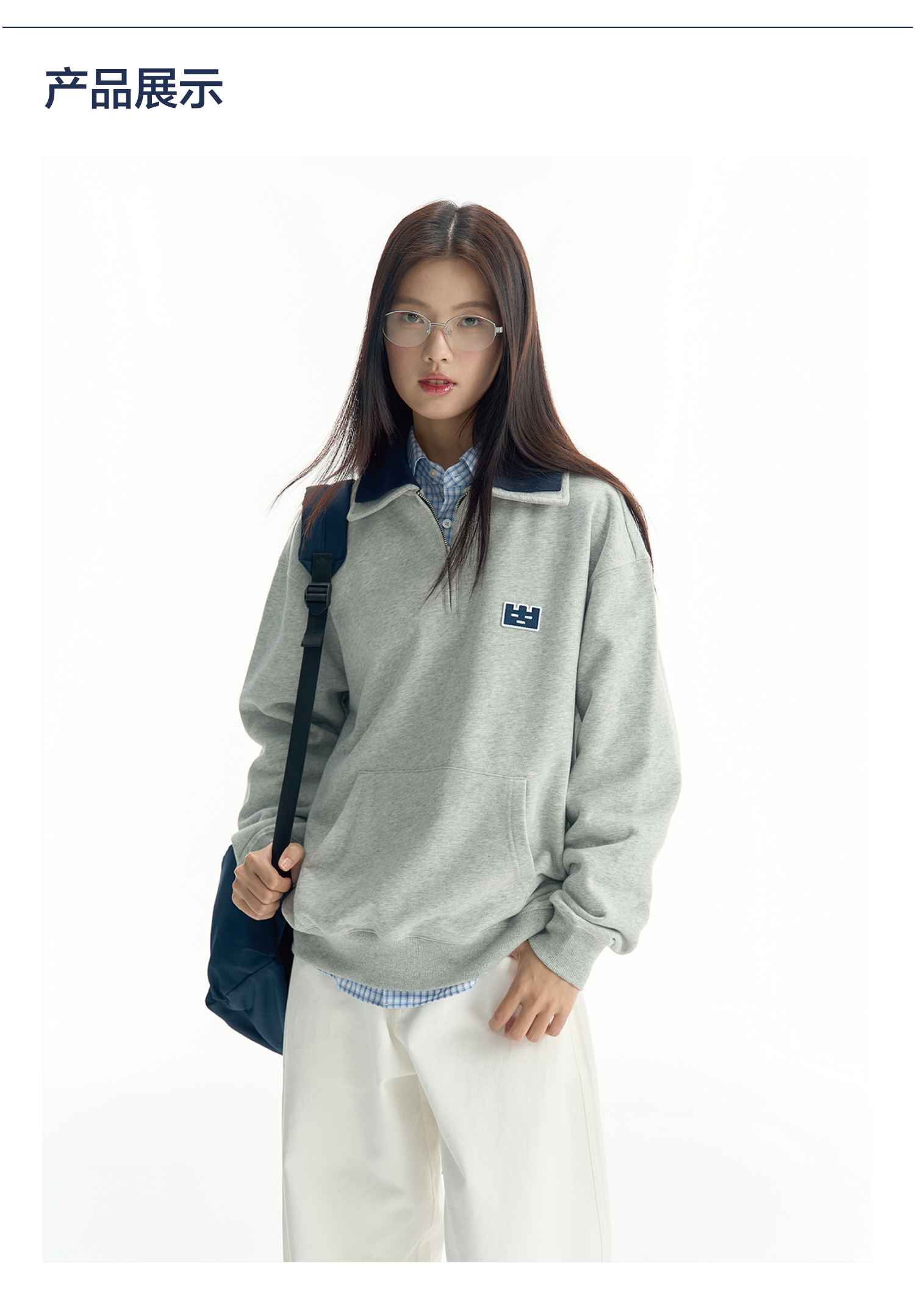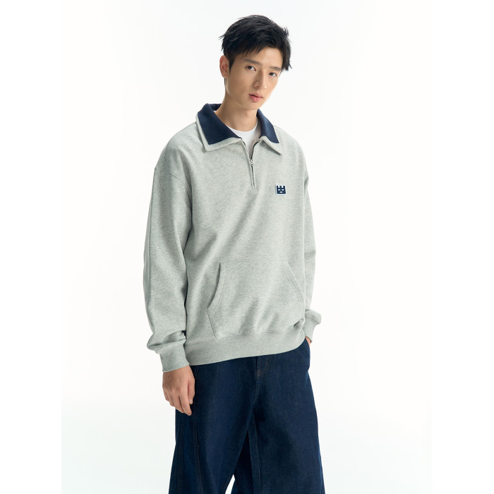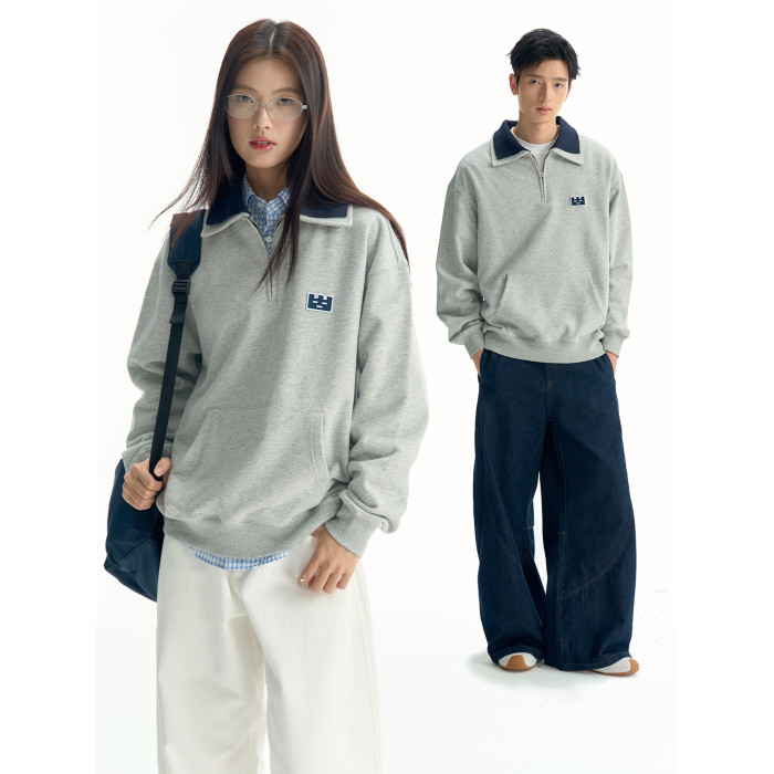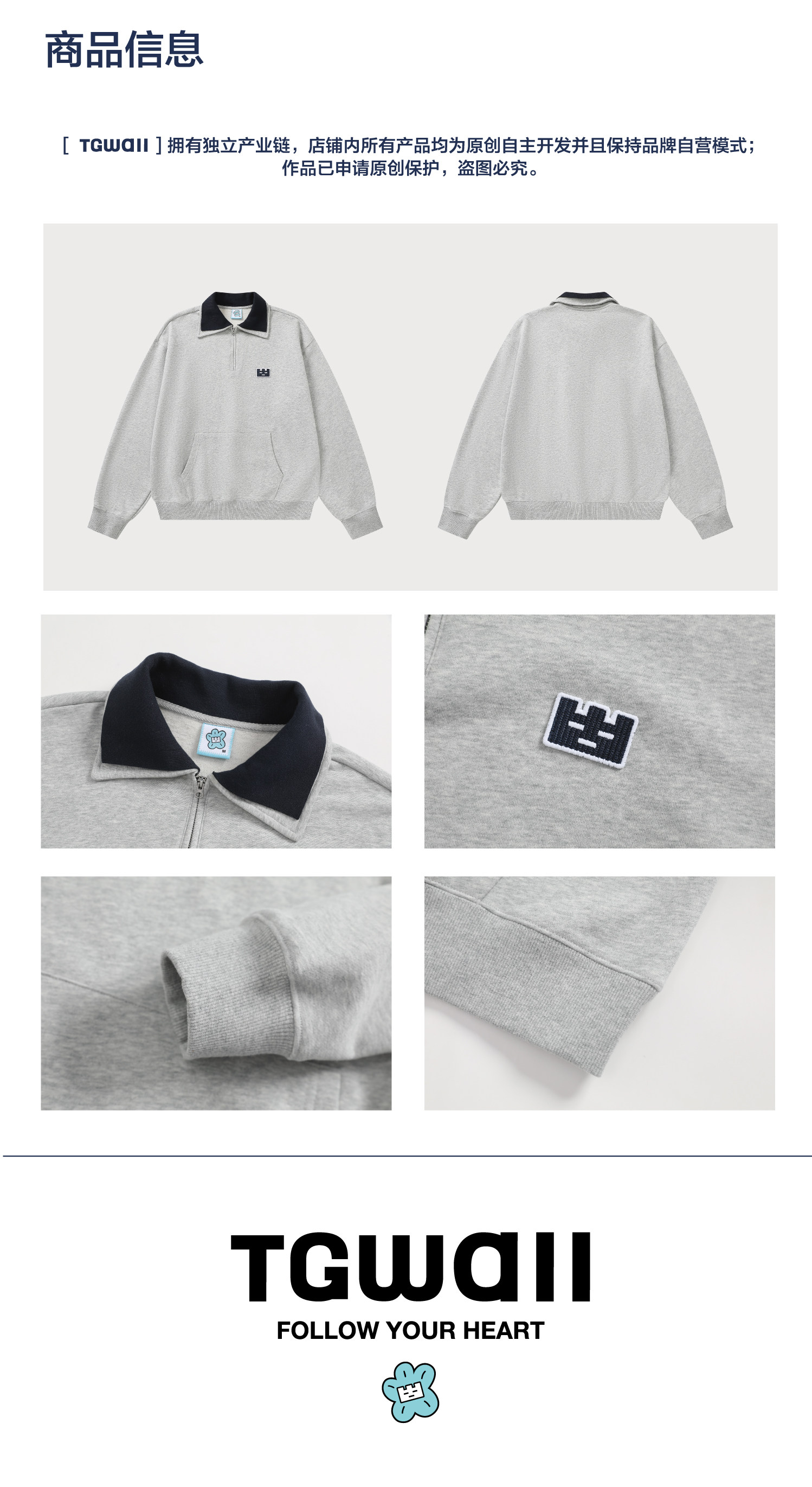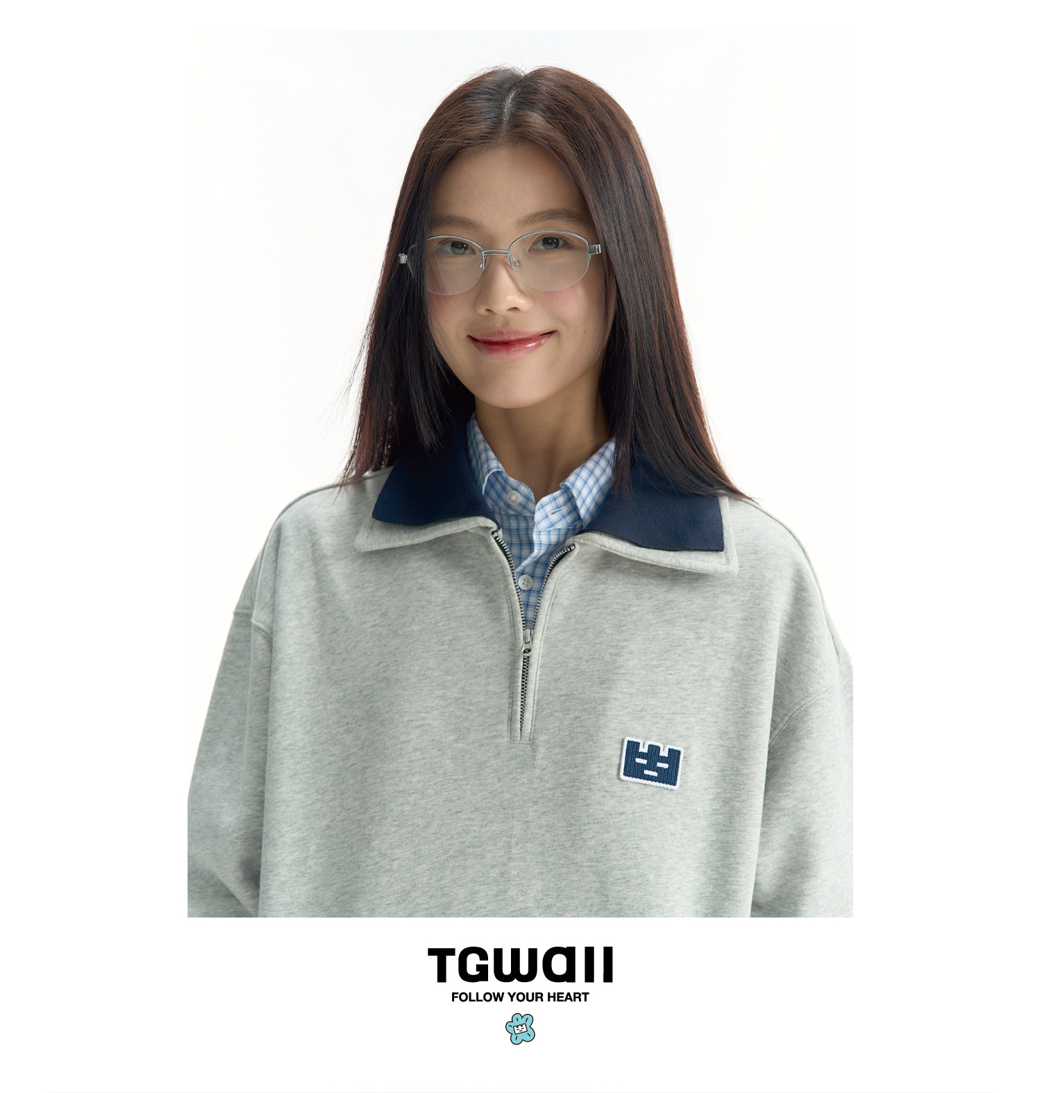 TGWALL「時遇」雙層翻領復古POLO領拉鍊撞色刺綉寬松套頭情侶衛衣