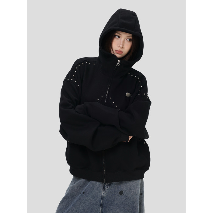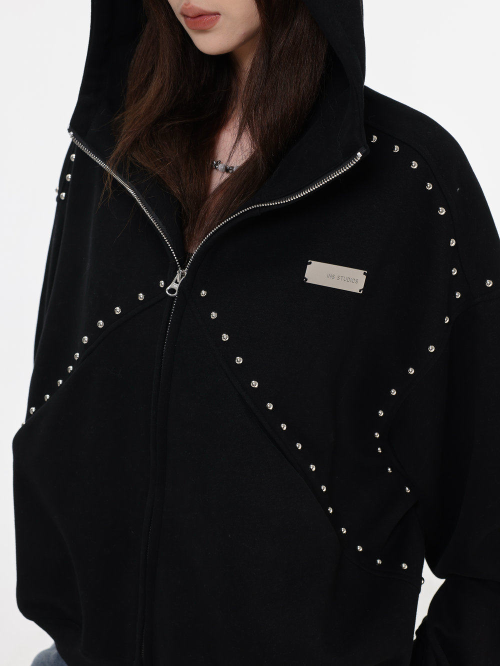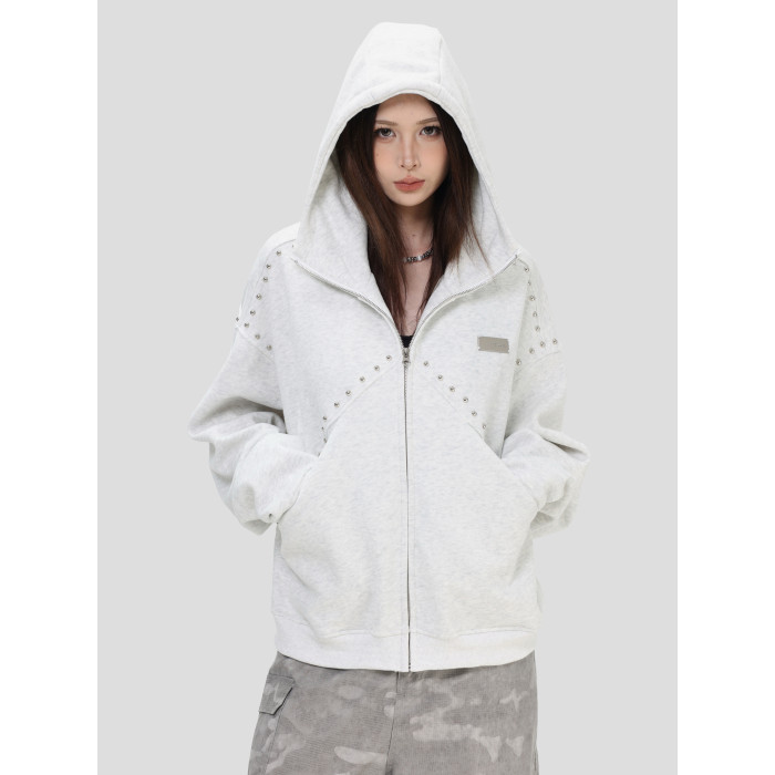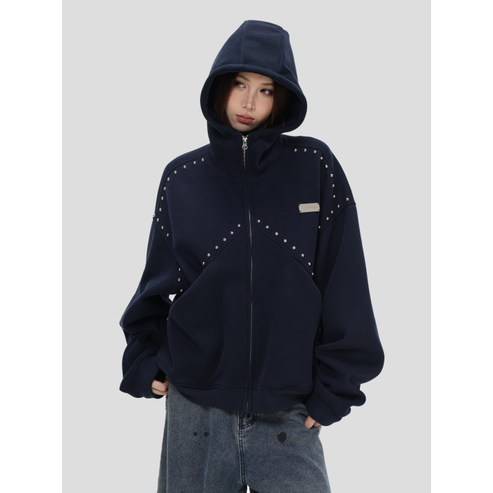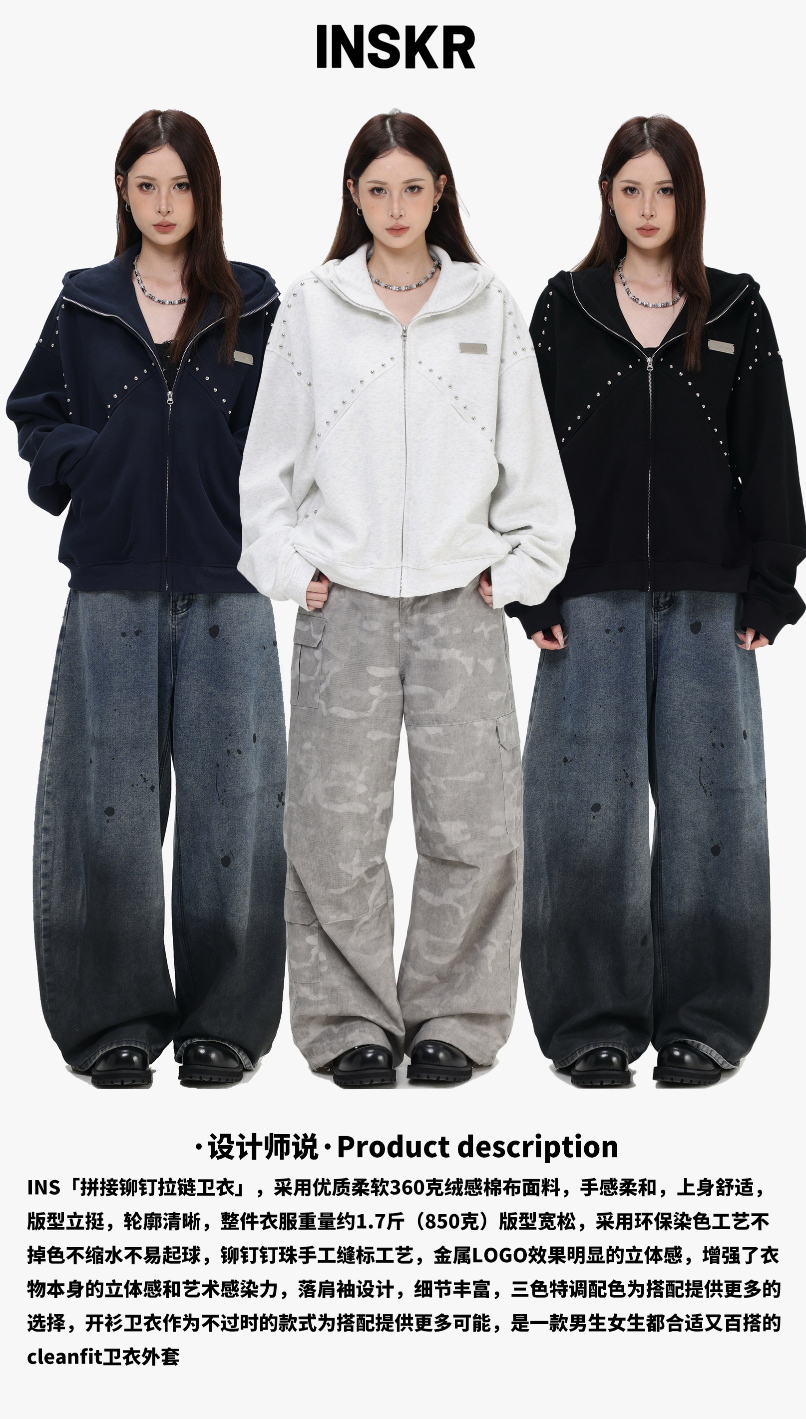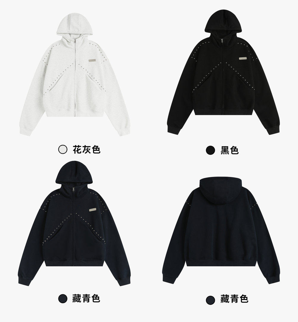 【INSKR】國潮情侶美式「拼接鉚釘拉鍊衛衣」寬鬆連帽開衫外套男