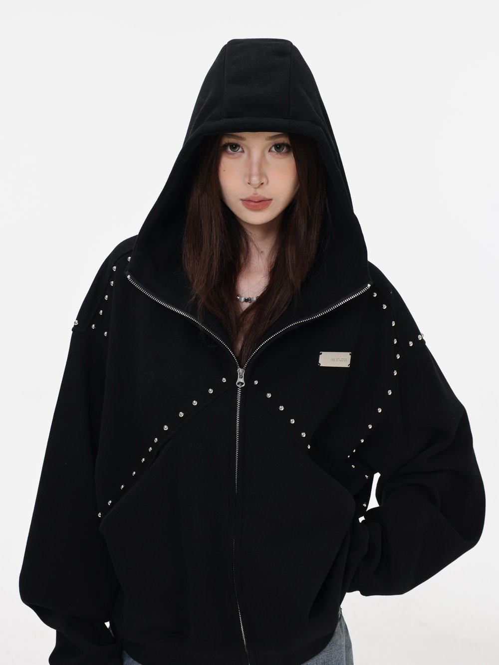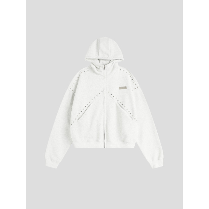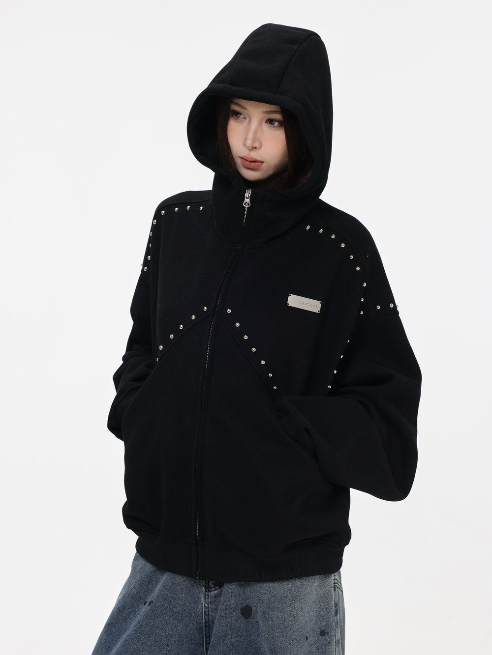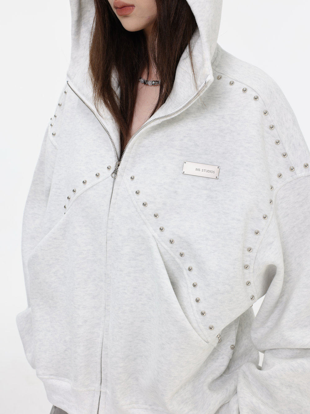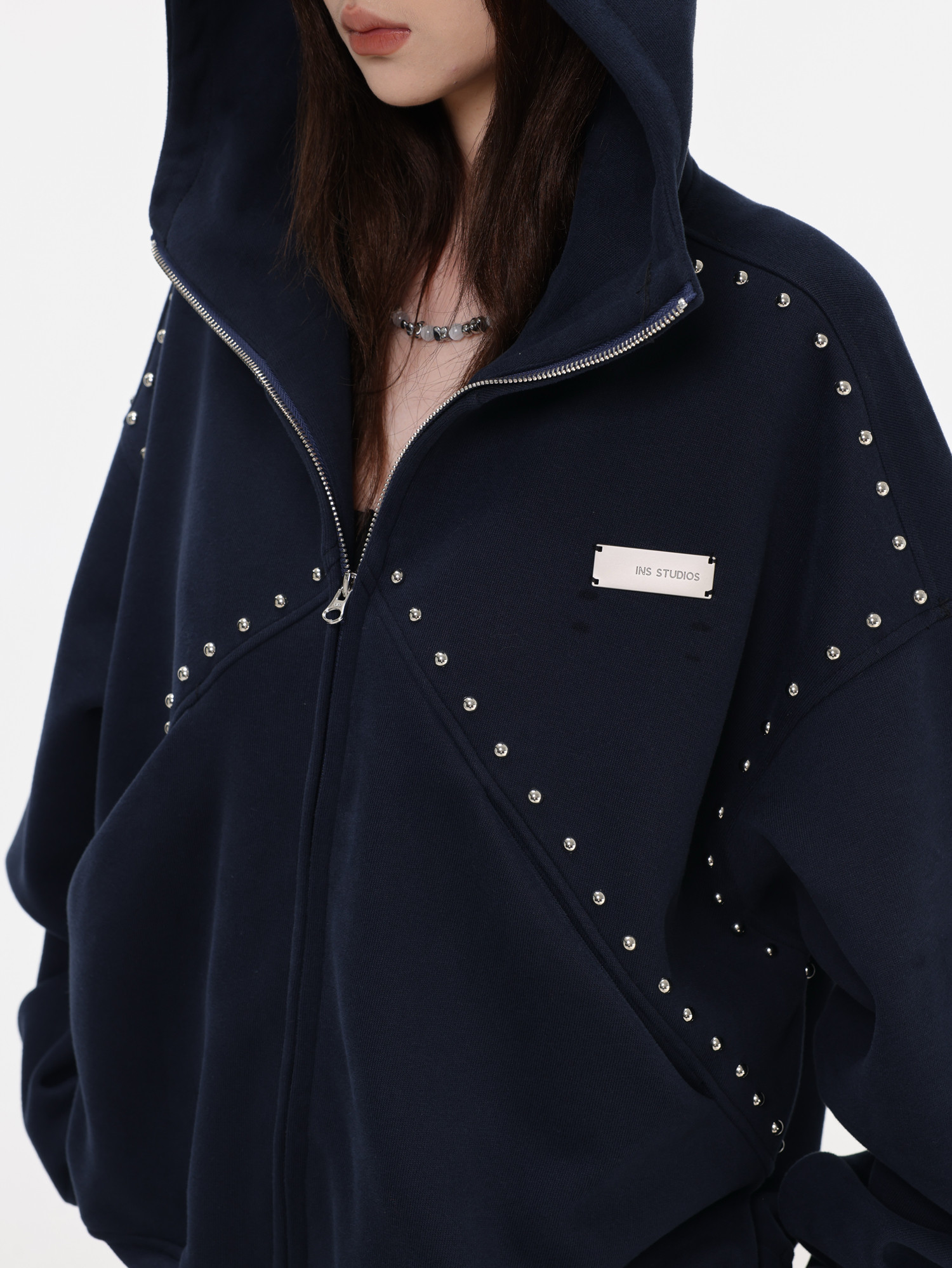 【INSKR】國潮情侶美式「拼接鉚釘拉鍊衛衣」寬鬆連帽開衫外套男