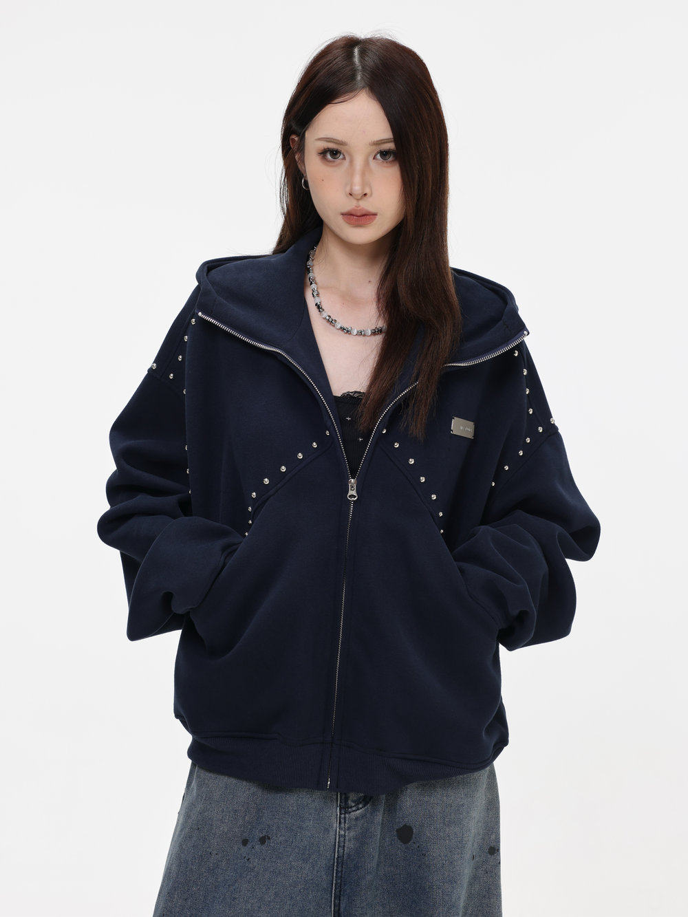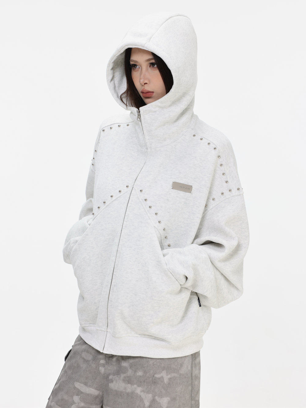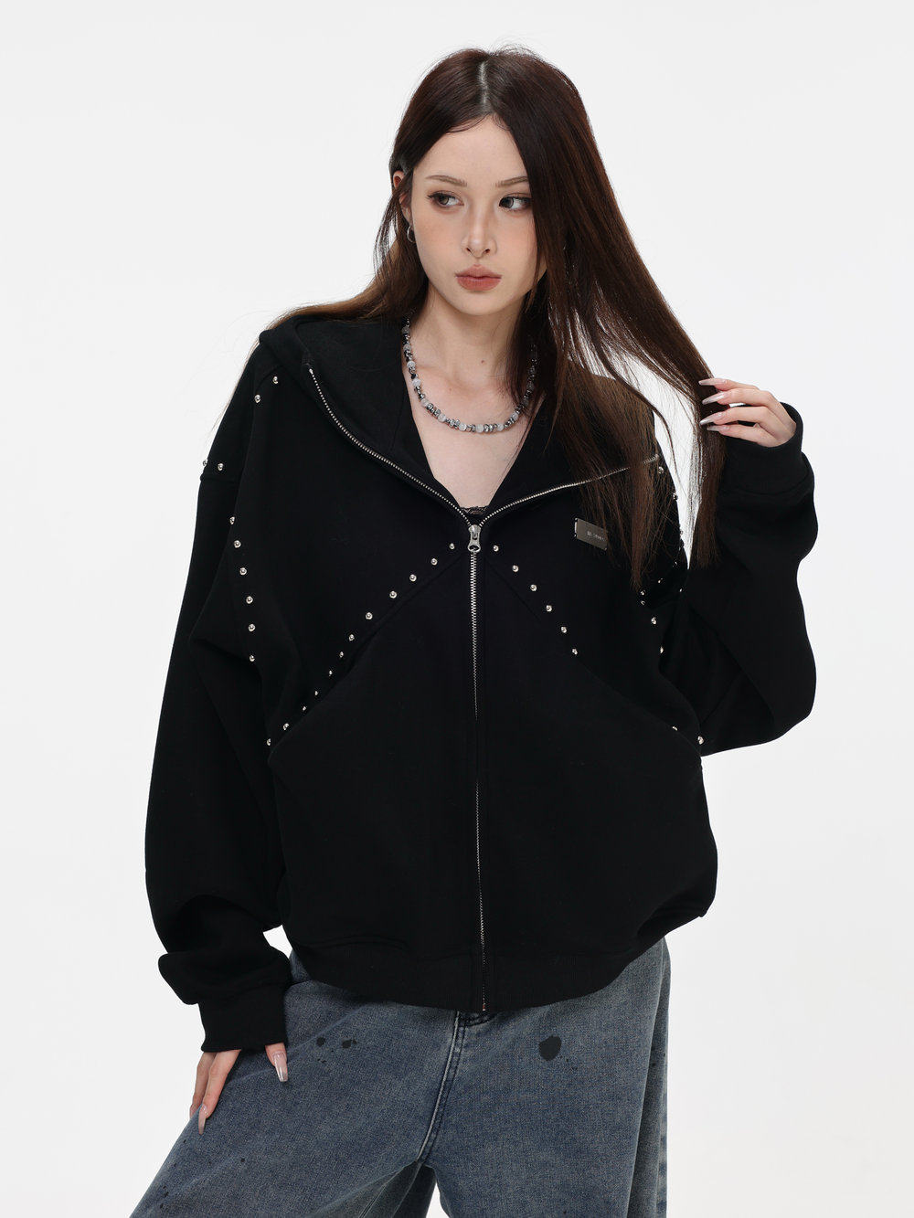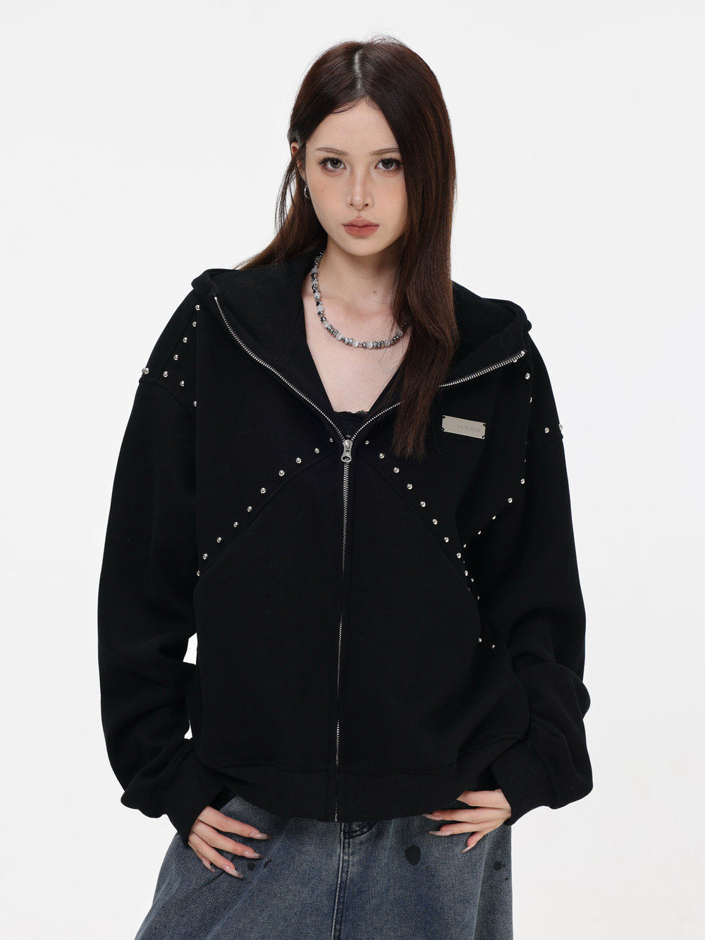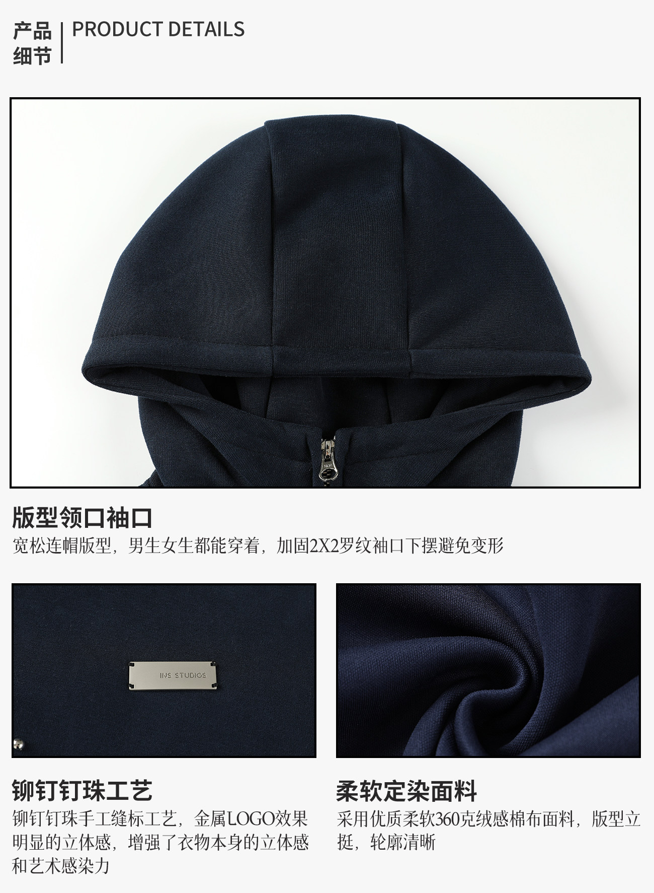 【INSKR】國潮情侶美式「拼接鉚釘拉鍊衛衣」寬鬆連帽開衫外套男