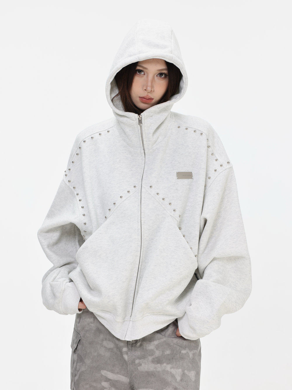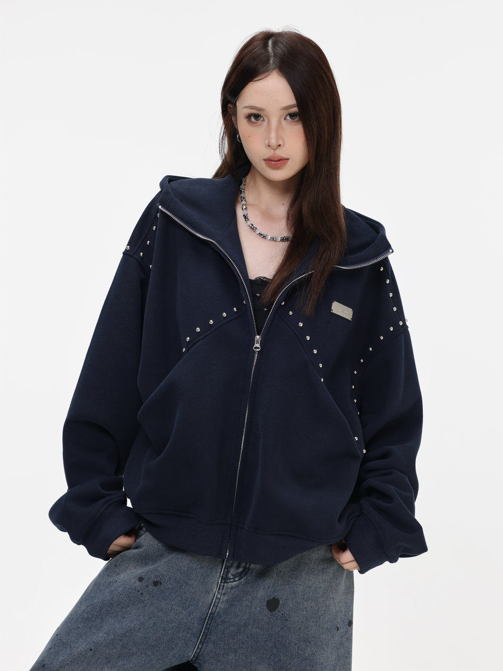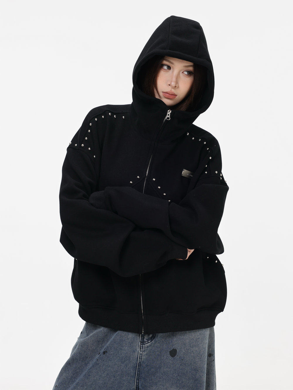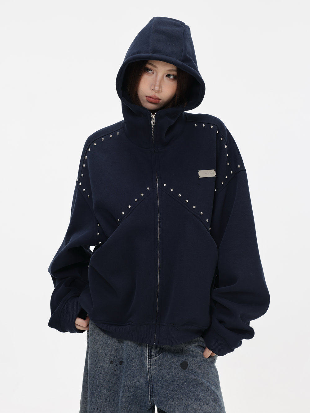 【INSKR】國潮情侶美式「拼接鉚釘拉鍊衛衣」寬鬆連帽開衫外套男