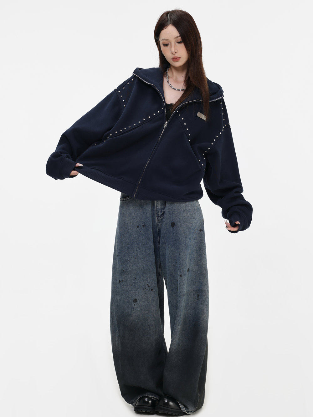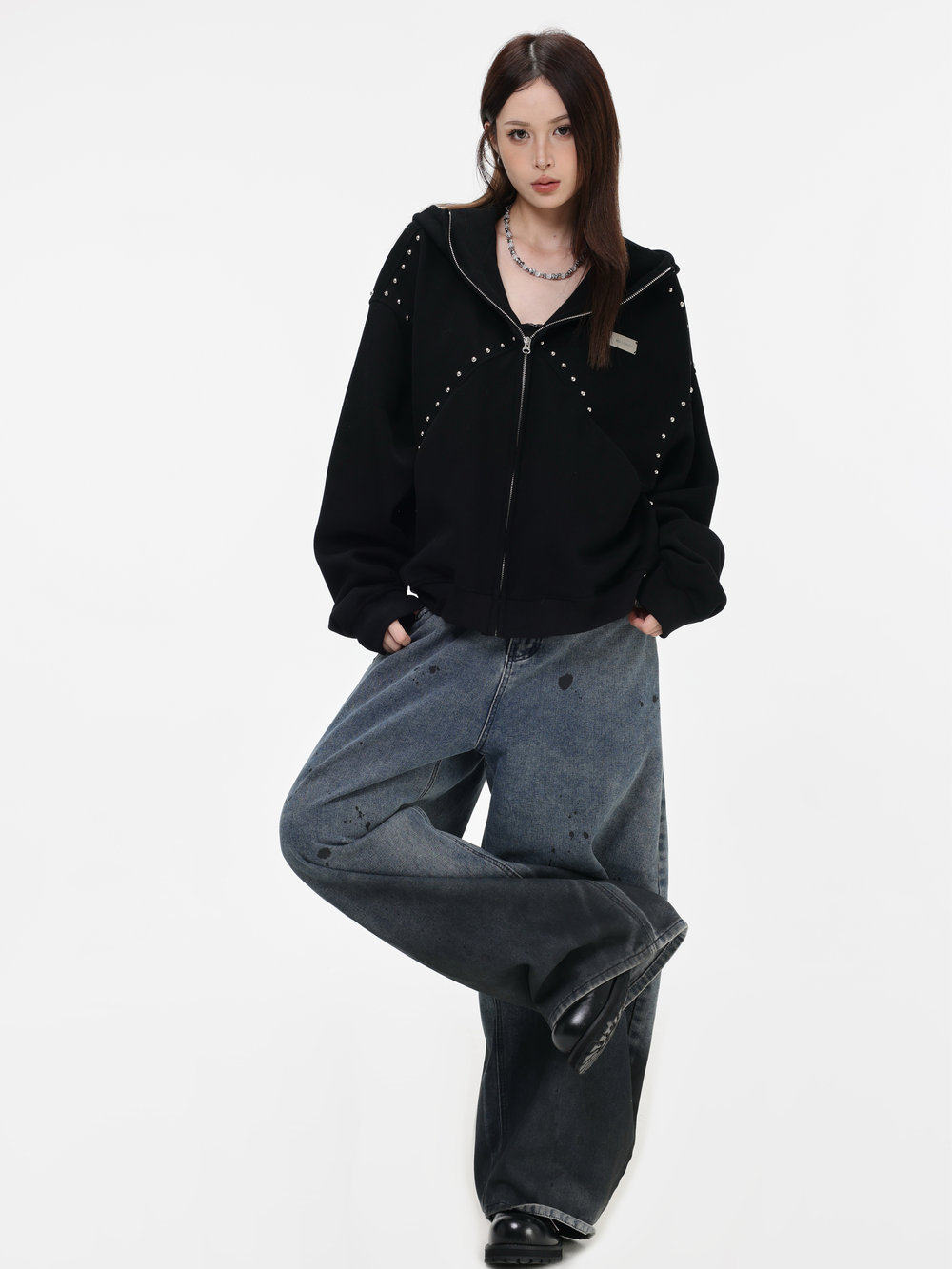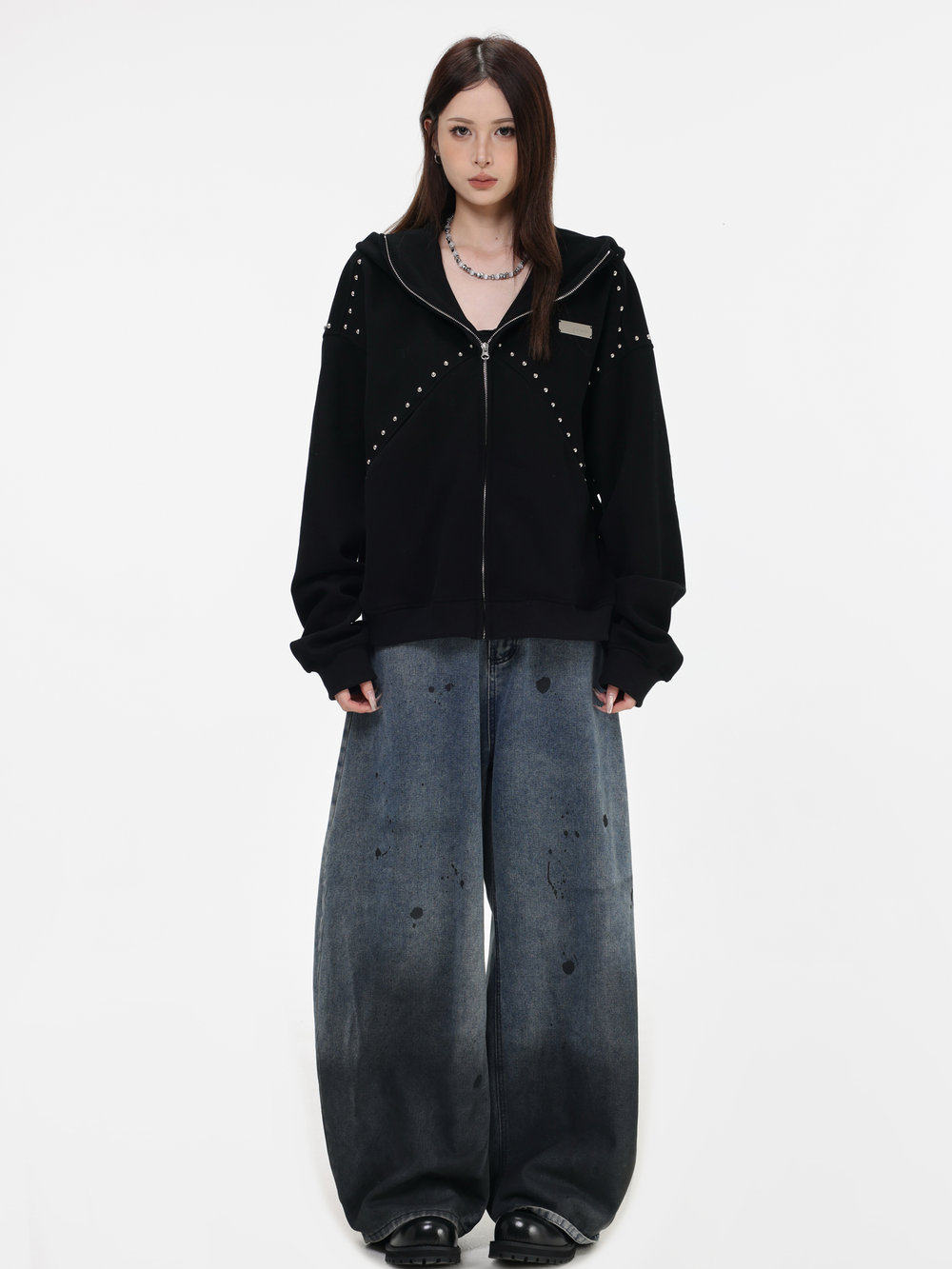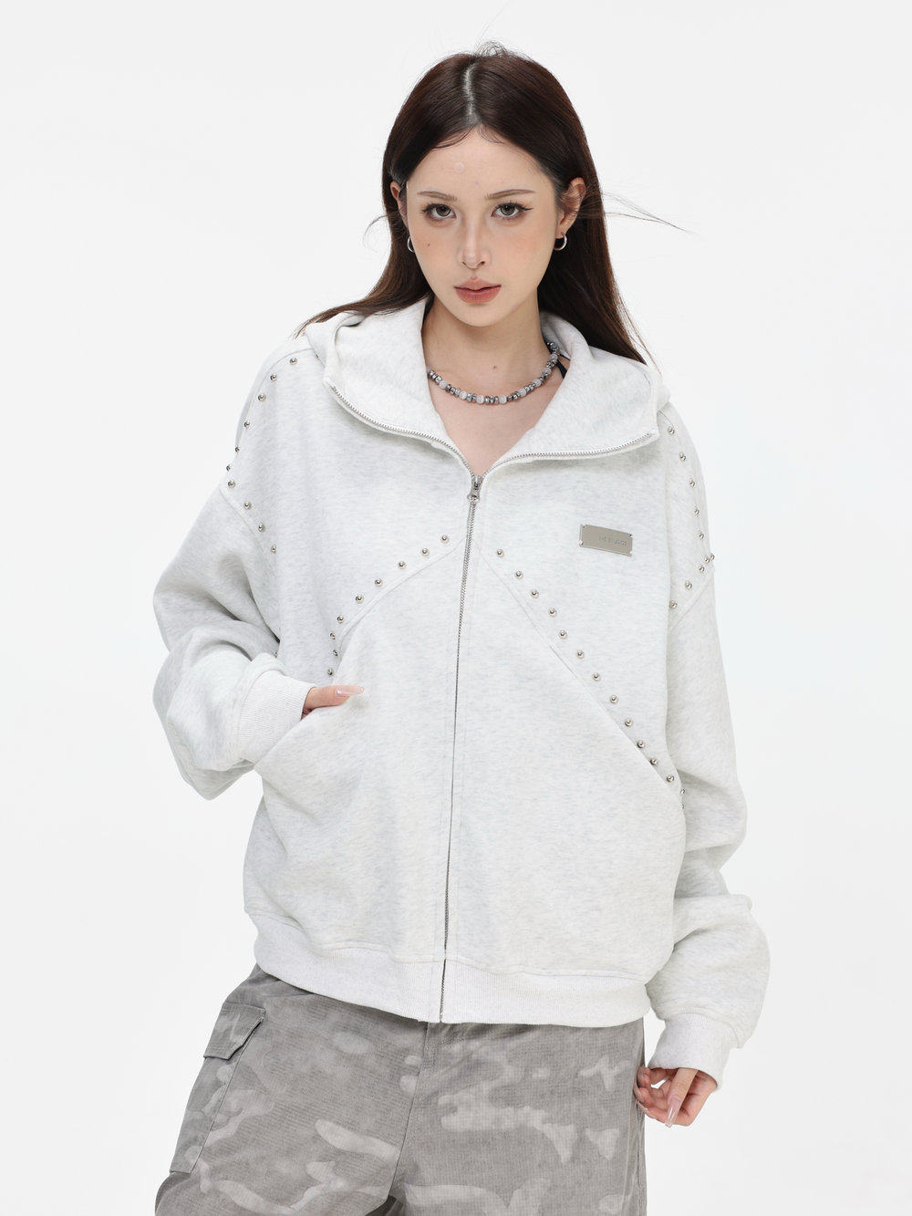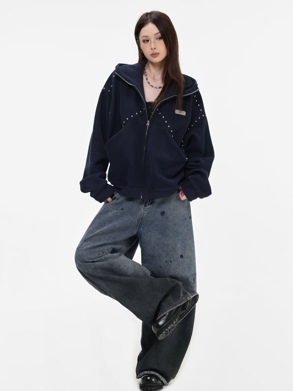 【INSKR】國潮情侶美式「拼接鉚釘拉鍊衛衣」寬鬆連帽開衫外套男