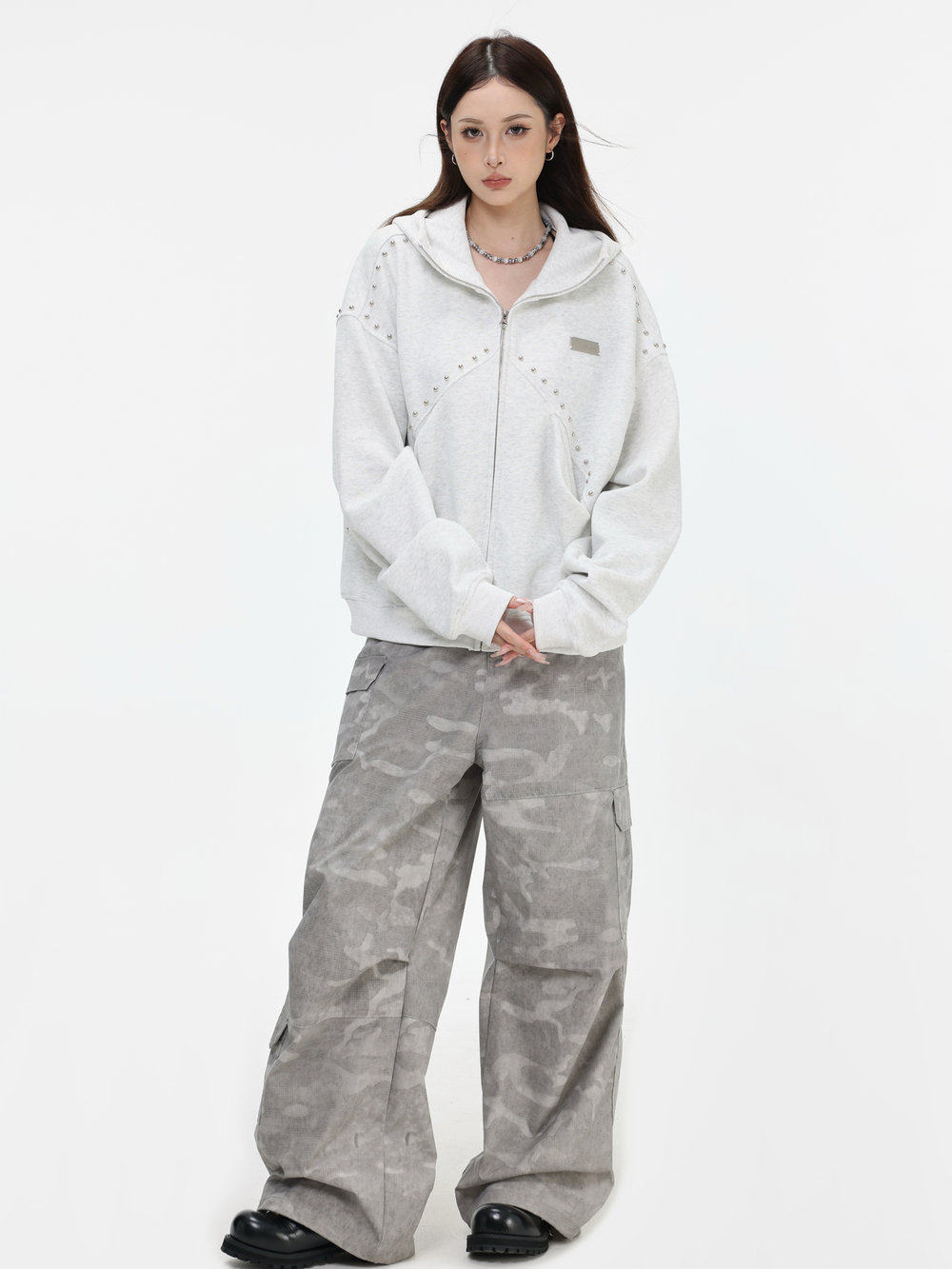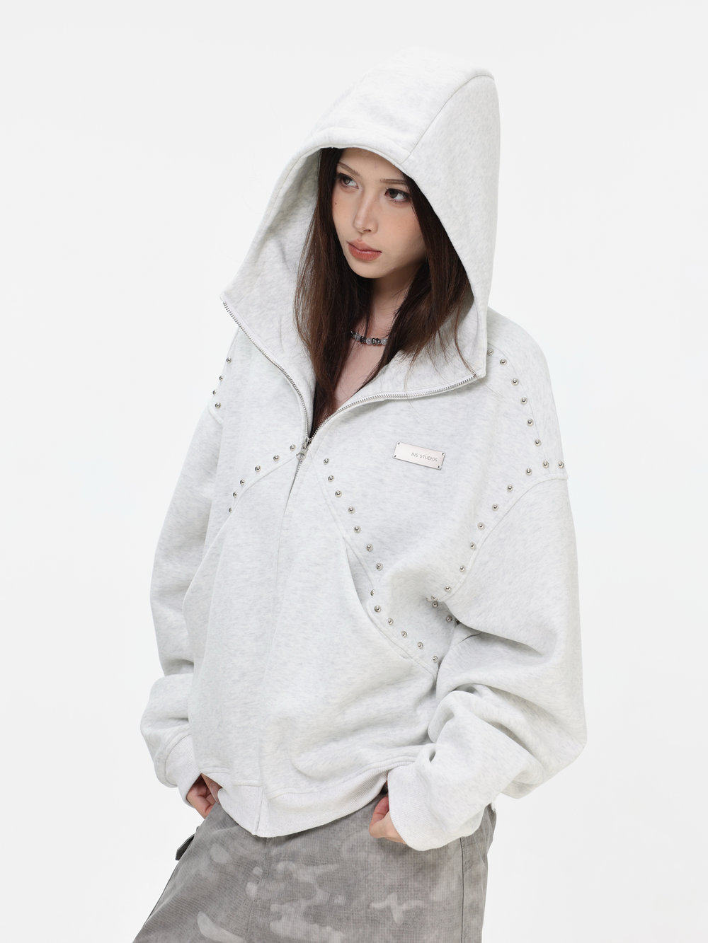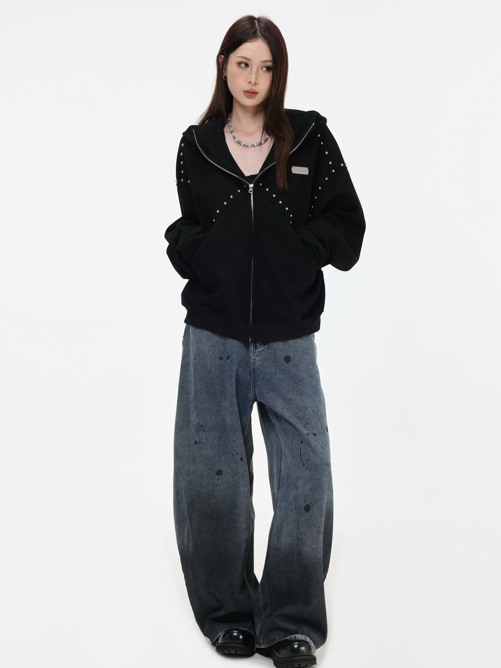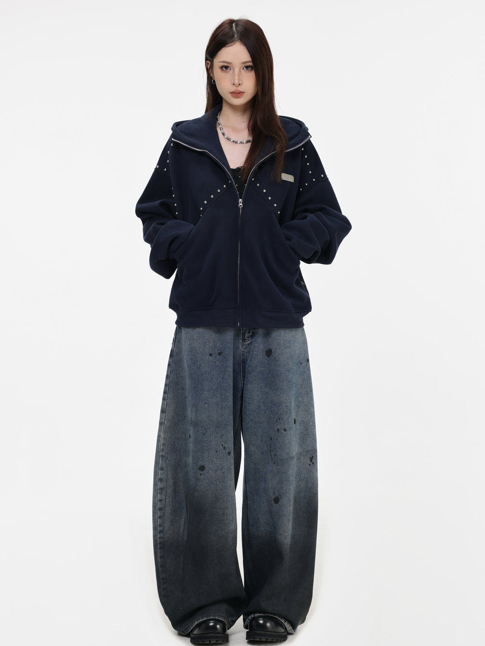 【INSKR】國潮情侶美式「拼接鉚釘拉鍊衛衣」寬鬆連帽開衫外套男