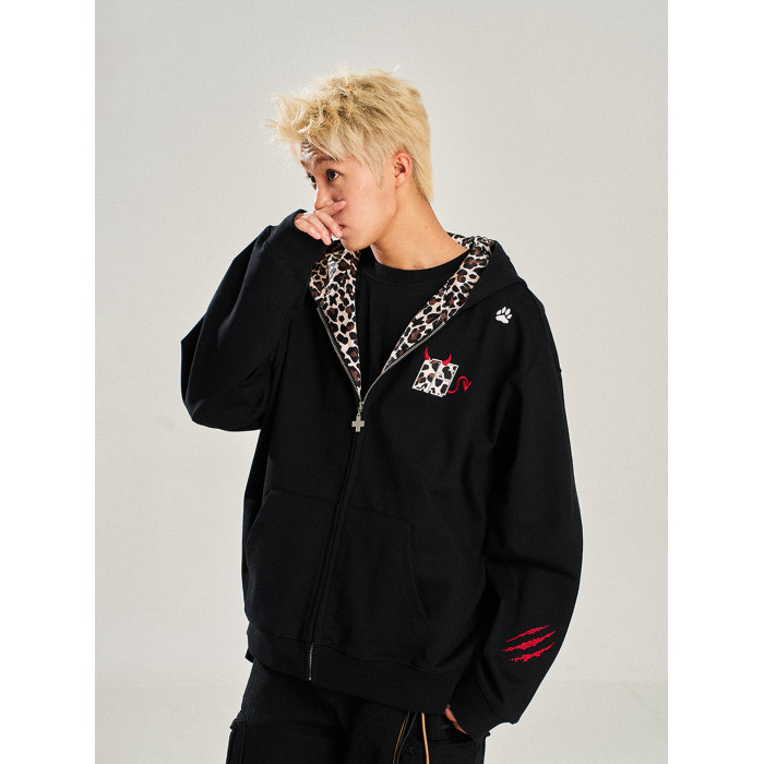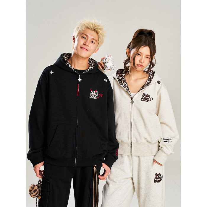 NSTNEW START髮芽計劃小惡魔豹紋拉鍊外套美式男女情侶連帽衛衣潮