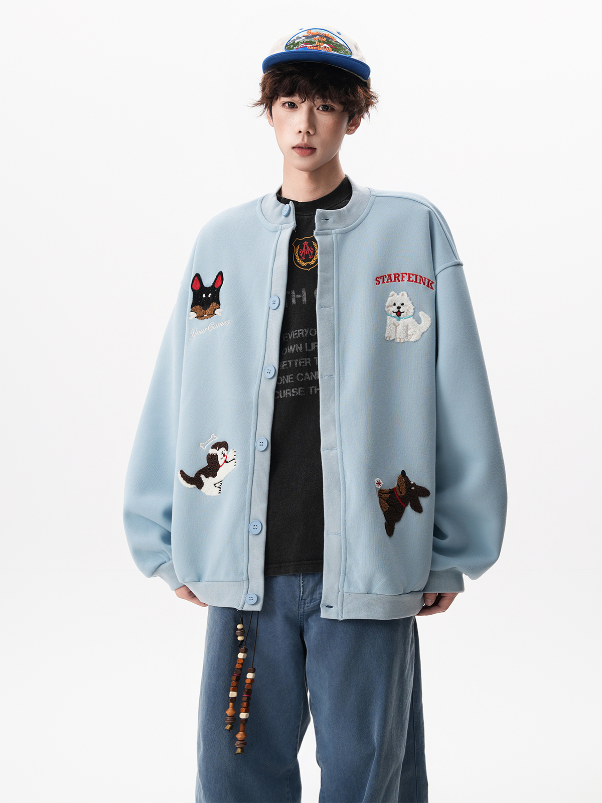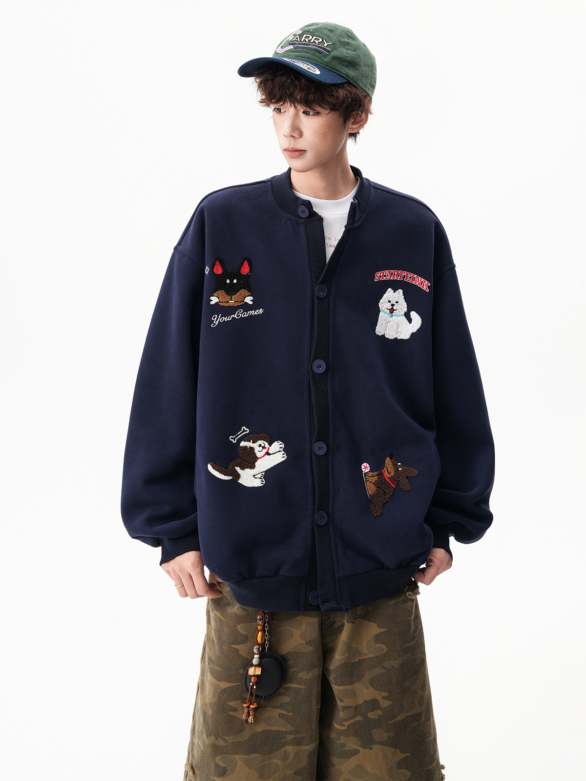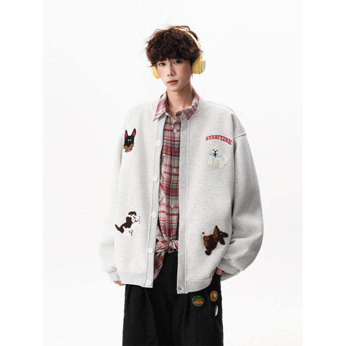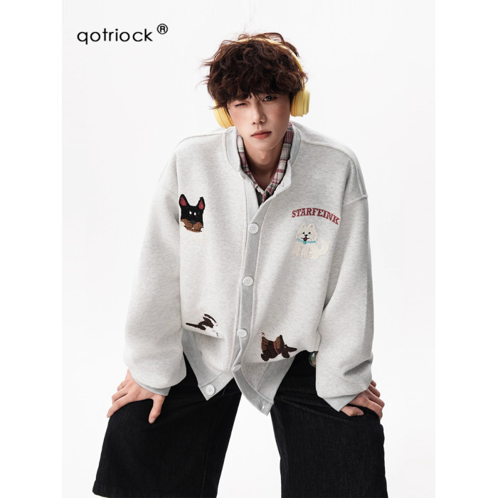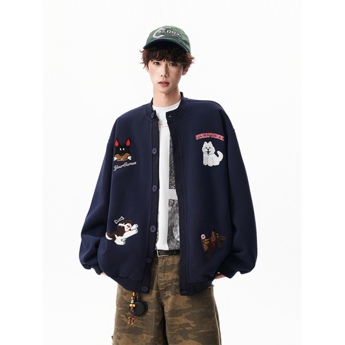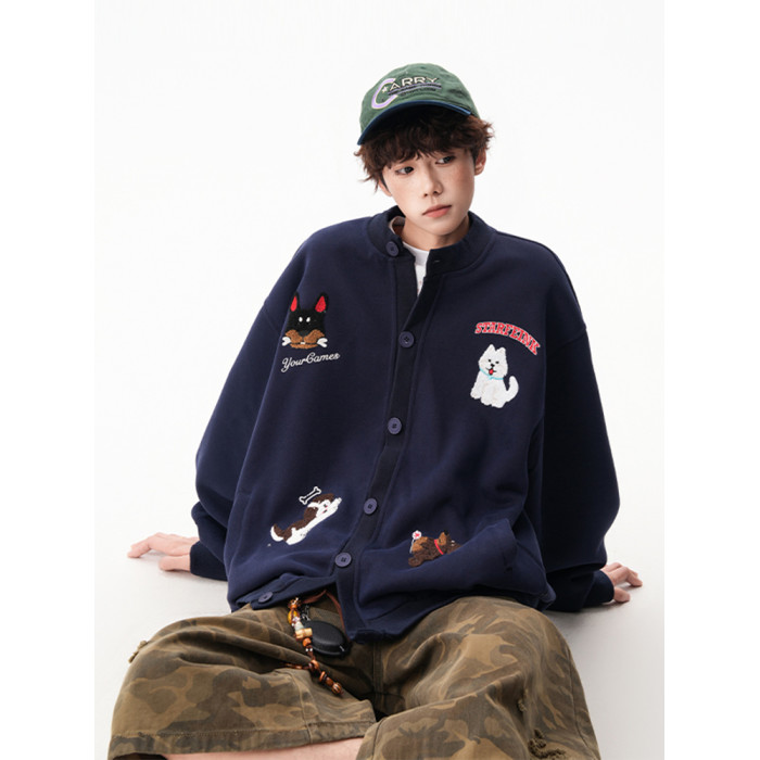 美式趣味毛巾綉慵懶衛衣開衫男秋季加絨加厚情侶外套寬松棒球服潮