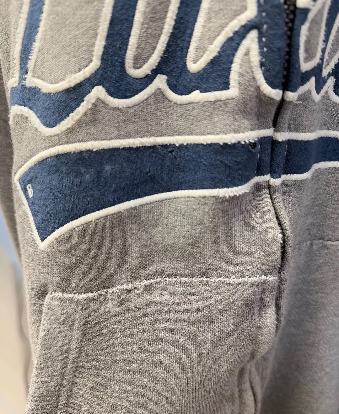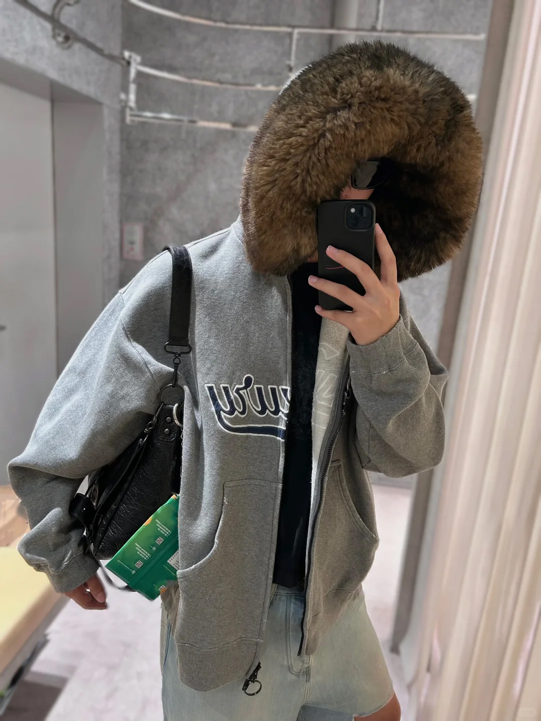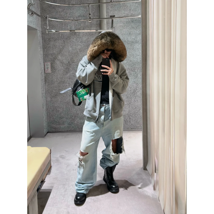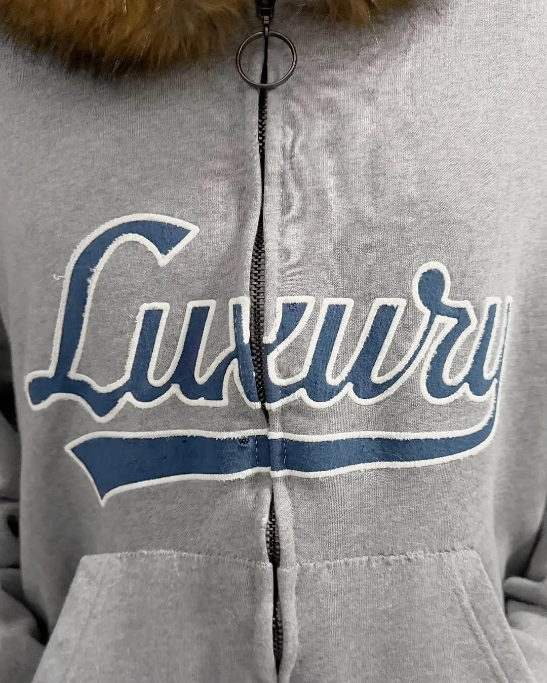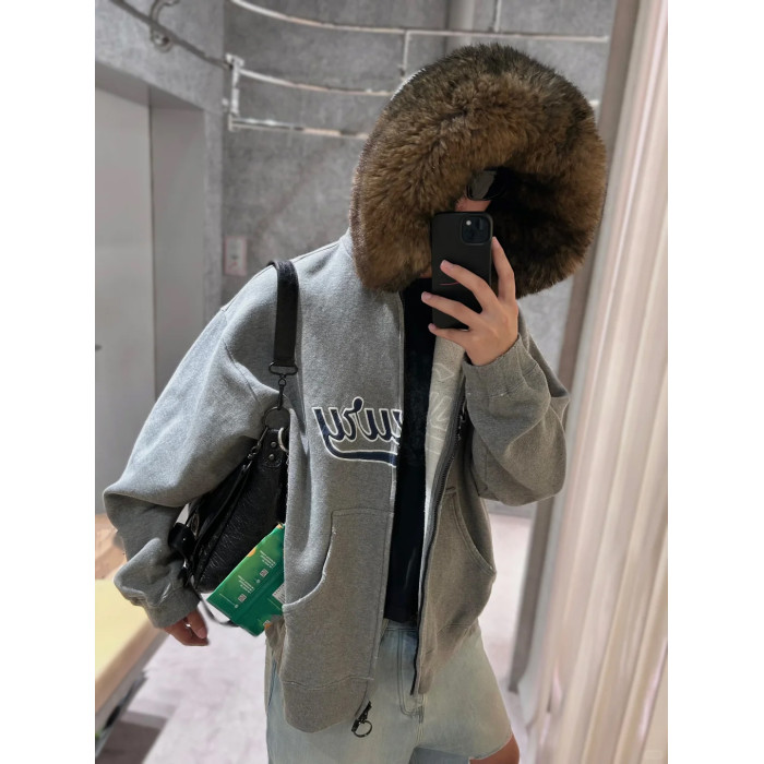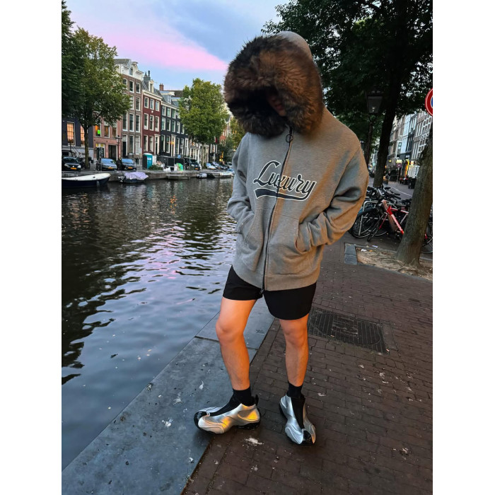 Luxury Script廓形深花灰色刺綉毛領連帽拉鍊衛衣Hooide
